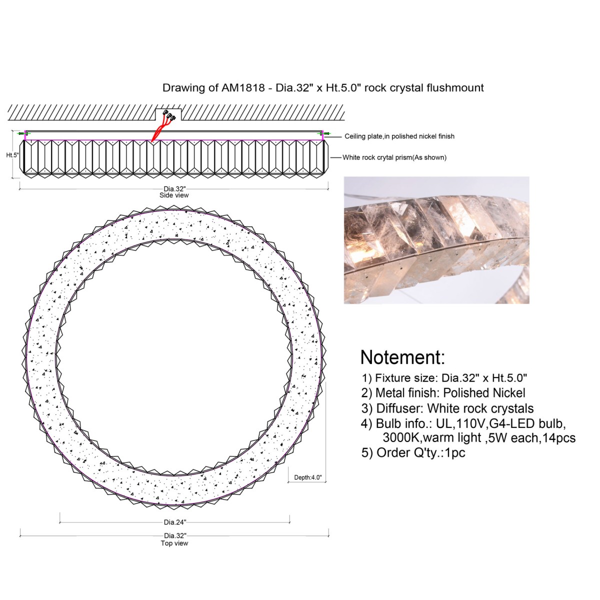 | Overall | 25” Diameter x 3.5” Height with extension 12 feet long steel cables (Custom sizes also available!) |