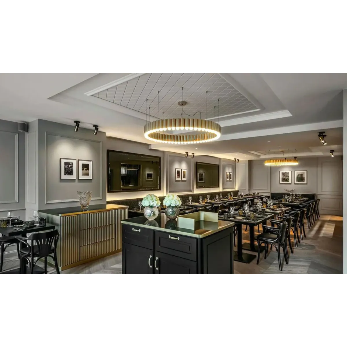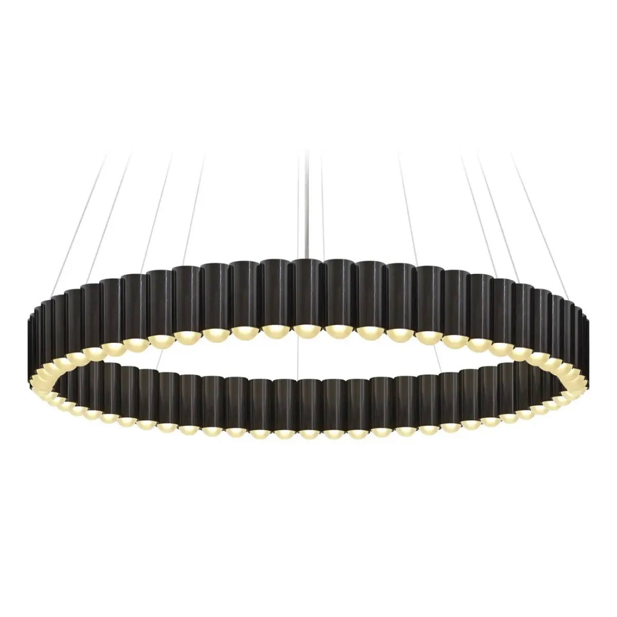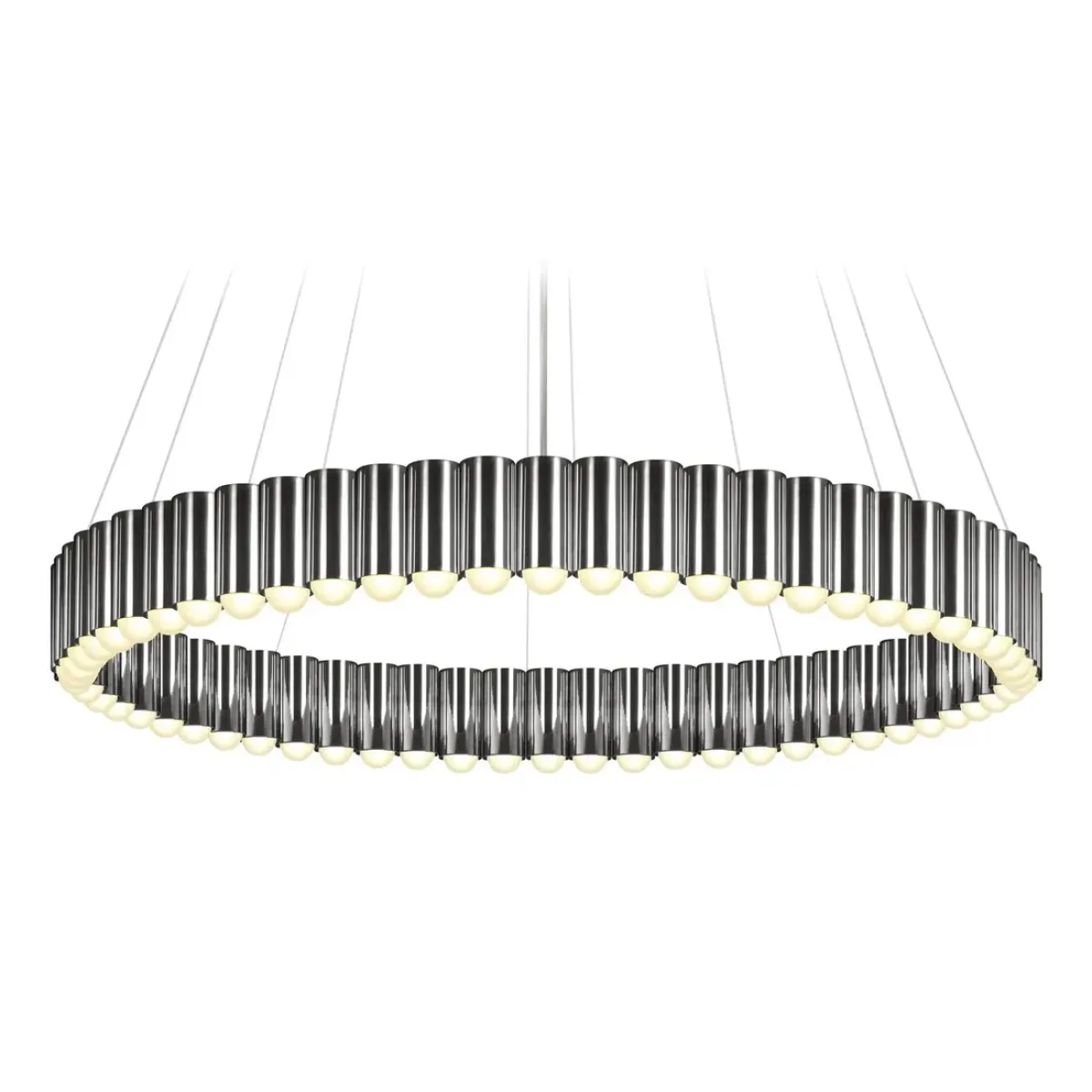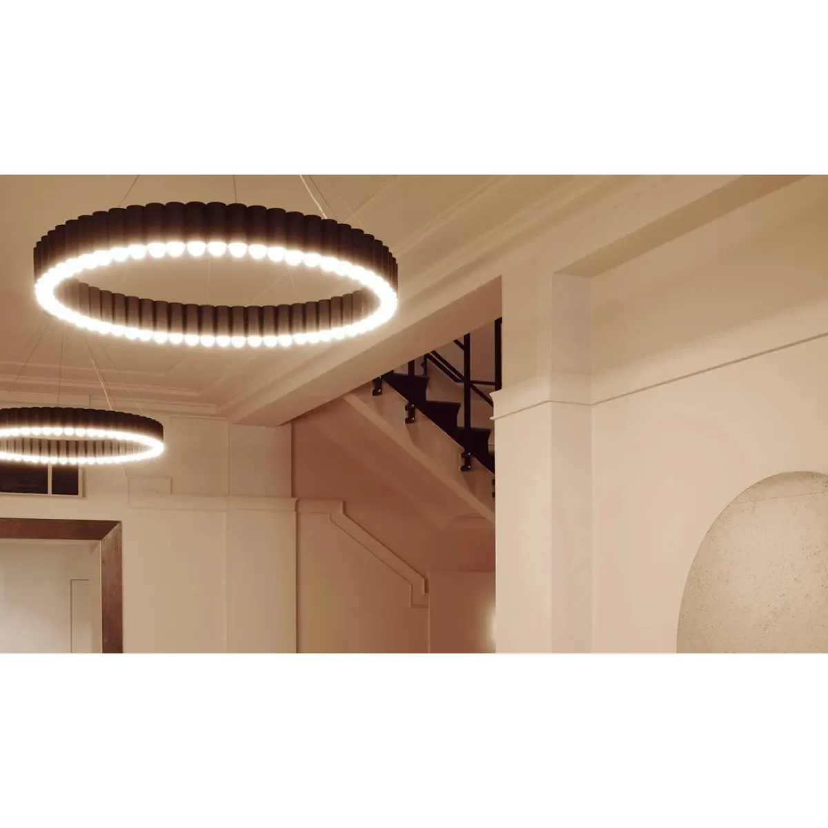 Inspired by the merry-go-round ride of a traditional British fairground, Carousel is a pendant light with a heavyweight presence that floats gently in space. Cylinders of gunmetal, gold, chrome or black, each one housing an inset LED lighting element resulting in a spectacular yet playful ring of light. Carousel is suspended from a matching finish ceiling plate by steel tensile wires with a single clear cable. Attract attention, provoke emotion to the imagination with games of light and matter. Such as the ambition and the creative spark of the “CAROUSEL XL” style. This hanging light sculpture looks interesting from any angle and makes nice shadows. At Alan Mizrahi Lighting Design, we especially emphasize exclusive creations, made by designers at home and abroad. No mass products, but one by one characteristic designs that offer you the possibility to add your own unique touch to your interior. Amazing lightning effects are able to change any space and to turn it into some unique place with a magical atmosphere.