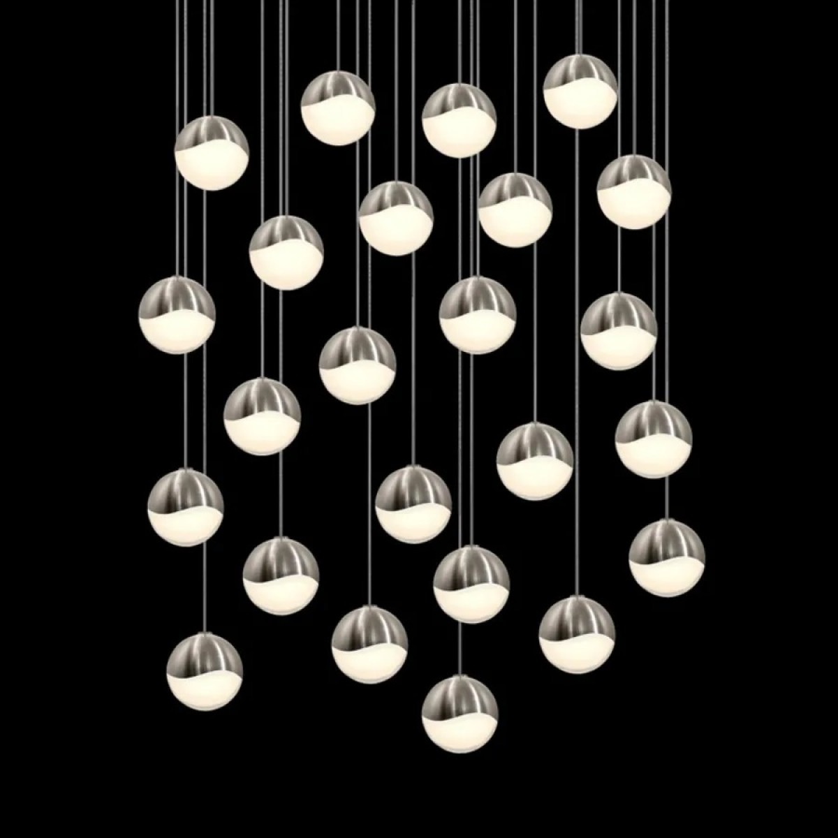 Sculptural Light, Infinite Possibilities. The KA1922 Grapes Suspended Light features a constellation of luminous LED glass spheres in varying sizes, arranged in precise or organic clusters to create a sculptural and atmospheric glow. From above, the glass appears subtly illuminated; from below, its faceted surfaces come alive, refracting light into dazzling radiance. Each sphere is anchored by a metal hemisphere with an infinity wave design, through which the LED light is elegantly projected. Inspired by nature and modern minimalism, Grapes transforms spaces—from intimate rooms to grand interiors—with light that captivates, stirs emotion, and engages the imagination. A true fusion of design and light, this fixture invites creative expression with limitless configuration options.