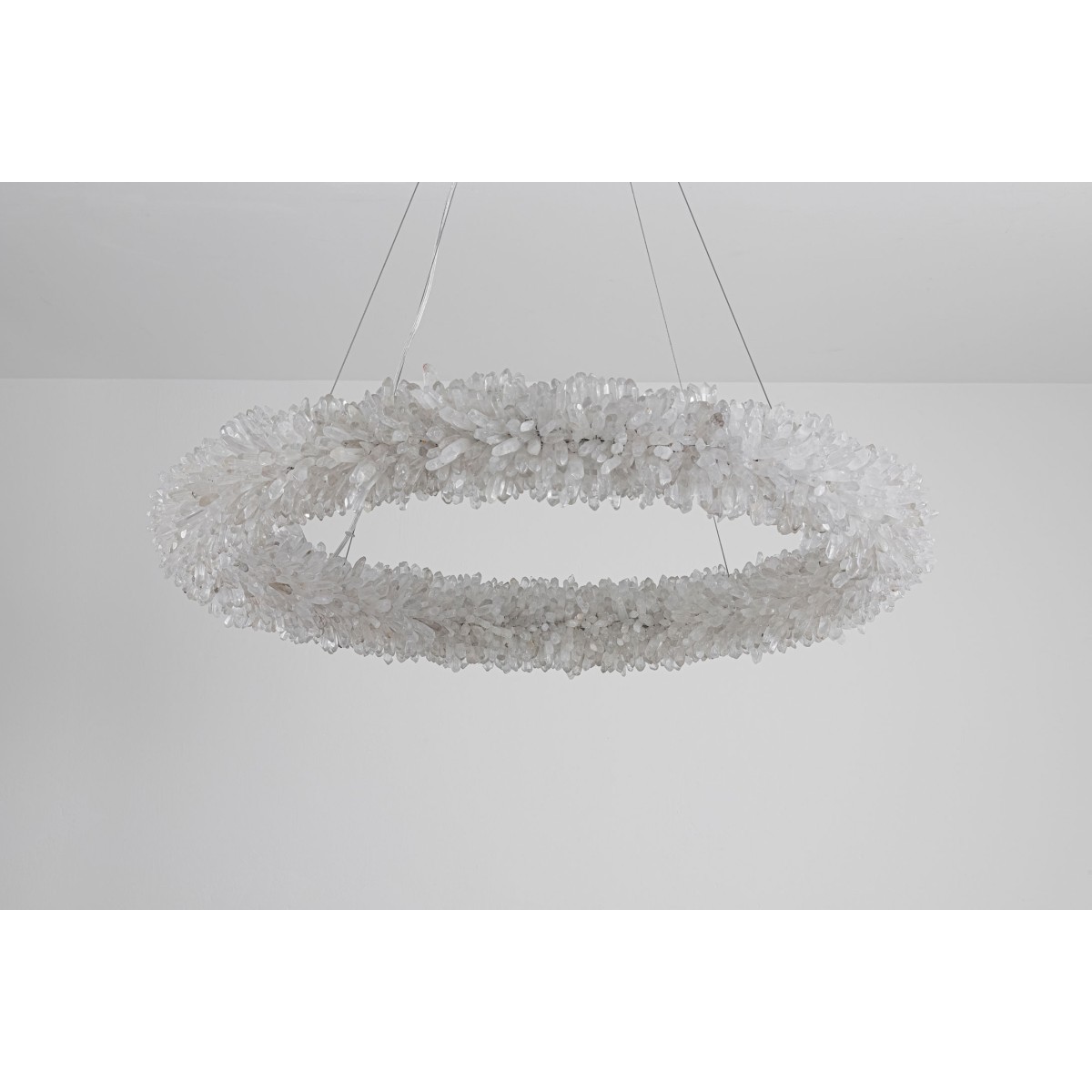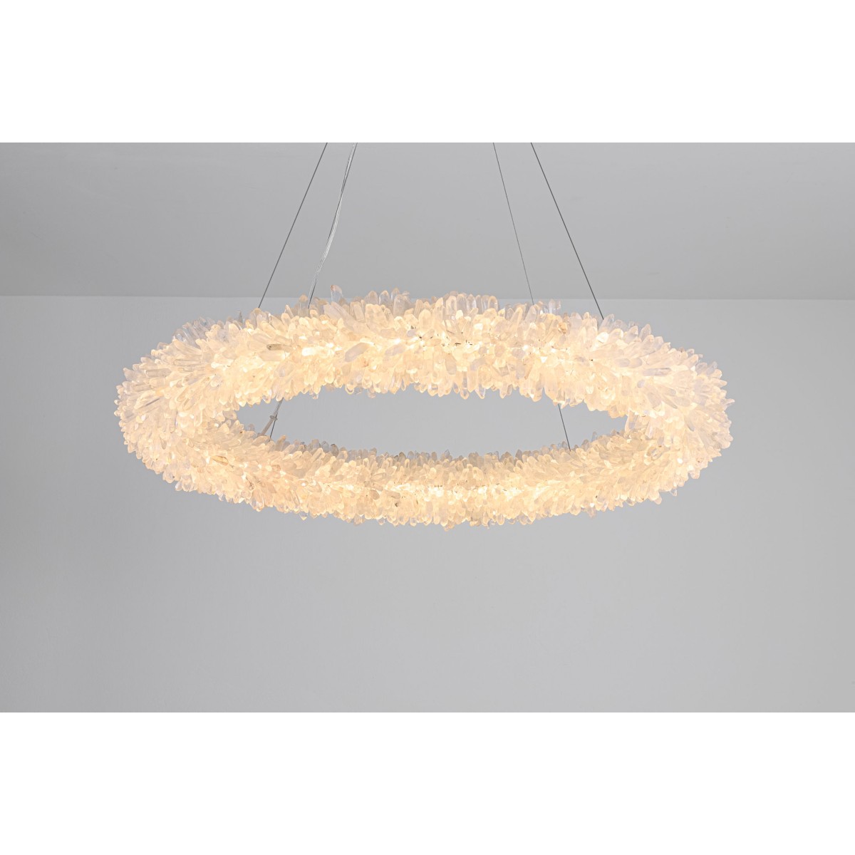 The ancient Greeks gave to mortals what was reserved for the gods, “fire”. Here, a simple yet elegant construction creates a timeless light – a ring of ‘flames’. With the gift of fire, Prometheus allowed humanity to develop… Simple yet elegant construction with warm white LED, natural uncut Brazilian rock quartz rock crystals points create a halo of texture and shadow. Greek philosophy’s quest was to distill all things to their essence, their most elemental. Whether in Euclid’s elements of geometry or Democritus’ first concept of the atom, Greek thought explored the possibilities of nature’s abstracted and universal essence. Naturally occurring quartz crystals appear to have grown by Mother Nature, and lit themselves from the inside, illustrating an exploration of pure natural expression.