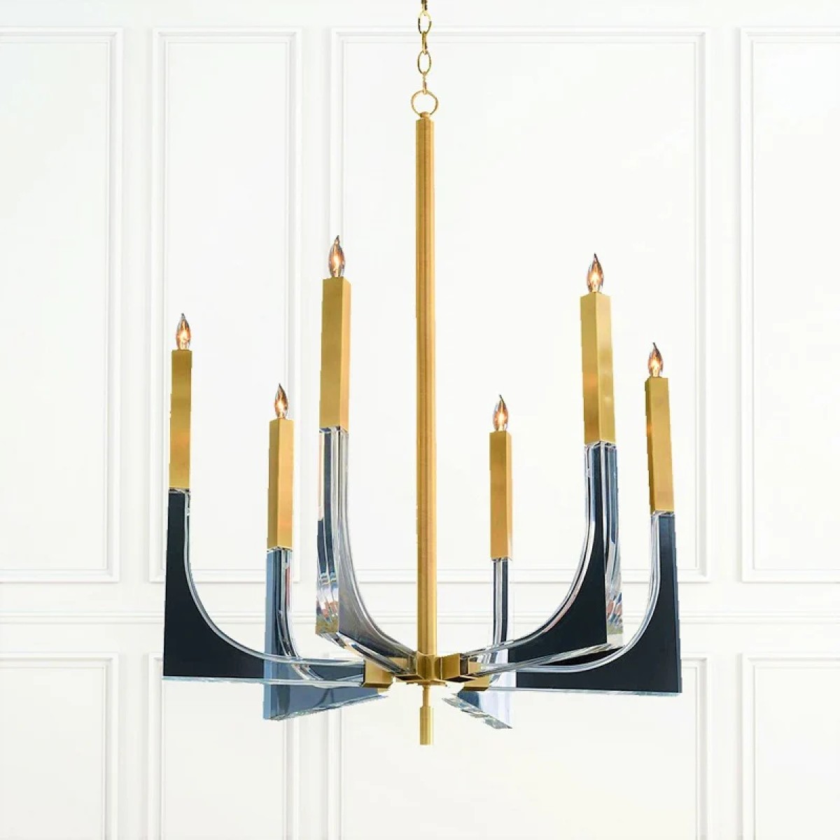 Acrylic and Brass Six-Light Chandelier Classic form meets graphic modern design in this acrylic and antique brass, six-light chandelier. Antique Brass Finish Canopy: 6\", Chain: 10' MM. The key to an elegant, opulent, bespoke design is understanding the aspirations of the client, the relevance of location and through maximizing the potential of existing elements of the space.