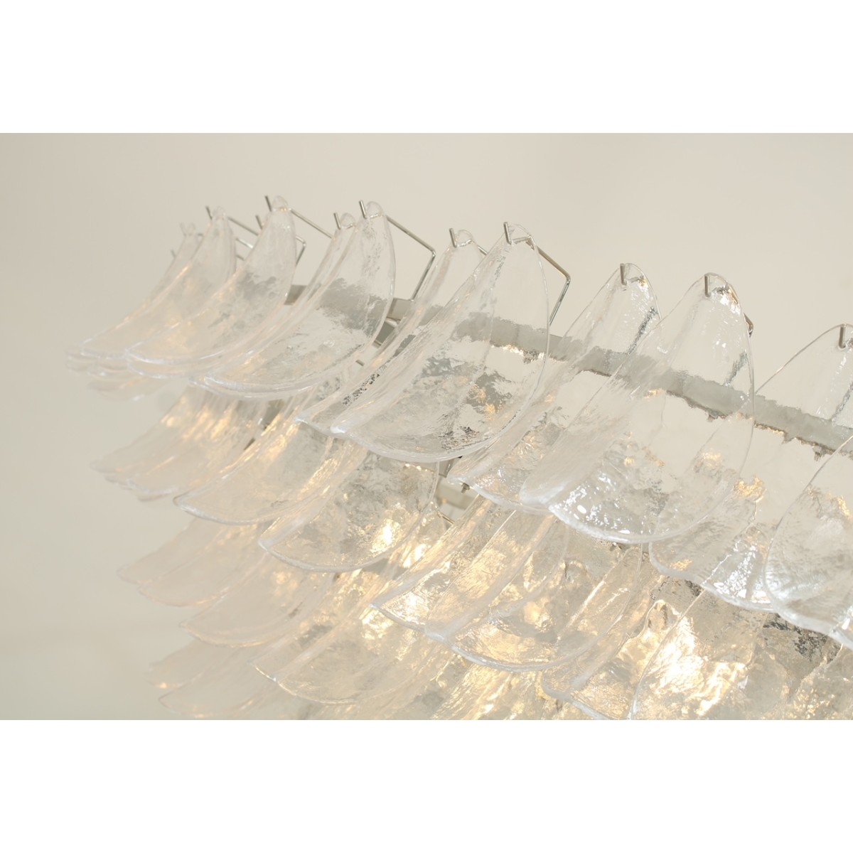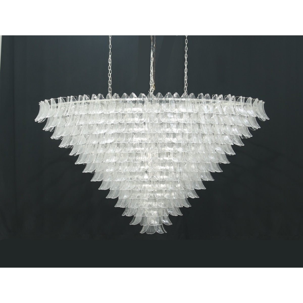 This refined and sophisticated chandelier was realized in Murano, Italy-the islands off the coast of Venice renowned for centuries for their superlative quality glass production. It offers an abundance of hand blown Murano glass shades in a Topaz gray hue-resembling abstracted feathers with tented centers and sinuously curved sides-descending from an oil rubbed bronze frame. The feathers are arranged in an overlapping pattern-that largely conceal the frame beneath- and hung in four tiers, creating a structure that is sculptural, dynamic and aesthetically captivating. With its clean lines, and understated monochromatic palate, this chandelier would be a winning addition to any style of interior from classic Mid-Century Modern to contemporary.