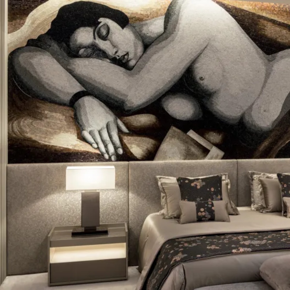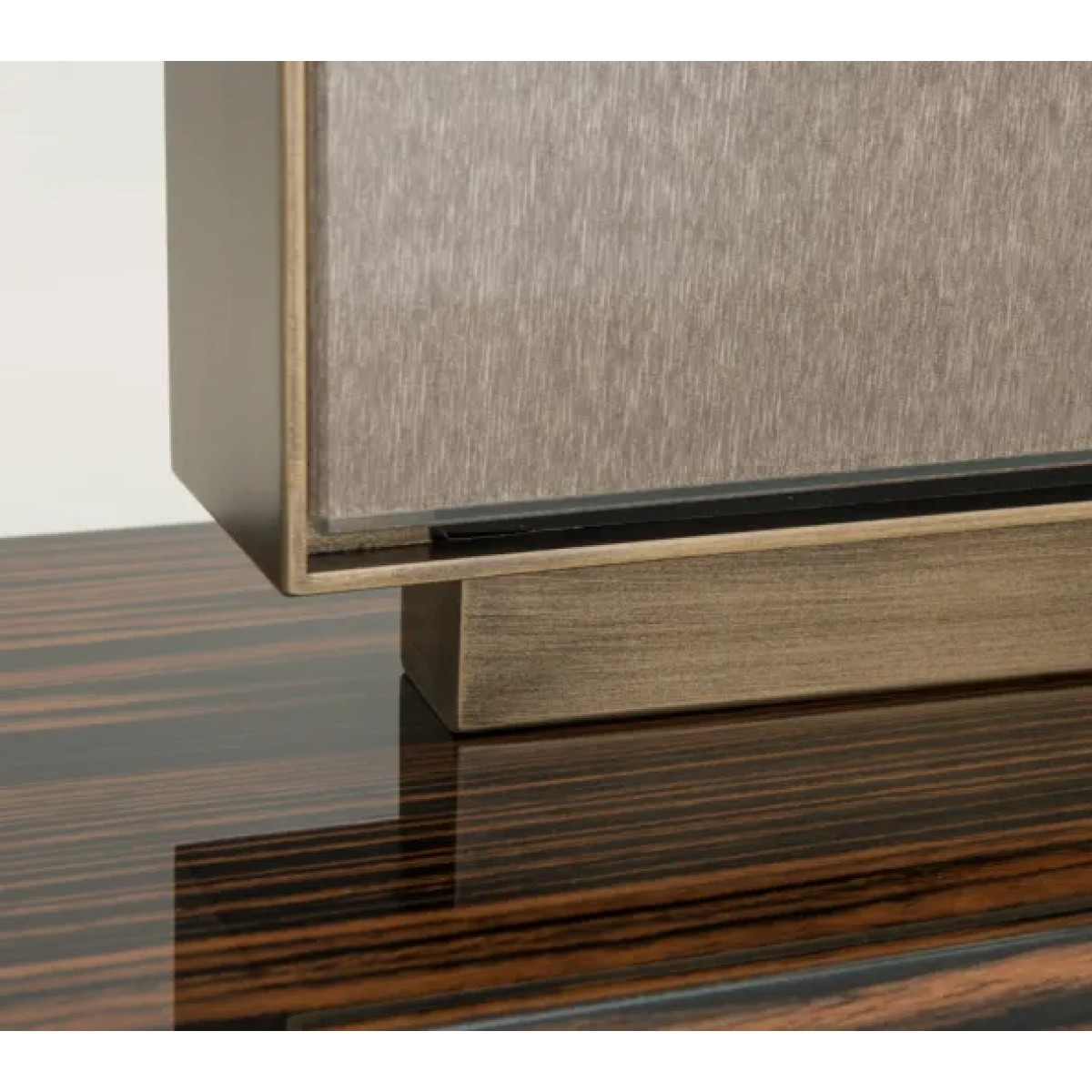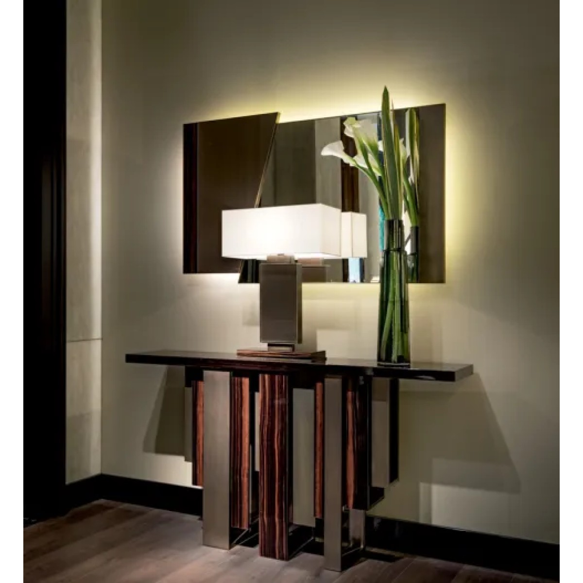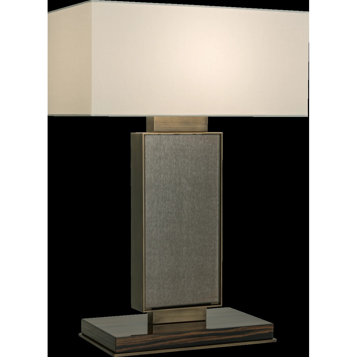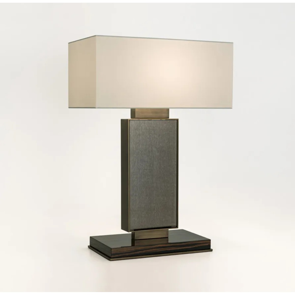 A statement of timeless sophistication, the tellus Table lamp blends clean geometry with luxurious materials. Its structured bronze-finished metal frame (also available in chrome) is accented with refined “vetrite” glass inserts a unique laminated glass tile that adds texture and depth. The base, crafted from rich ebony wood with a high-gloss finish, brings warmth and contrast to the design. Topped with an elegant ivory chinette fabric shade in a classic rectangular shape, this lamp is the perfect accent for refined interiors whether modern, transitional, or art deco inspired. Ideal for use in living rooms, offices, or bedrooms where sophistication meets function.