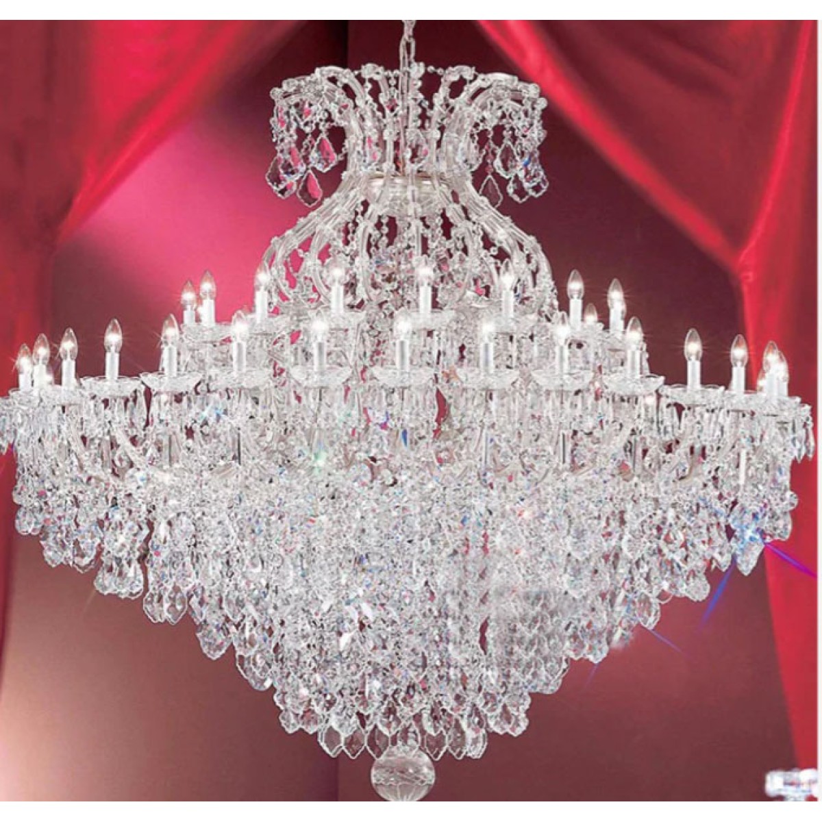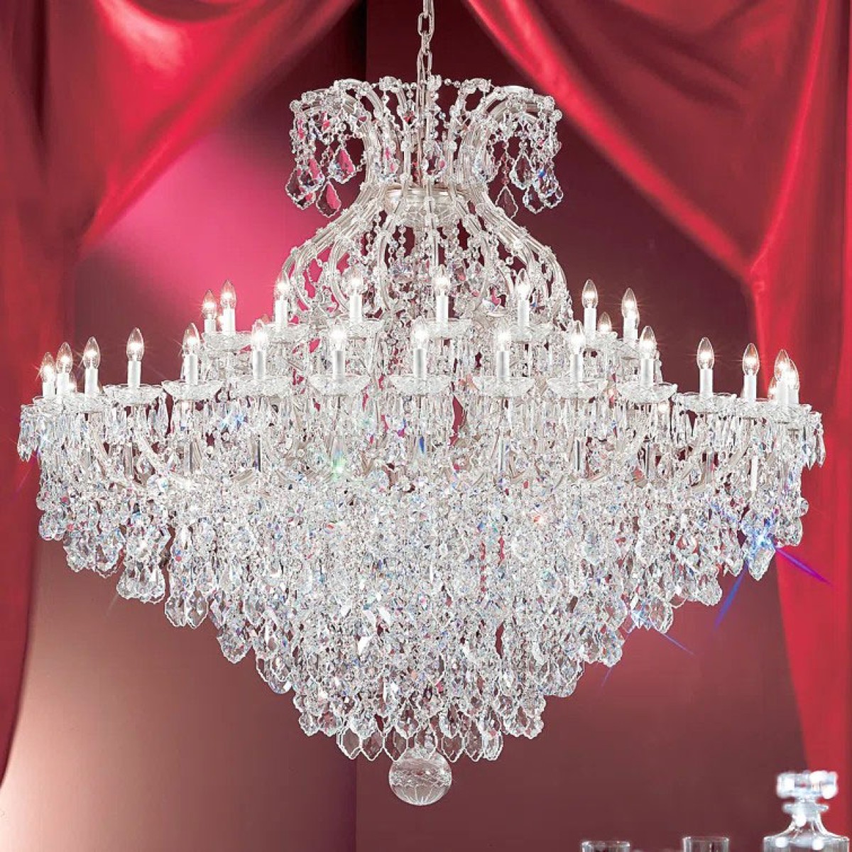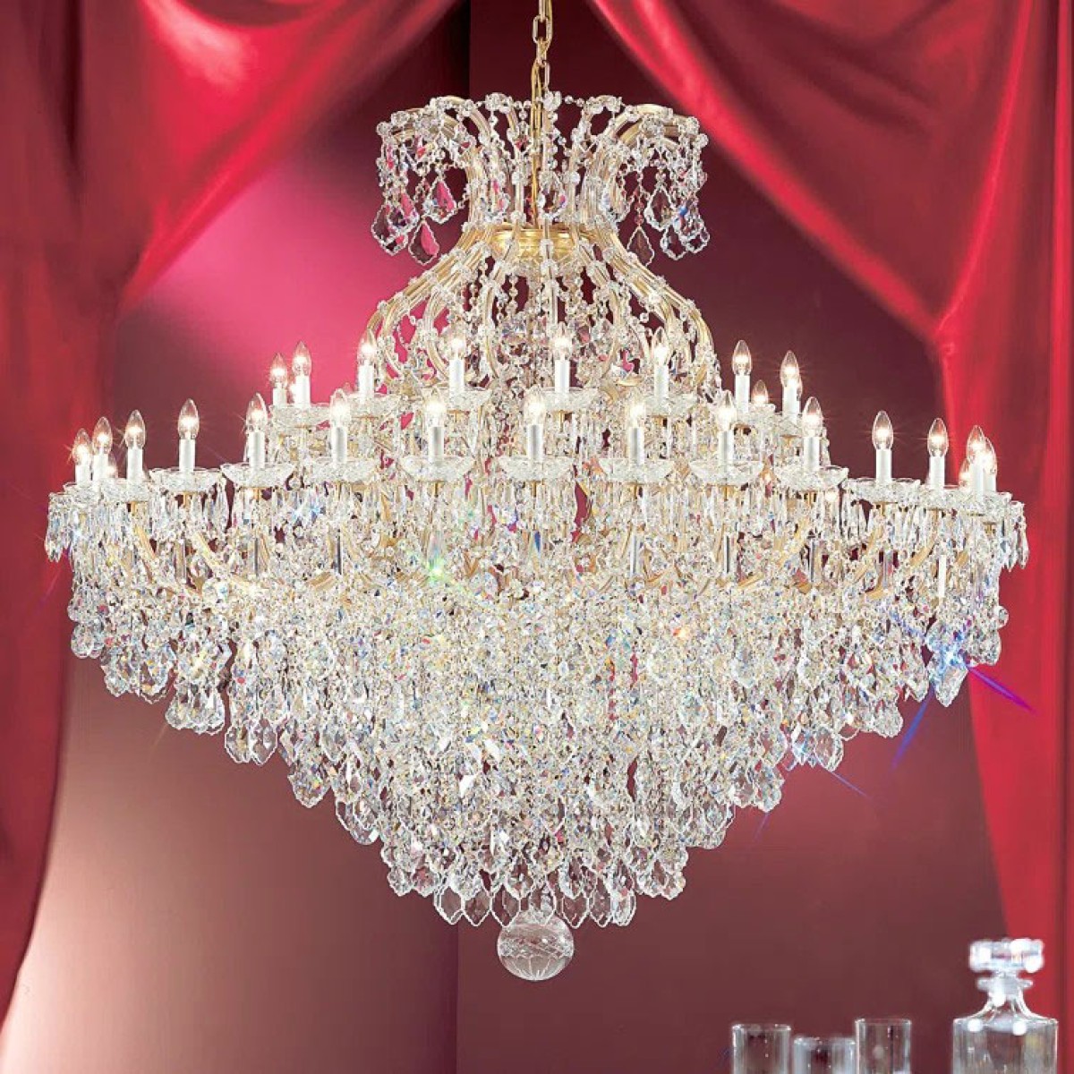 The perfect marriage between old and new! Maria Theresa chandeliers today are a household name. The exquisite style and shape of these chandeliers can be found in royal palaces around the world and the popularity of the Maria Theresa chandeliers is ever-present. We costume made the Maria Theresa chandeliers, traditionally connecting two pieces of glass with decorative flowers and in this way creating the arms of the chandeliers. This is a traditional way of doing things and draws from the times of the inception of these chandeliers when the glassmakers did not yet know how to create hollow arms. Traditional Maria Theresa chandeliers and wall sconces trimmed with today’s highest quality Swarovski Elements,