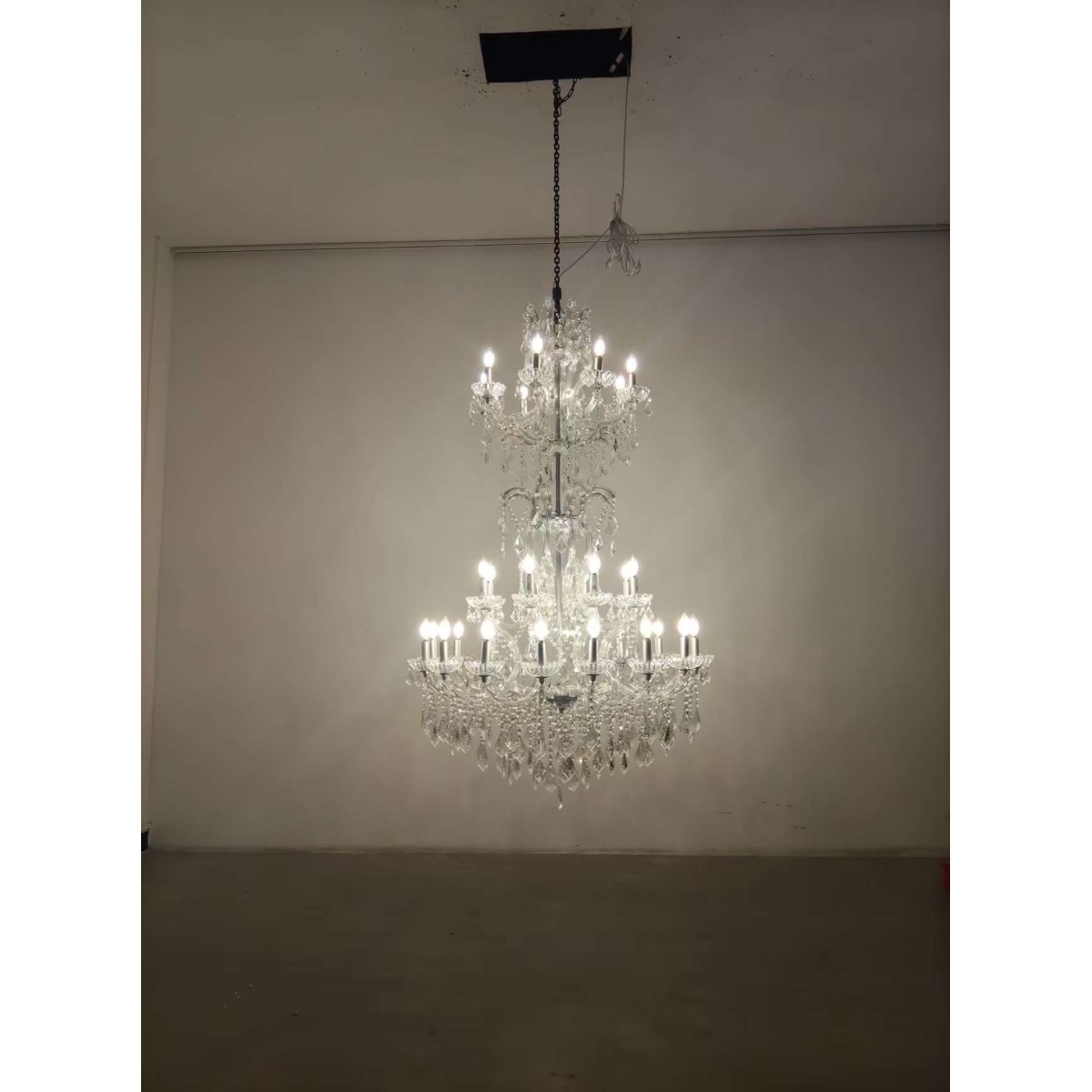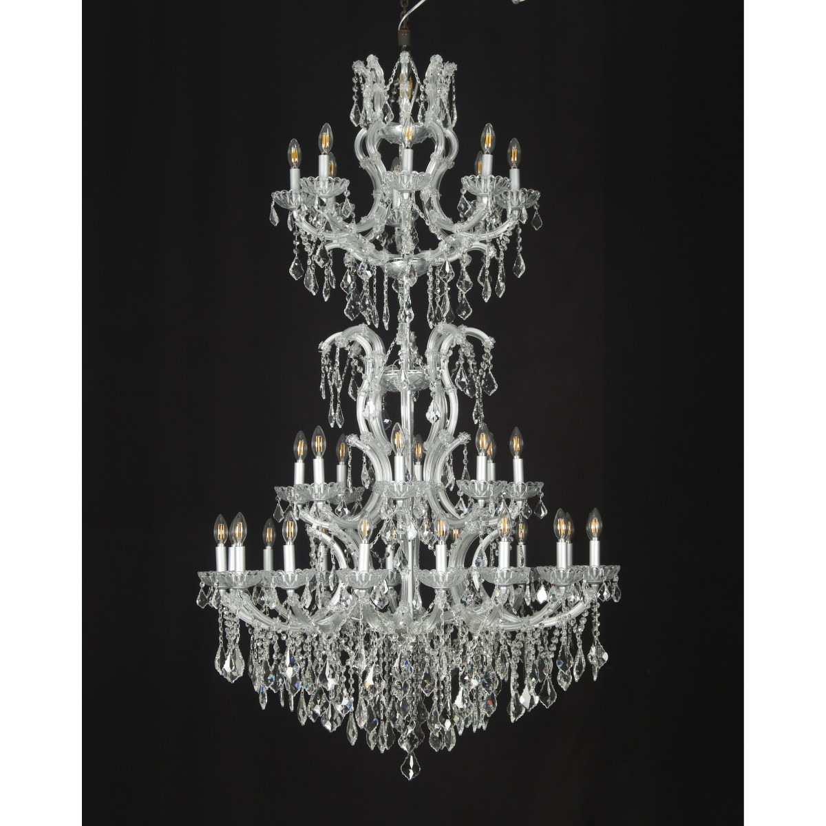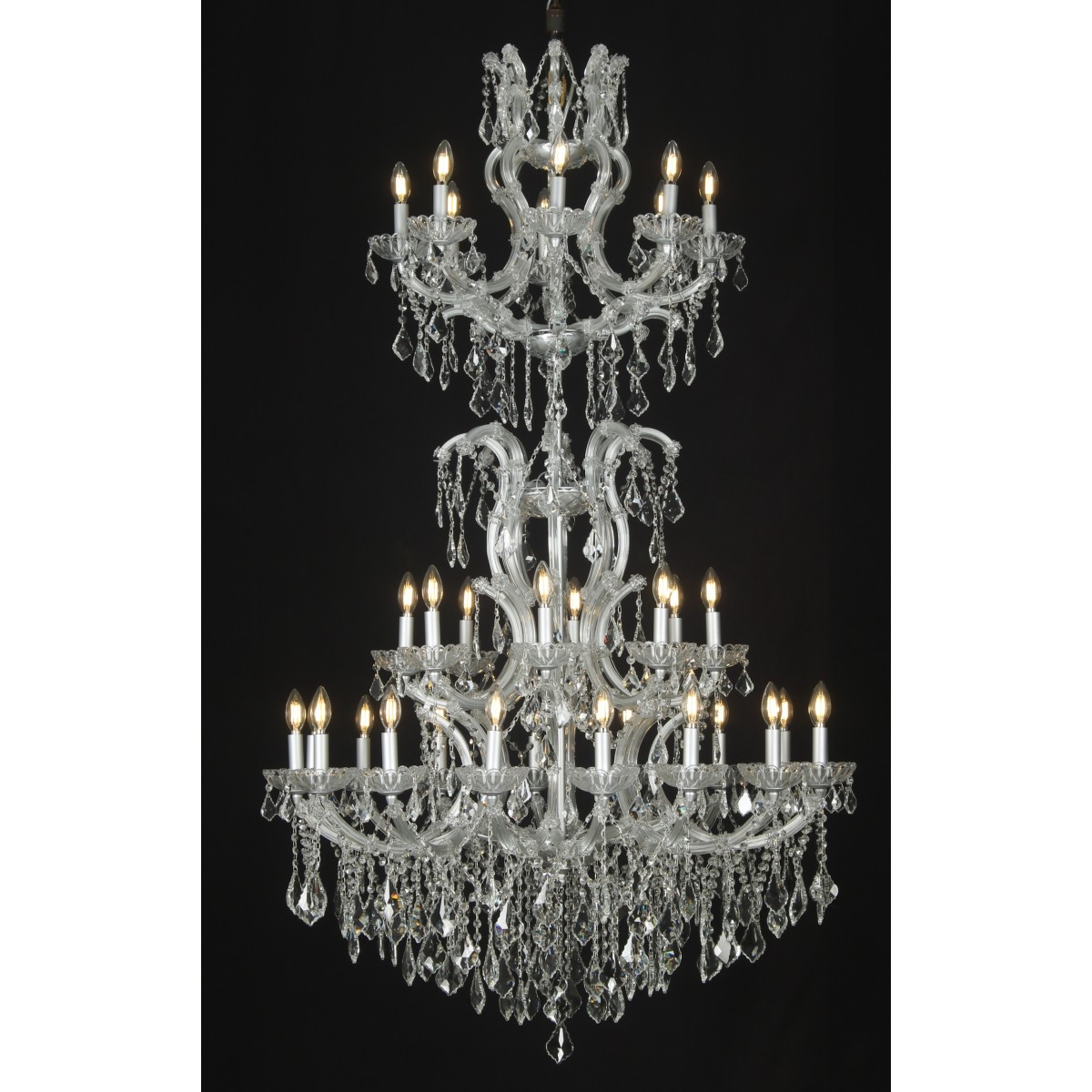 This opulent chandelier showcases a tiered structure with multiple levels of arms that radiate outward in graceful symmetry. Each tier increases in size from top to bottom, creating a cascading effect that draws the eye upward. The metal frame is finished in a soft matte silver, offering a subtle contrast to the brilliance of the clear crystals. Adorned with cut glass crystal droplets, beads, and garlands, the chandelier sparkles intensely when illuminated.