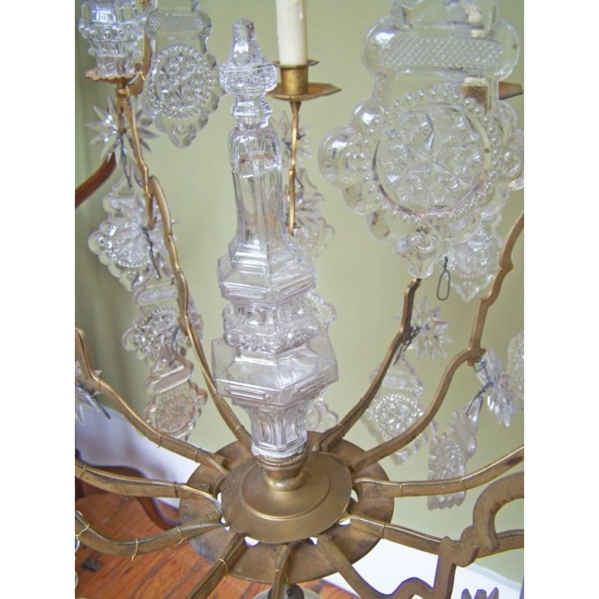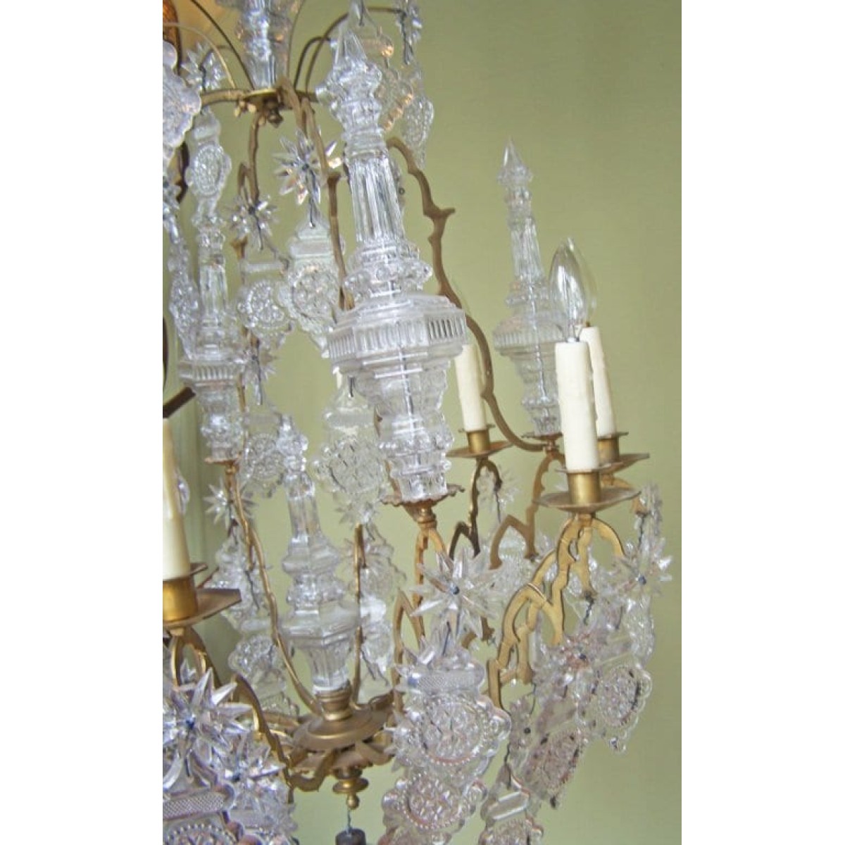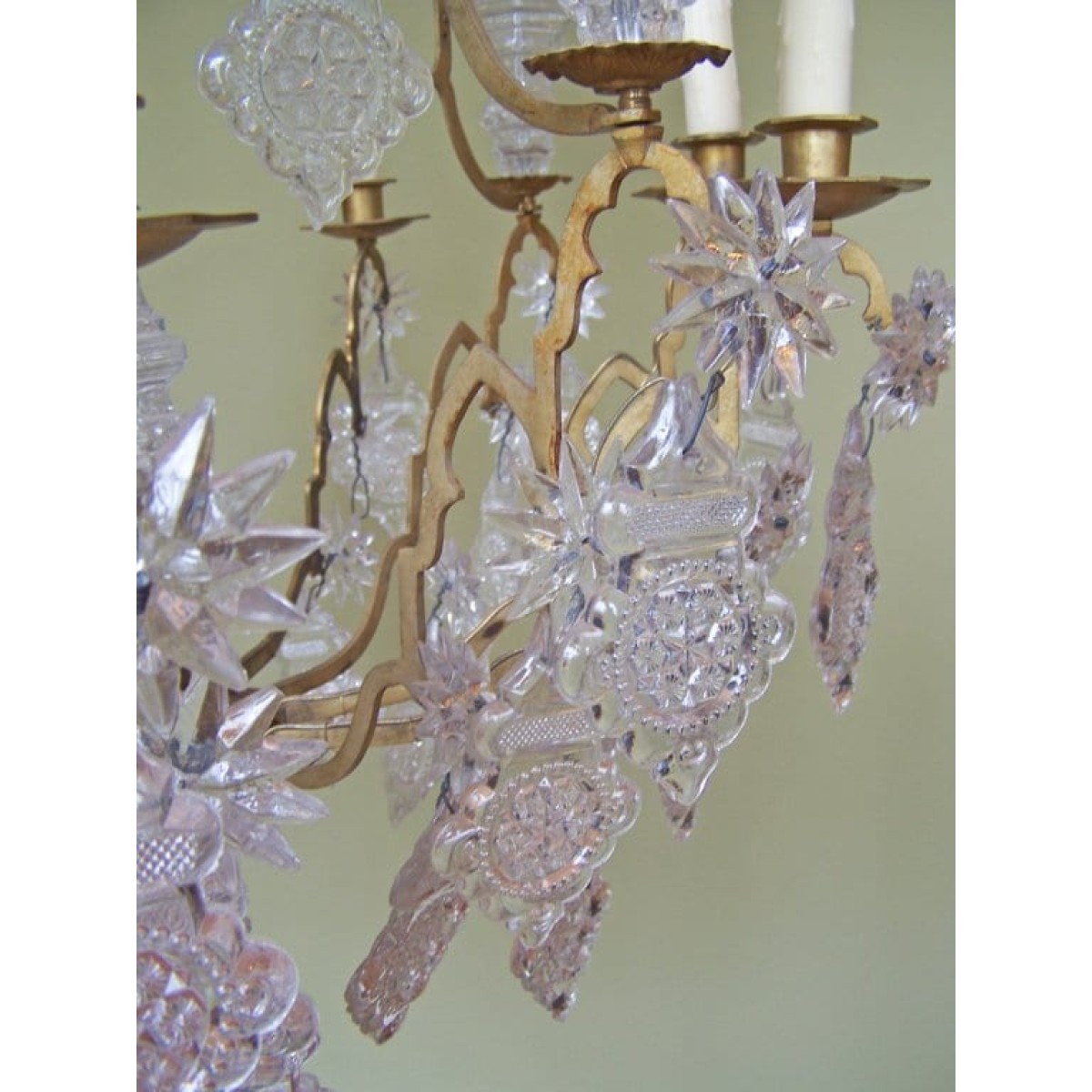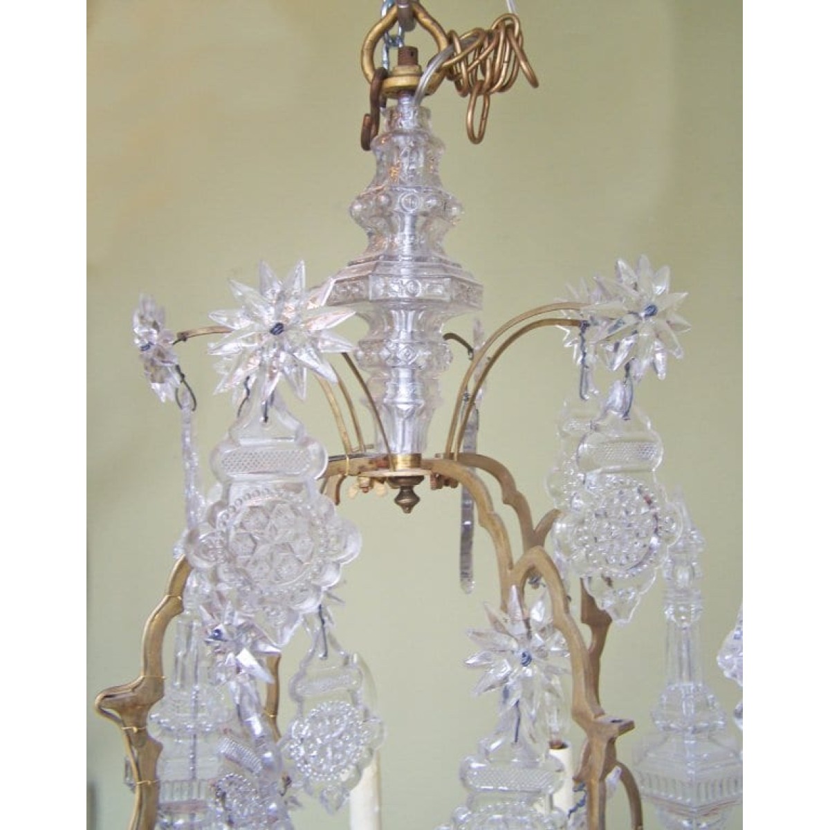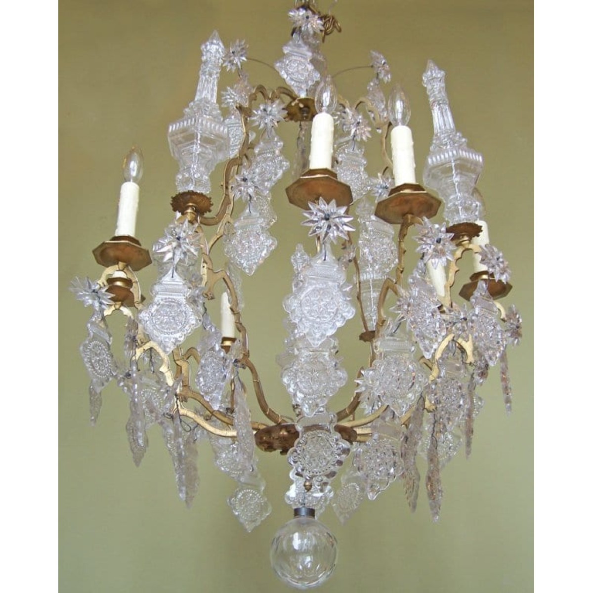 An 18th century eight-light bronze and crystal chandelier with hand molded and cut prisms and blown spears.