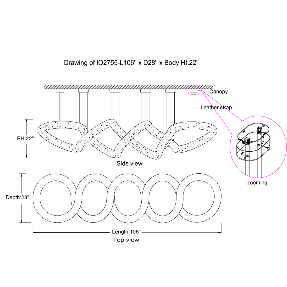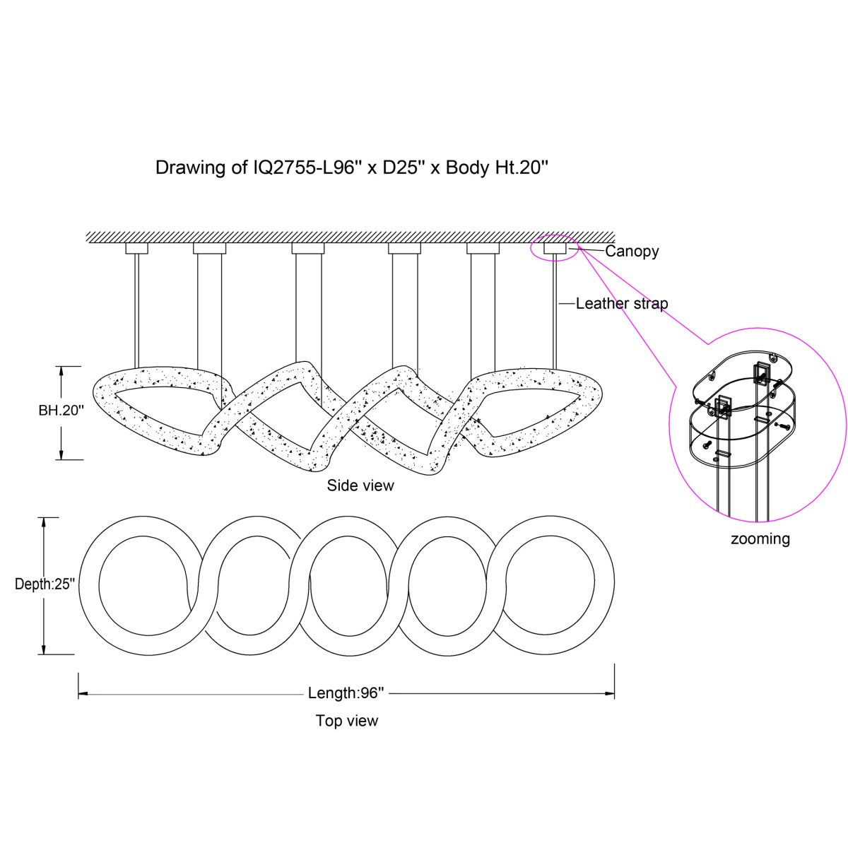 Extension: 100.375" adjustable leather covered stainless steel wire ropes.