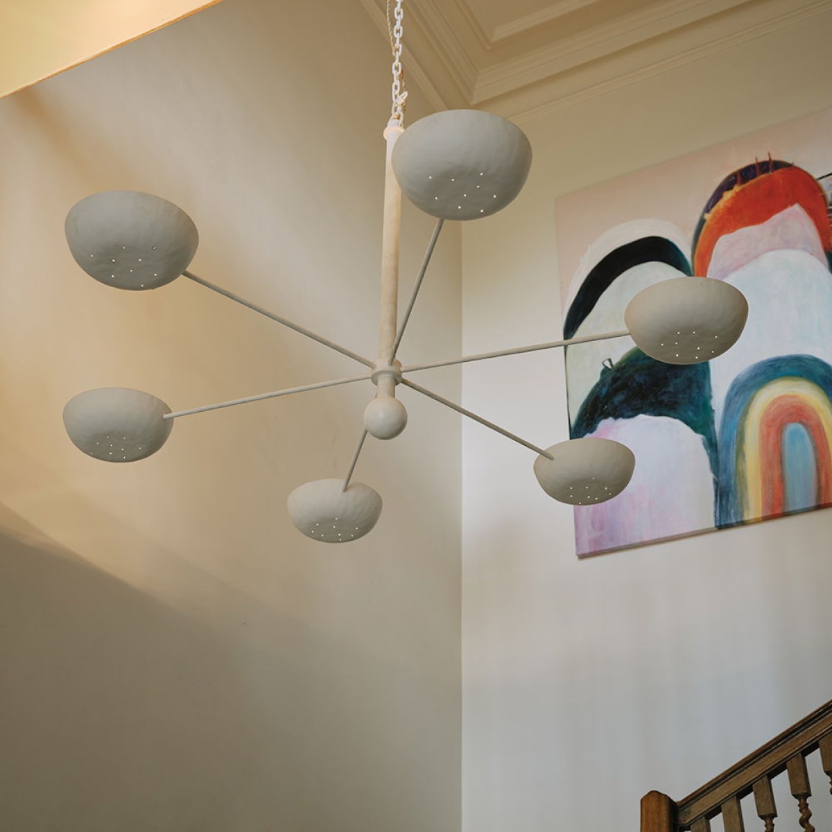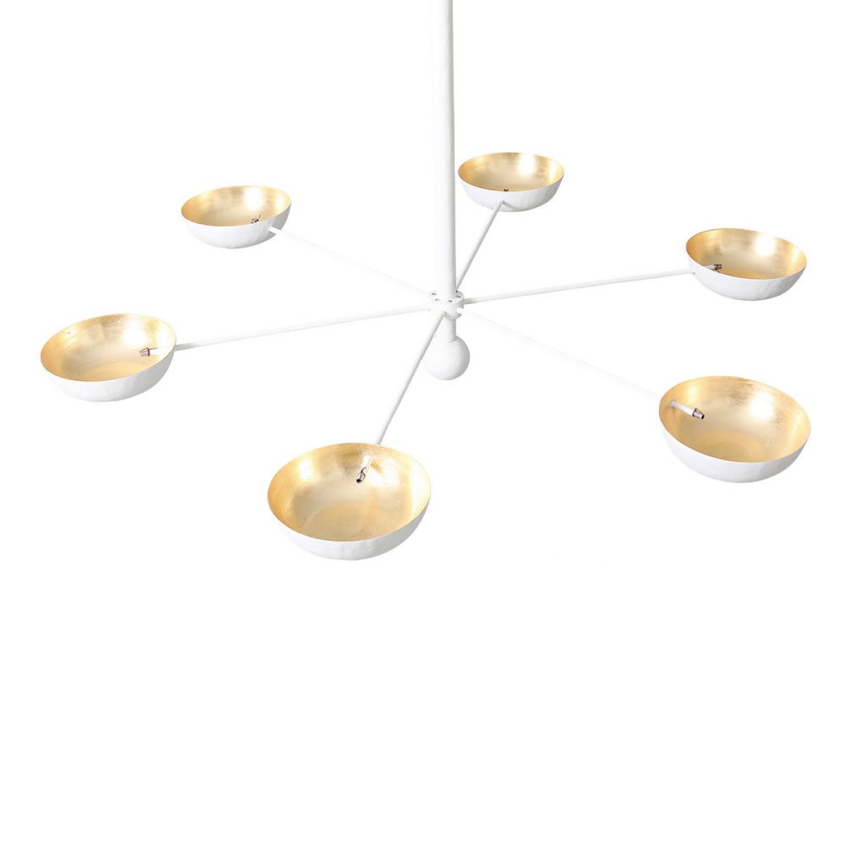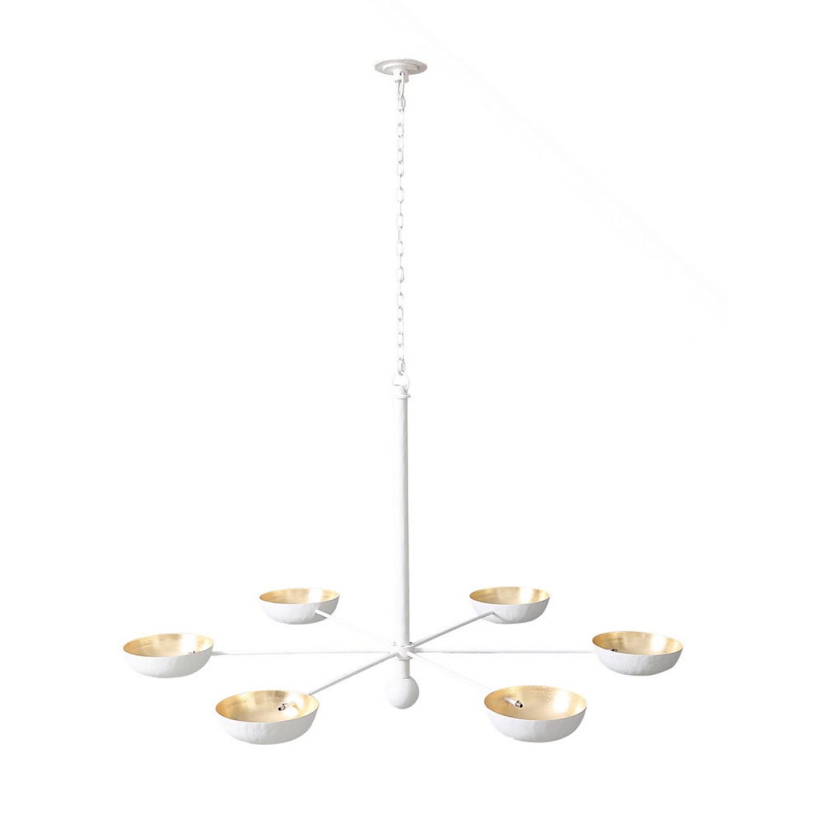 A beautiful understated, six armed Gesso Chandelier with Gilded detail on the inside of each cup. The Dove Chandelier by Julian Chichester produces a lovely warm light. This design is being updated to feature dozens of small holes in the fascia for each disc, giving a pretty effect when lit. See the detail image for reference.