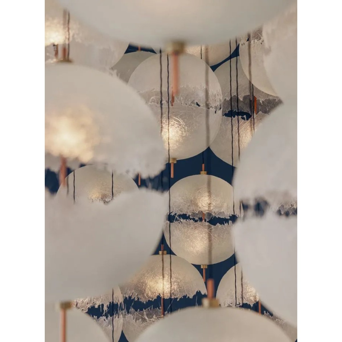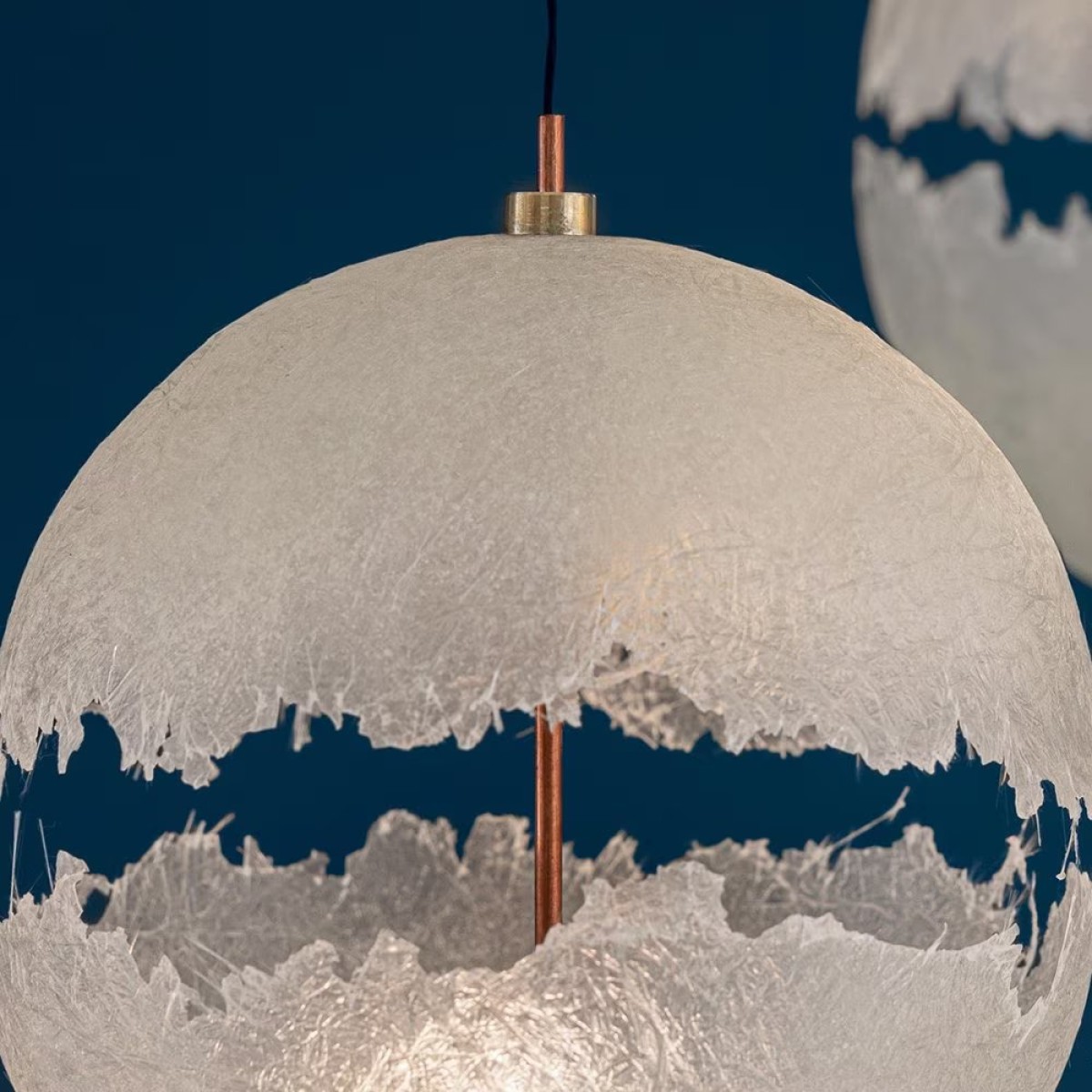 The Catellani Smith Chandelier best blends the elegance made in Italy with the expressive power typical of the Catellani & Smith brands. The result is a lamp with an unmistakable aesthetic which, with its irregular and fringed shapes, produces a light with great scenographic impact and unexpected delicacy, also thanks to the LED circuit used inside the fiberglass diffuser.