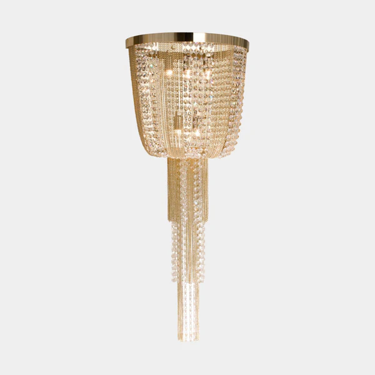 Gatsby’s powerful yet smooth lines create an organic movement of lights and shadows that suggest elegance and glamour. The sumptuous lamp handcrafted in gold plated brass, combined with beautiful crystals, will stand out in the most luxurious and exclusive interior décors.