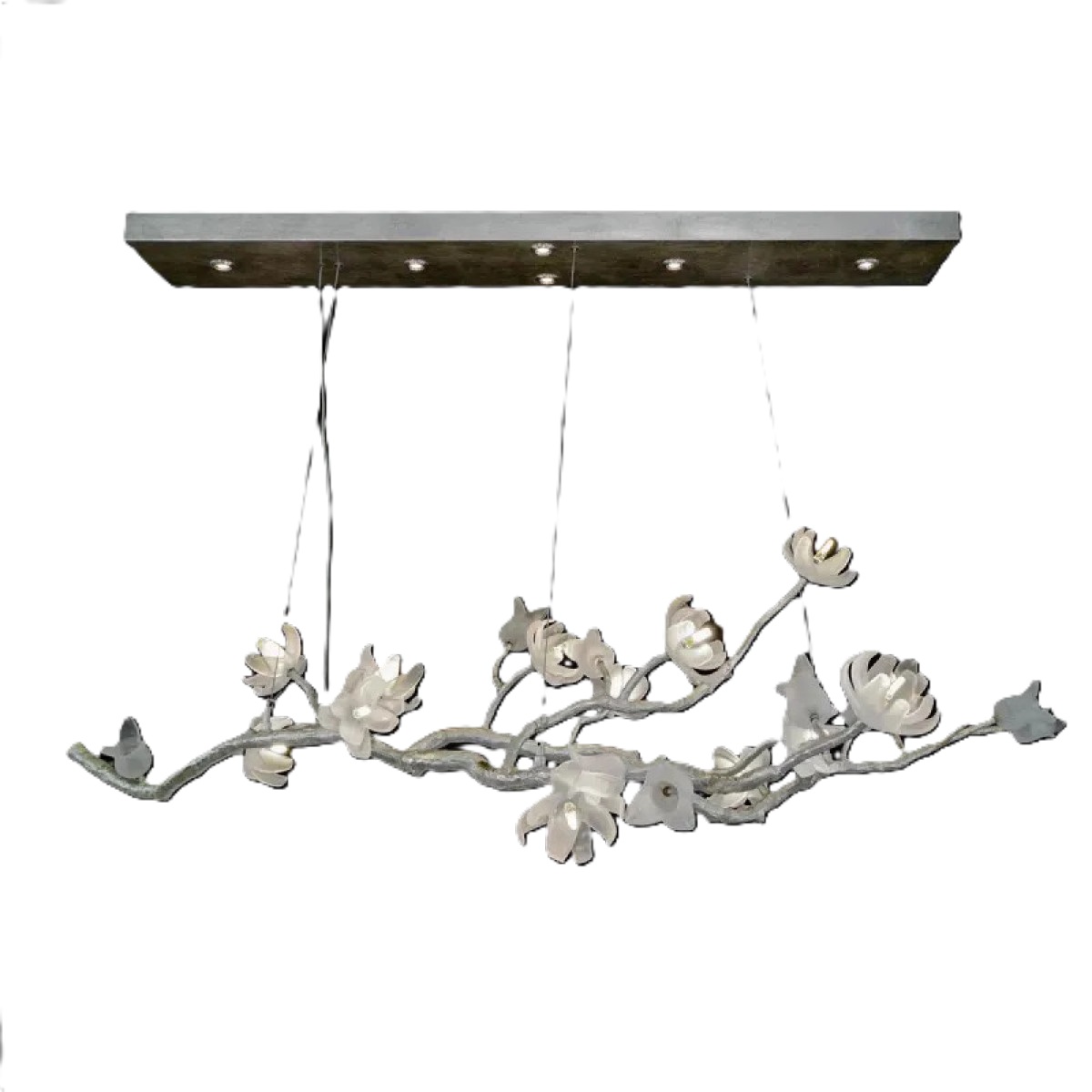 This oblong chandelier has branches in antique silver leaf with thirteen frosted mouthblown glass magnolia lights and ten decorative frosted mouthblown glass tulips. Six led bulbs (3 watt max) preinstalled in the canopy. It's canopy dimensions rectangle: 52"W x 8"D x 2"H.