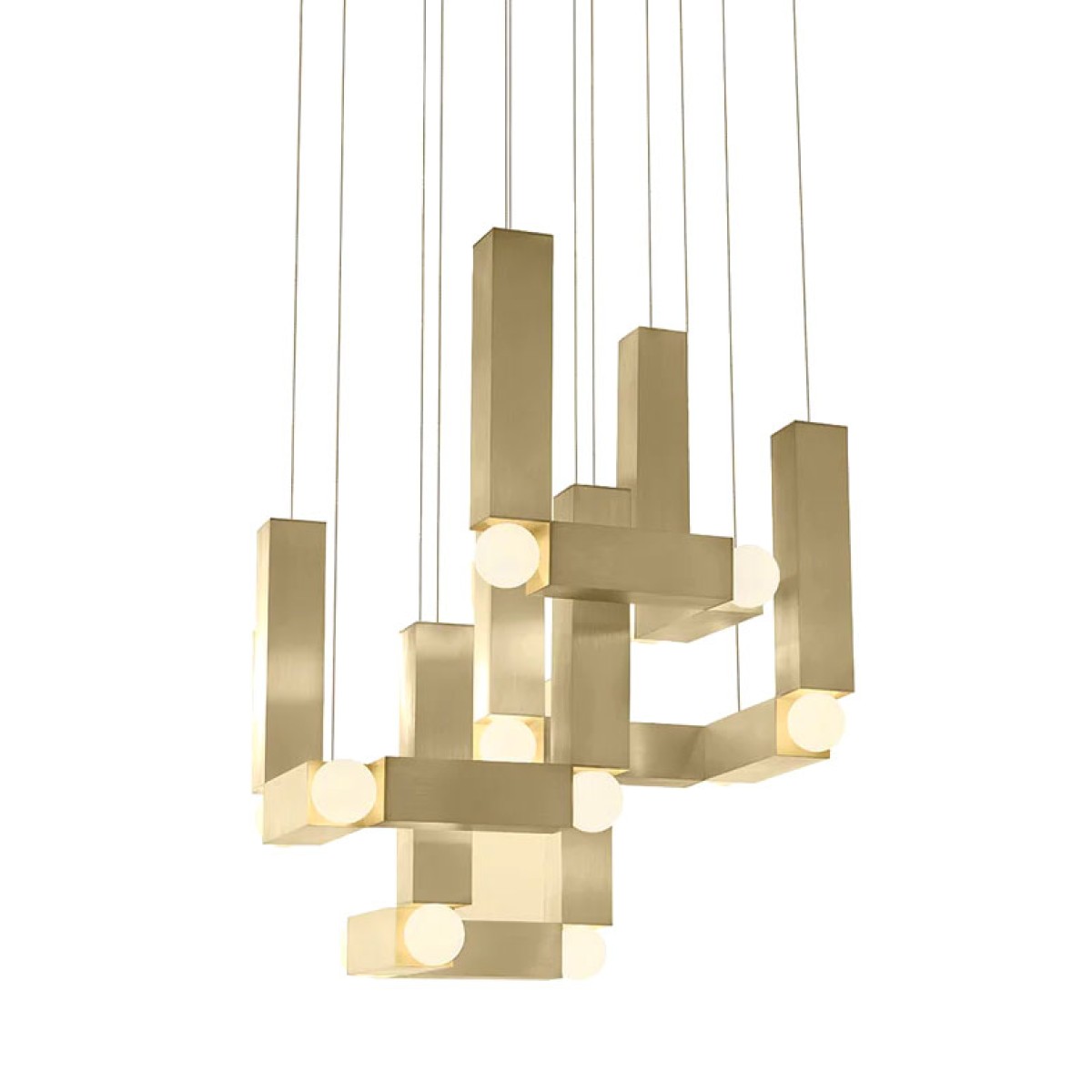Vesper is inspired by the simple geometric lines of brutalist sculpture and modernist cathedral lighting. Formed with extruded aluminium and available in anodized gold or silver, vesper explores the delicate balance and interconnection of its rectangular cubes that are seamlessly connected by illuminated spheres. The light sculpture, which is suspended by cables, is available in both duo and quattro versions.