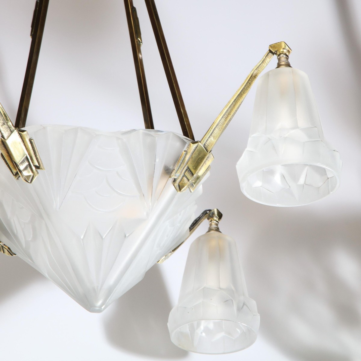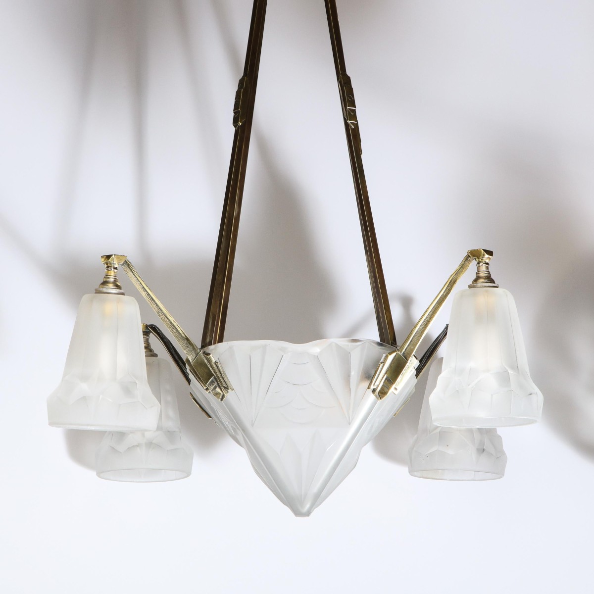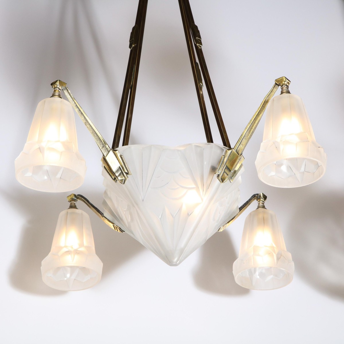 This elegant art deco chandelier was realized in france circa 1930. It offers a silvered bronze frame with a pyramidal body and four conical shades that descend from the cantilevered arms. The frosted glass of the body and shades is etched in bas relief with cubist motifs including demilune and streamlined forms. The fixture attaches to the sculptural striated sunburst canopy via four rectangular rods. With its clean lines and monochromatic palate, this chandelier is as versatile as it is aesthetically pleasing, blending perfectly with any style of interior from classic deco to contemporary. It is in excellent vintage condition. The height can be adjusted to suit. The chandelier accommodates five candelabra based bulbs offering up to 300 watts of light.