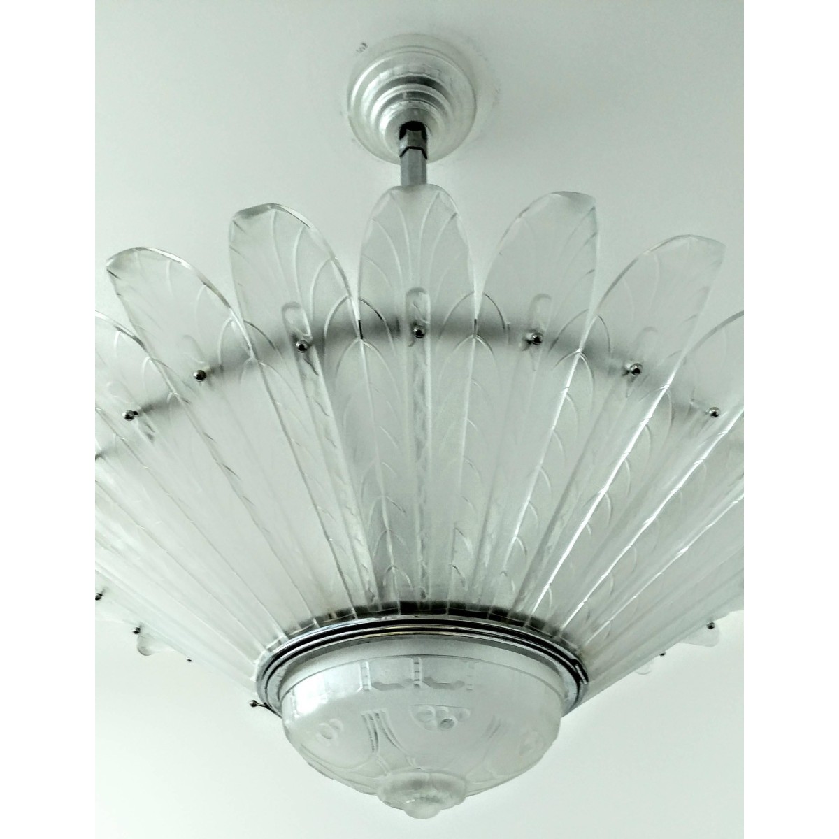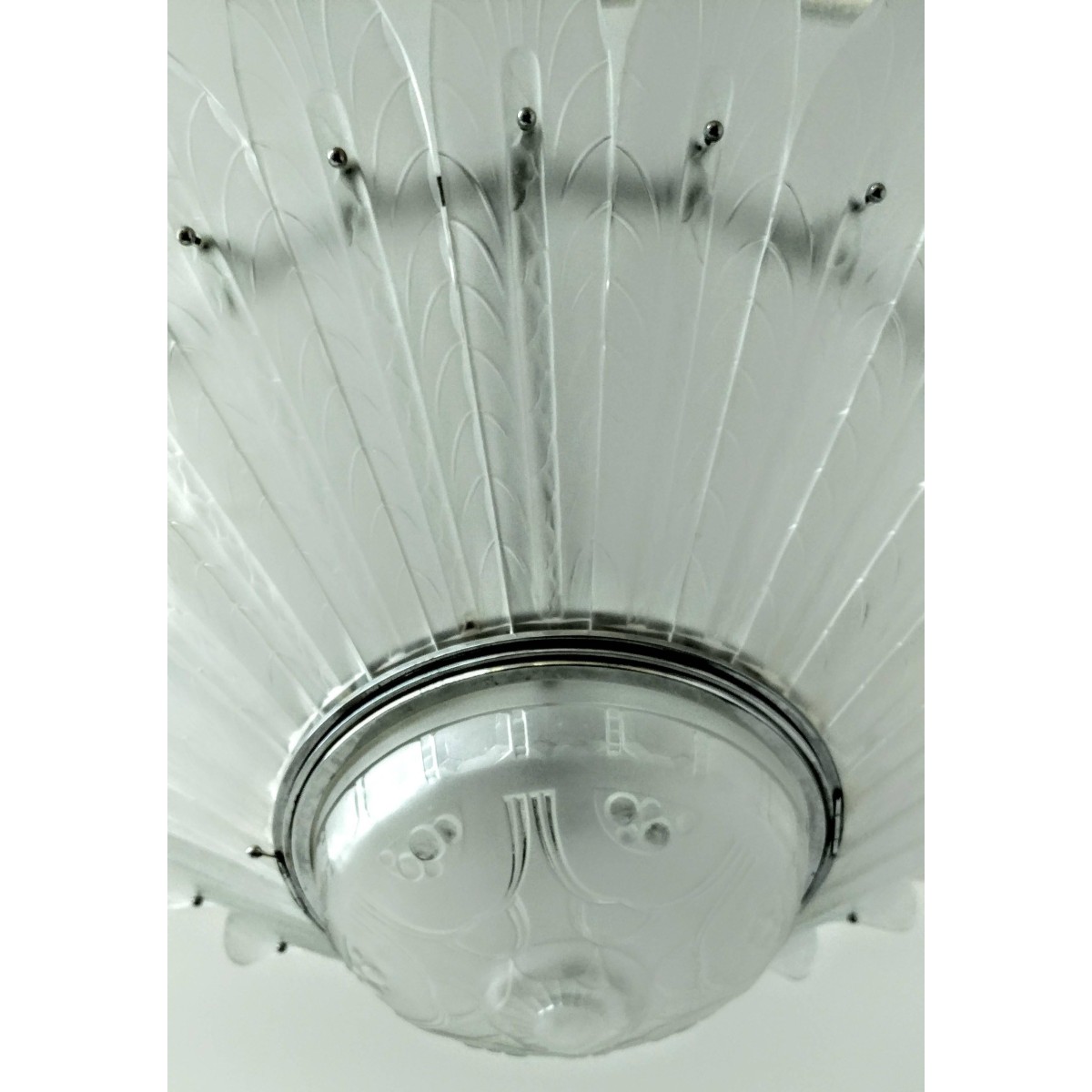 A substantial and rare french art deco chandelier from the 1930’s was designed by the glass master " marius-ernesto sabino " in great condition. Consists of twelve glass panels in a geometric motif embracing a center coupe which rests on a hinged access door in polished details held by a silvered bronze hexagon rod. All glass panels are signed “ sabino france ” rewired to u.s. Standards that accommodate six household bulbs (total of 1200 watts max) custom drop (extended or shorten from original dimension) re-plating in different finishes upon request at no additional cost. Complimentary drop-off to new york city. We are the rare source that has specialized exclusively in french art deco for over three decades, since 1991 with restoration, repair and plaiting for any lighting period located in long island city, n.y. If you are searching for a particular item, we have additional inventory in our collections that may fit your needs. Please feel free to ask any questions by pressing the " ask the seller " button so we may assist you in finding a wonderful piece that's just right for you.