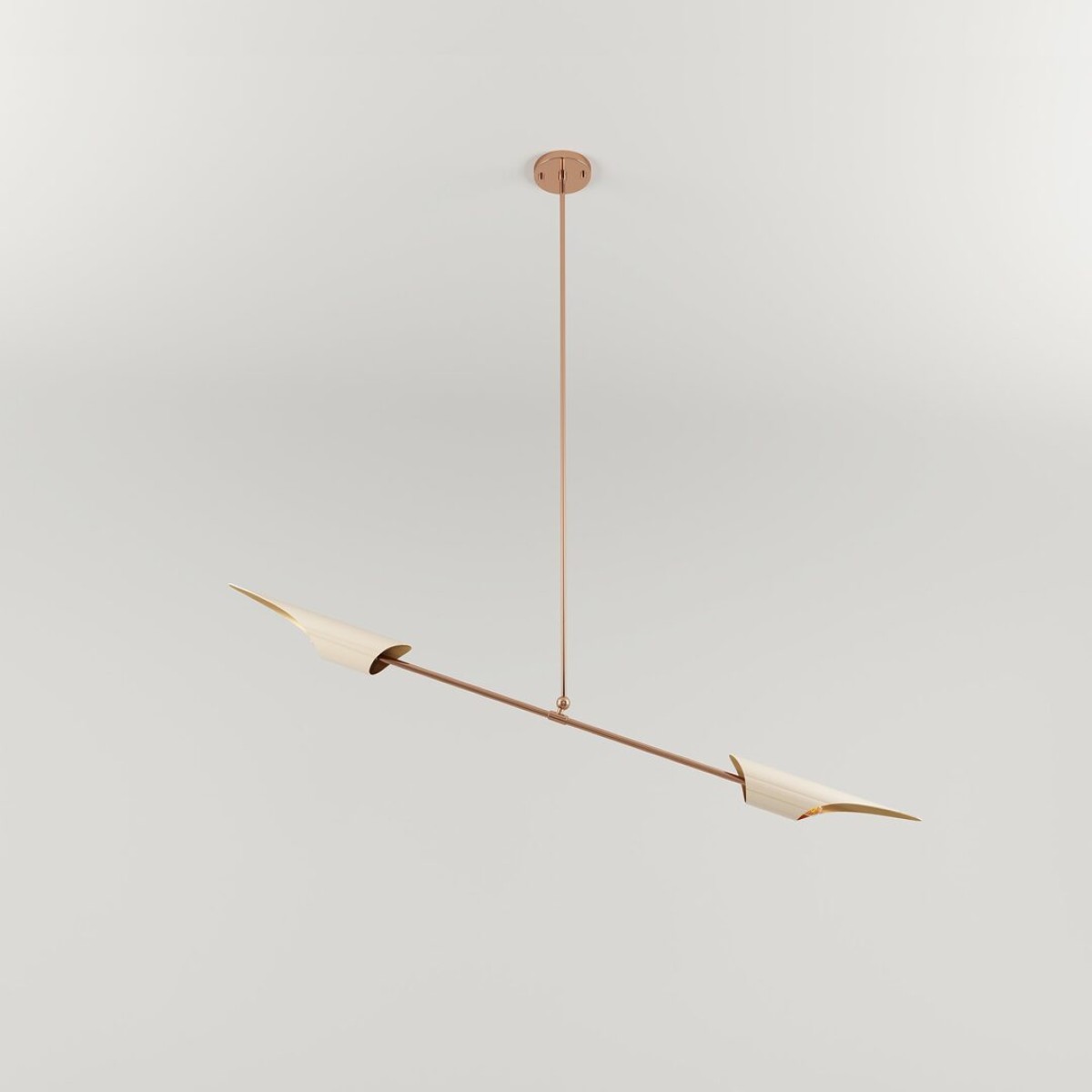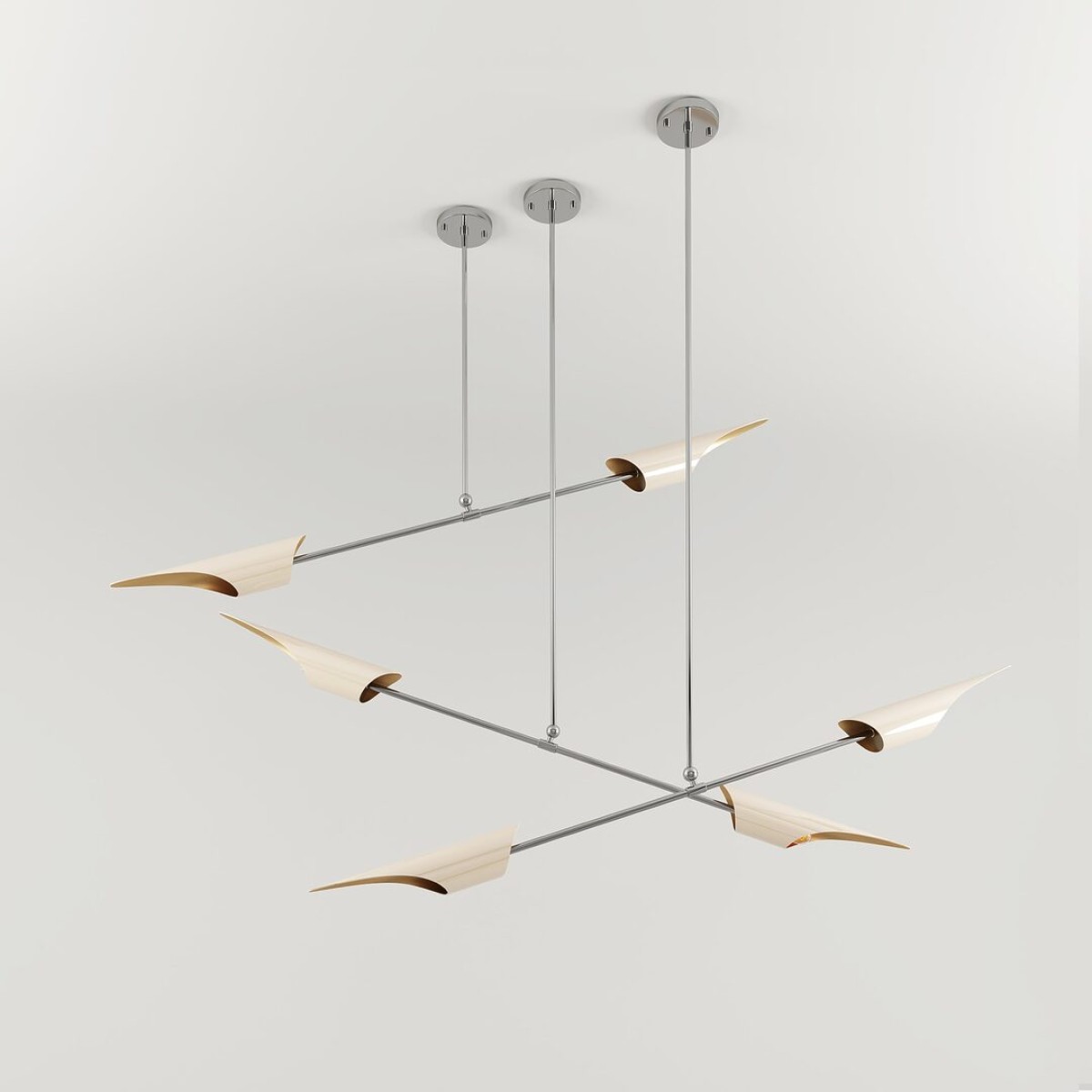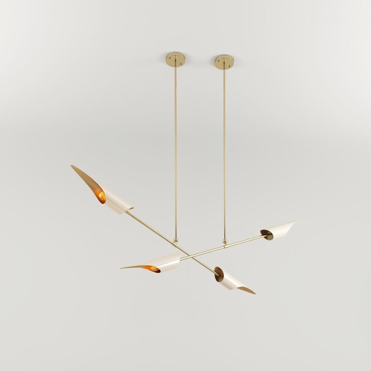 Often seen gilding across lakes, Swans have long represented elegance and refinement. Although they live on the water, they use to fly in glamorous movements. So inspired by the swan’s versatility and delicacy, Creativemary designers conceived this minimal Suspension Lamp. Featuring a simplicity of form, the Swan Suspension Lamp has a brass minimalist body. And taking inspiration from the swans’ wings, the lacquered aluminum lampshades were designed as if they were flying. Ideal for lower hanging situations, such as in living or above dining areas, the Swan’s lighting effect will provide added ambiance to a room. It's overall Height 47".