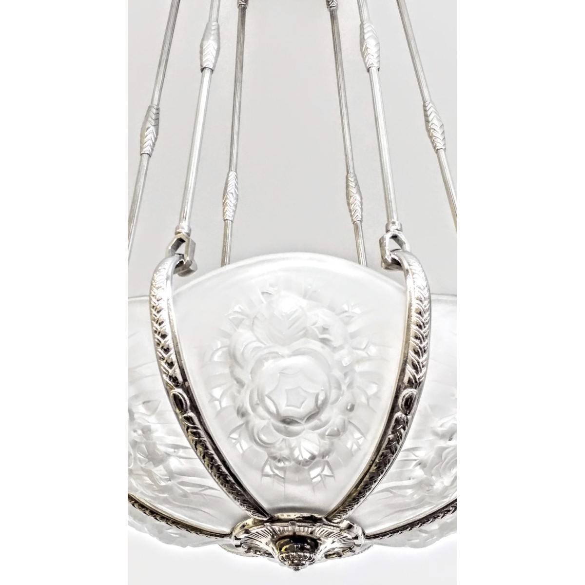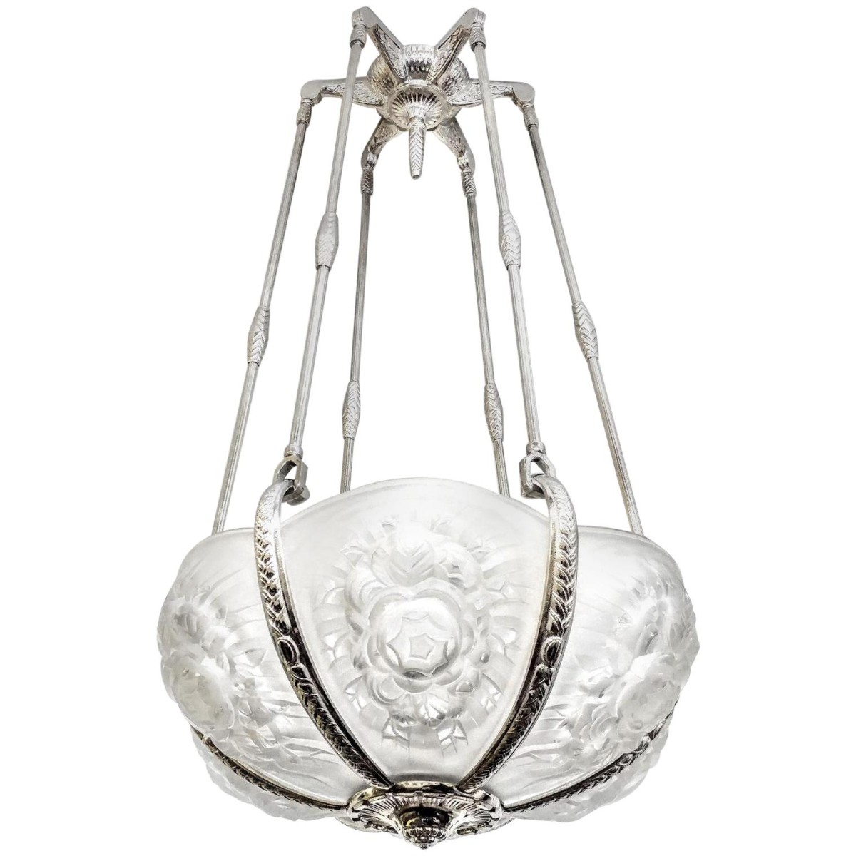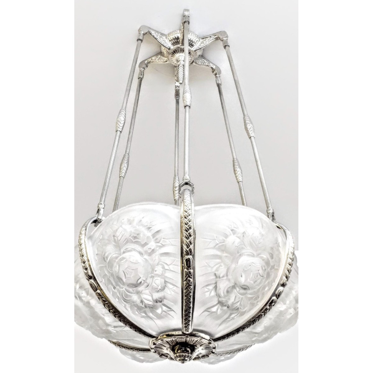 Elegant and rare French Art Deco chandelier created by the glass master French artist "Marius Ernest Sabino" In a nickeled bronze geometric design frame accommodates six large curved glass panels in clear frosted with intricate flowers motif. The fixture was re-plated in nickel and rewired to U.S. standards which accommodate six medium bases, household bulbs (total of 1200 watts max) Custom drop (extend or shorten from original dimension) and re-plating in different finishes upon request at no additional cost. We are the rare source that specializes exclusively in French Art Deco for over three decades, since 1991 with restoration, repair and plaiting for any lighting period located in Long Island City, N.Y. If you are searching for a particular item, we have additional inventory in our collections that may fit your needs. Please feel free to ask any questions by pressing the " ASK THE SELLER " button so that we may assist you in finding a wonderful piece that's just right for you.