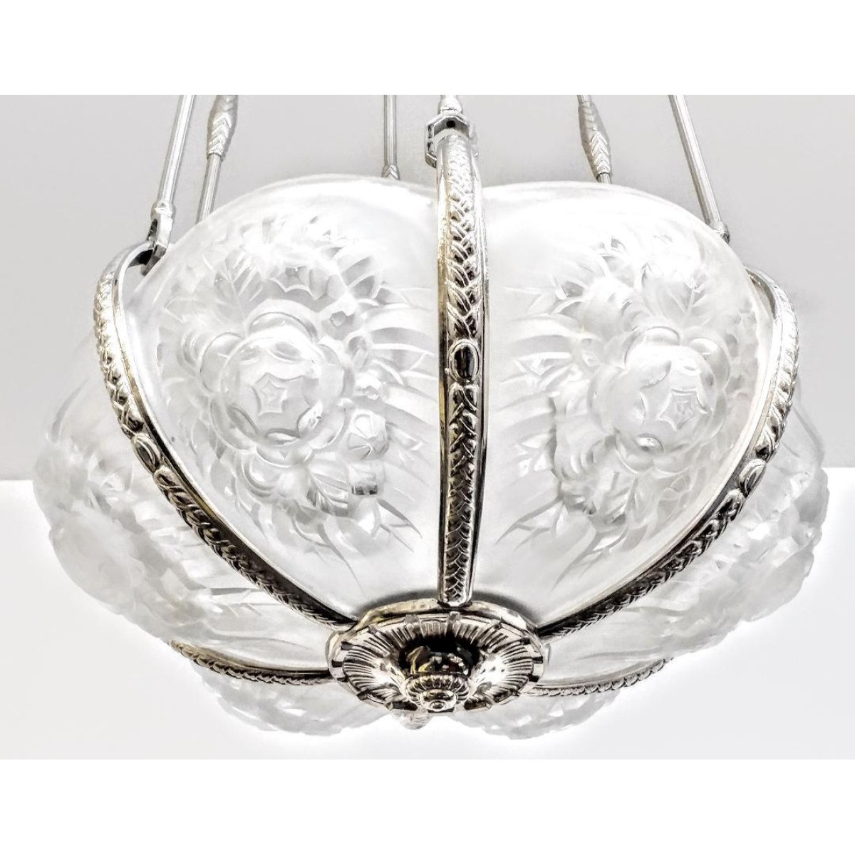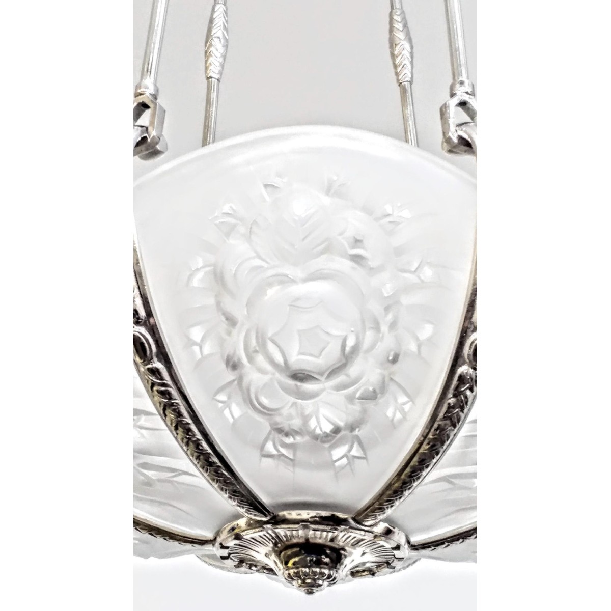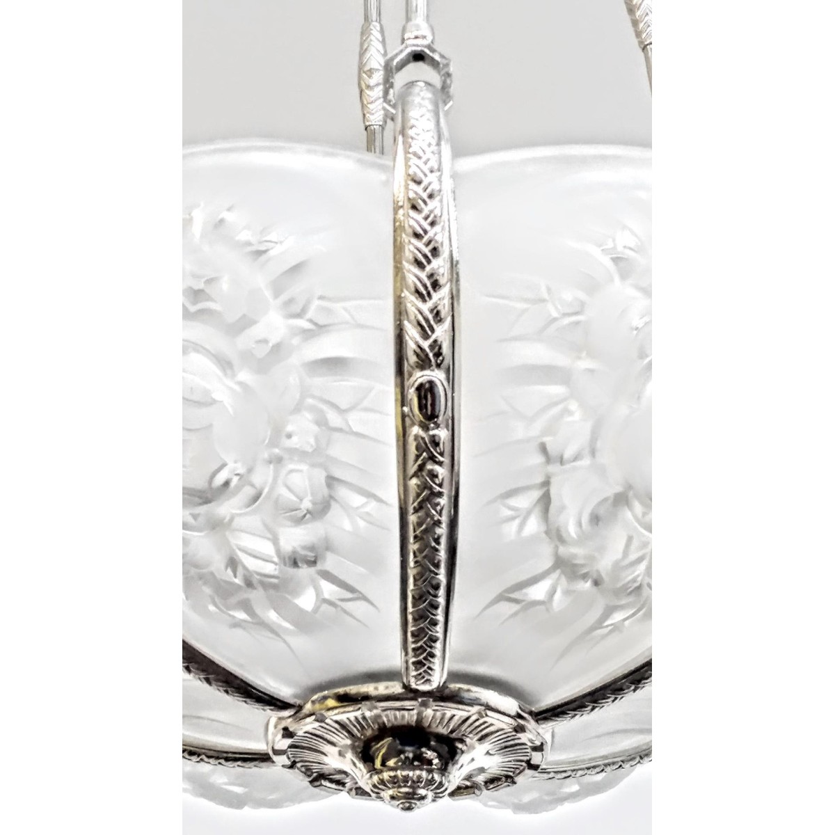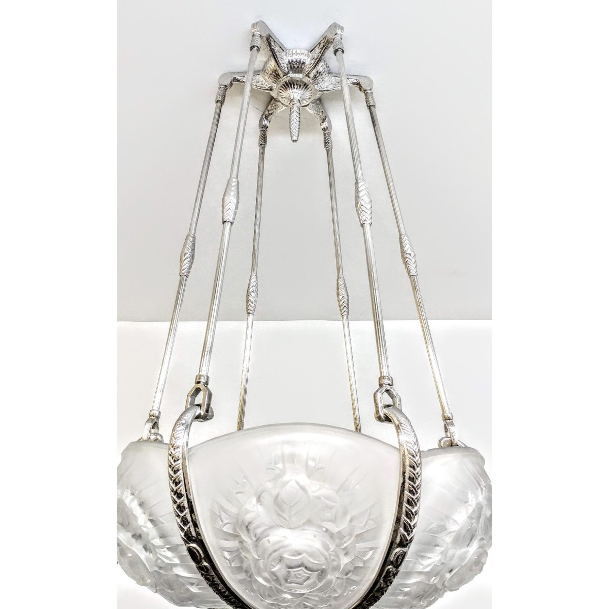 Elegant and rare French Art Deco chandelier created by the glass master French artist "Marius Ernest Sabino" In a nickeled bronze geometric design frame accommodates six large curved glass panels in clear frosted with intricate flowers motif. The fixture was re-plated in nickel and rewired to U.S. standards which accommodate six medium bases, household bulbs (total of 1200 watts max) Custom drop (extend or shorten from original dimension) and re-plating in different finishes upon request at no additional cost. We are the rare source that specializes exclusively in French Art Deco for over three decades, since 1991 with restoration, repair and plaiting for any lighting period located in Long Island City, N.Y. If you are searching for a particular item, we have additional inventory in our collections that may fit your needs. Please feel free to ask any questions by pressing the " ASK THE SELLER " button so that we may assist you in finding a wonderful piece that's just right for you.