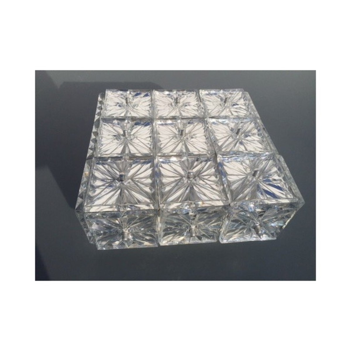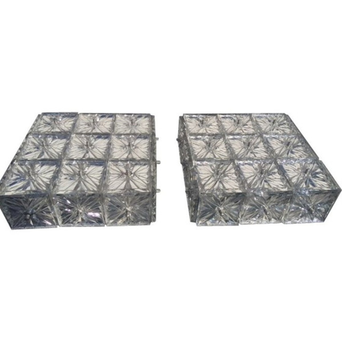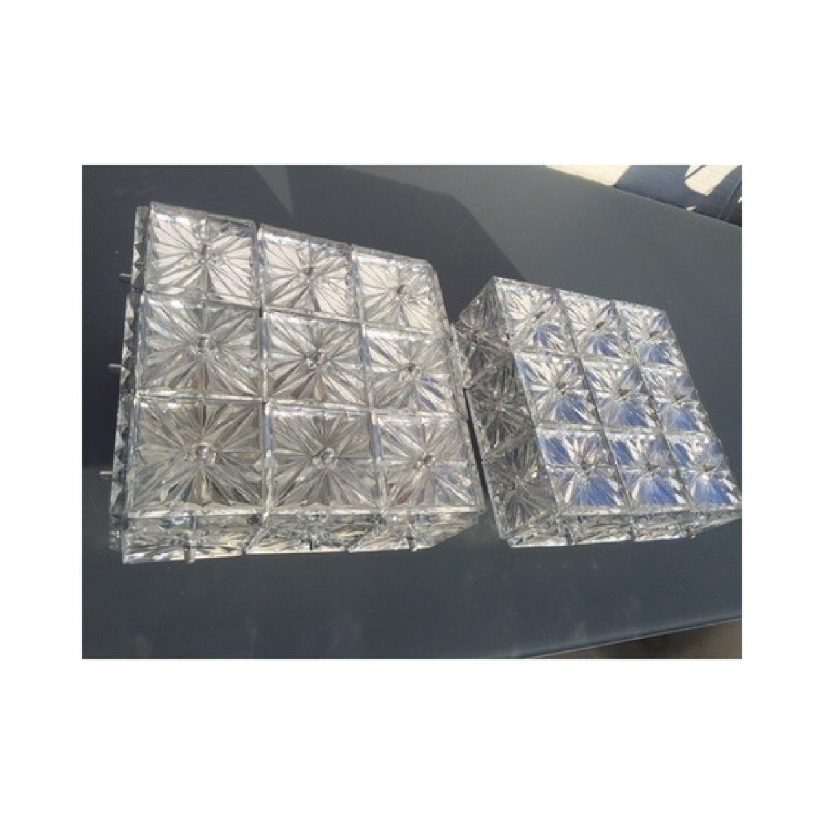 Pair of Kinkeldey Germany sconces or ceiling lights. 1970 in crystal glass and metal , good condition; may have some wear marks. Note: one of the small cap screws that hide the thread where the crystal square is attached is missing.