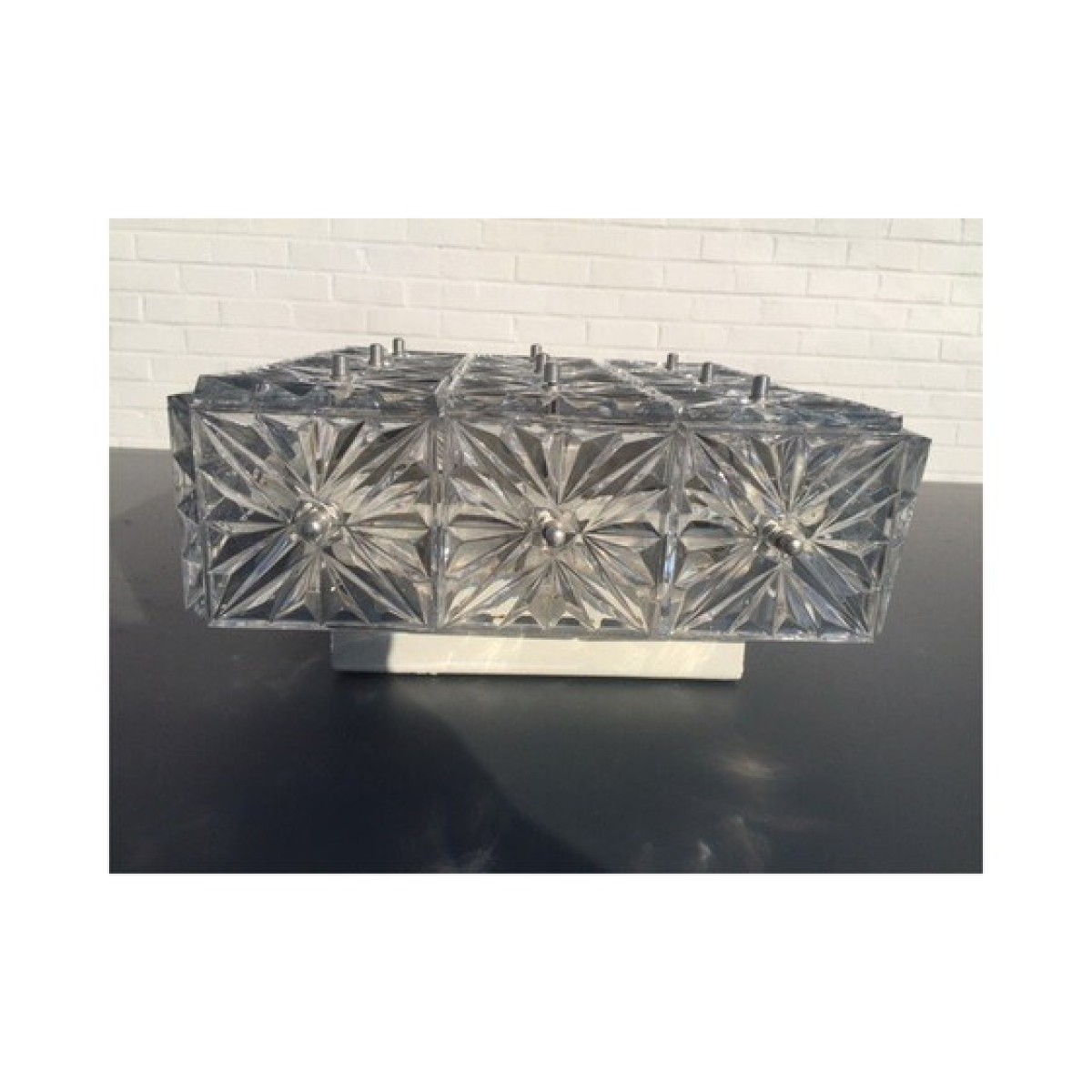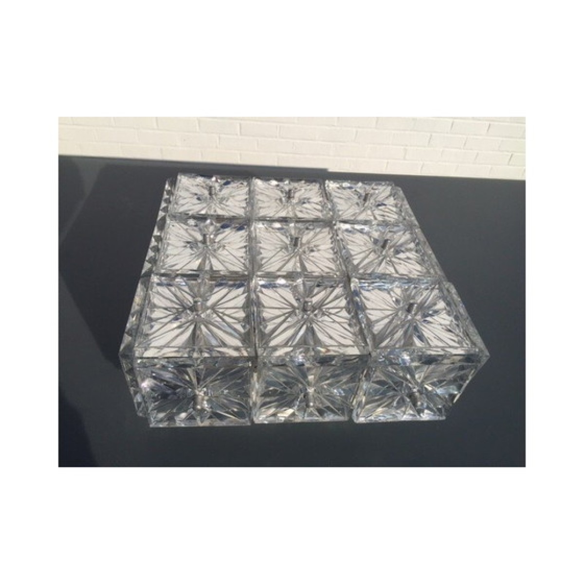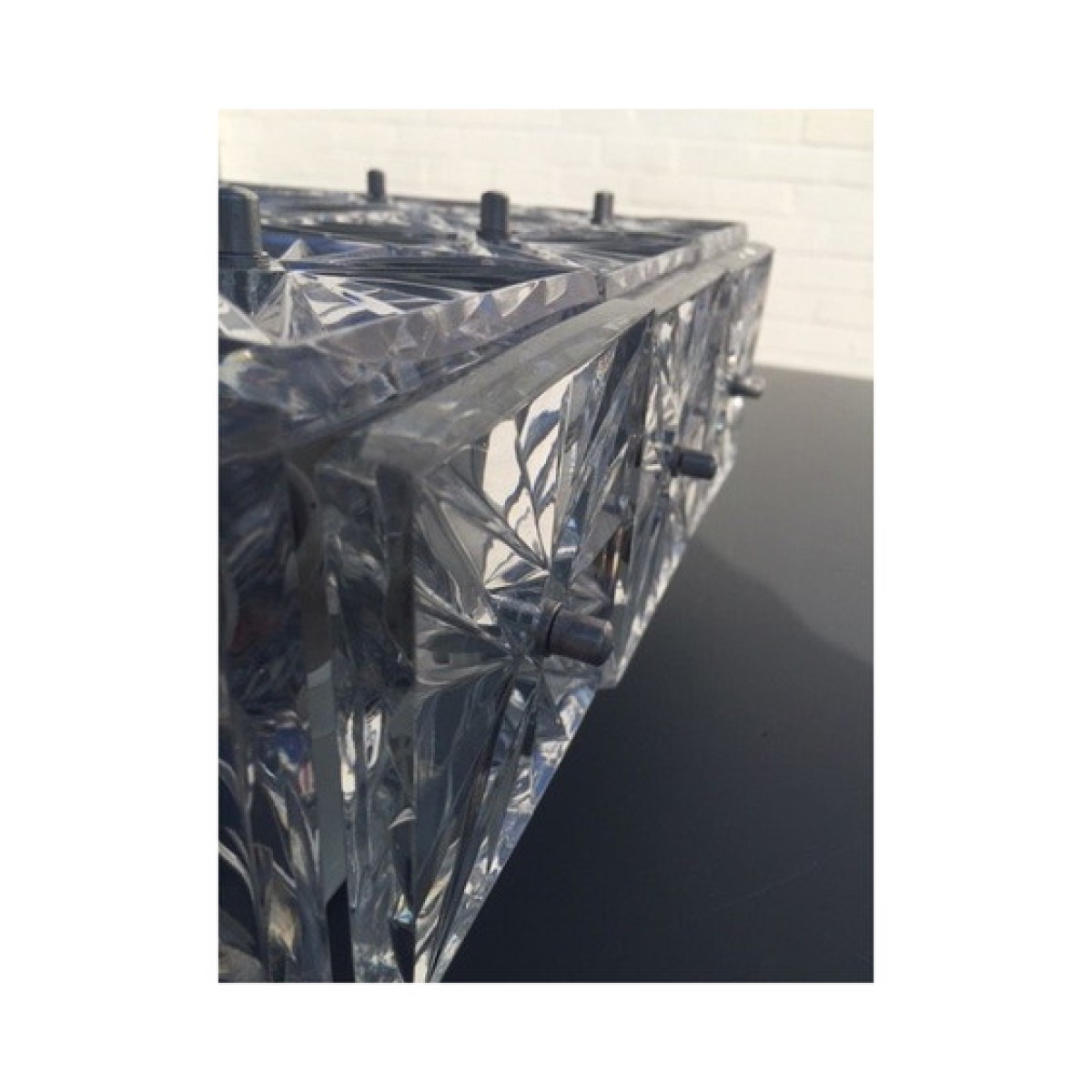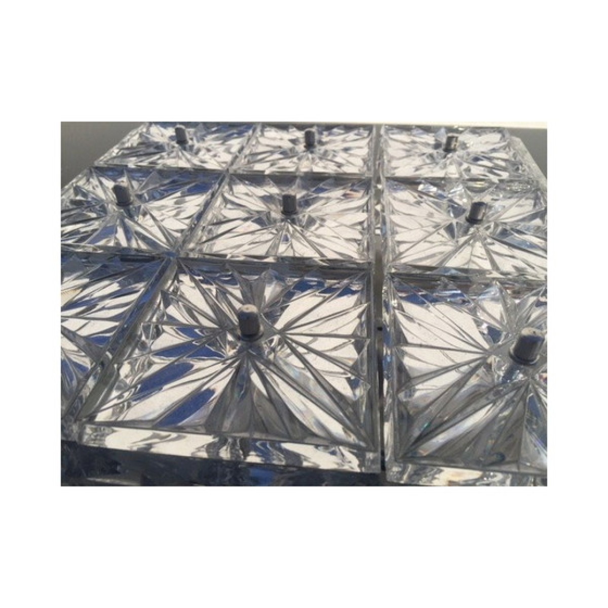 Pair of Kinkeldey Germany sconces or ceiling lights. 1970 in crystal glass and metal , good condition; may have some wear marks. Note: one of the small cap screws that hide the thread where the crystal square is attached is missing.
