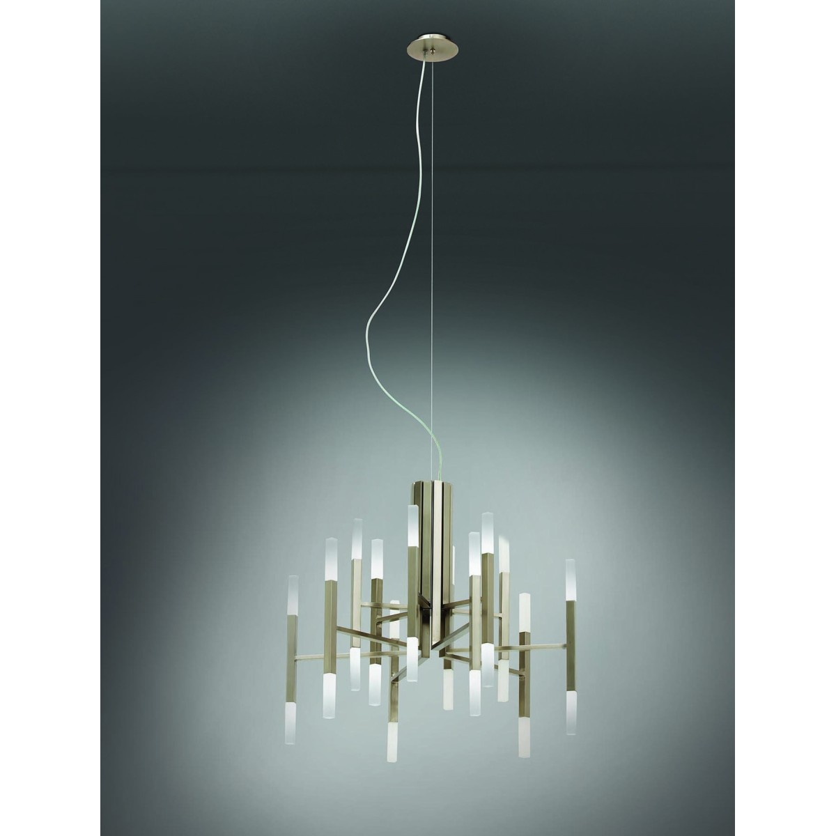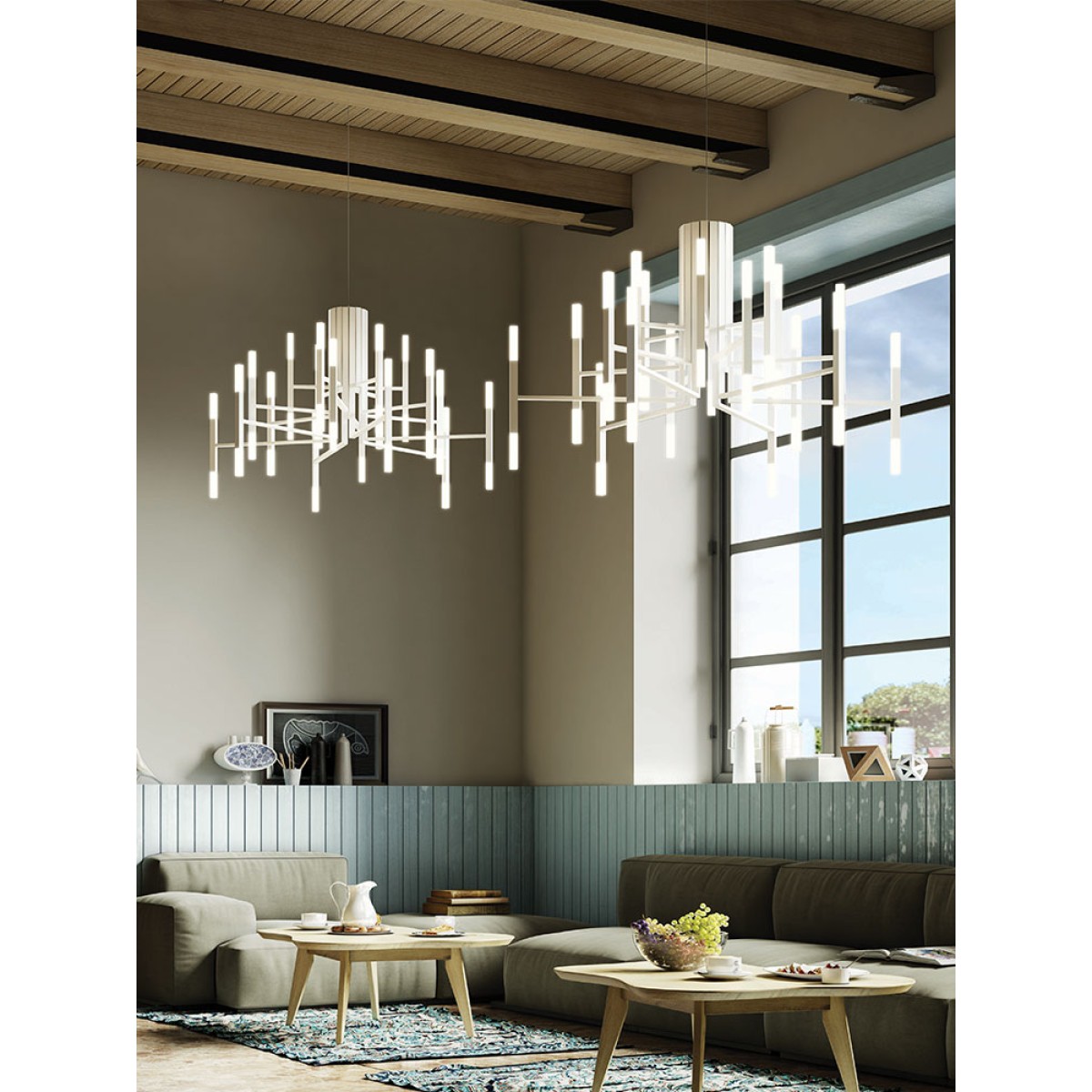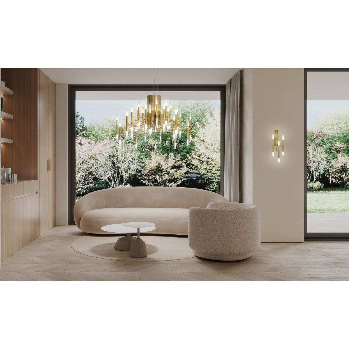 THELIGHT is a collection made up of three large suspensions and a wall light. Its design is the result of reversing the classic 'chandeliers' and the old wall lamps set up with candles, a reinterpretation that results in a radically contemporary style that implies LED technology. THELIGHT is one of the collections that has given us the greatest satisfaction and with which clients from all over the world carry out the most spectacular projects. We love its mix of tradition and modernity, its combination of 'vintage' reminiscences with its current air, its showiness, its impressive appearance, its spectacular but serene demeanor, which brings a high degree of elegance and refinement to any space. It is also a versatile luminaire, which combines with various interior designs, ideal for lighting residential, hotel and commercial projects as well as, in general, any space that requires an original and striking luminaire that provides a lot of presence and luminosity. THELIGHT chandeliers come in three sizes: 12 arms, 18 arms and 30 arms. The wall lamp consists of a single model with 3 arms. These arms form the body of the light fixture by mounting one next to the other until they form the perimeter around a central cylinder, or the base in the case of the wall lamp. The structures of the pendants and the wall lamp are made of iron with a satin gold or nickel finish, or painted white or black. Each arm houses two integrated LEDs Seoul 2700K CRI>80, each of which illuminates a solid sandblasted methacrylate diffuser that produces a pleasant, non-dazzling, diffused light. The drivers are housed inside the structures. The suspensions and the wall lamp of the THELIGHT collection are not dimmable, but they can be ordered in a dimmable version (please check price) if required for a particular project.
