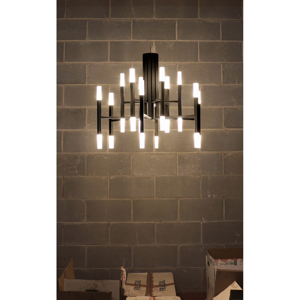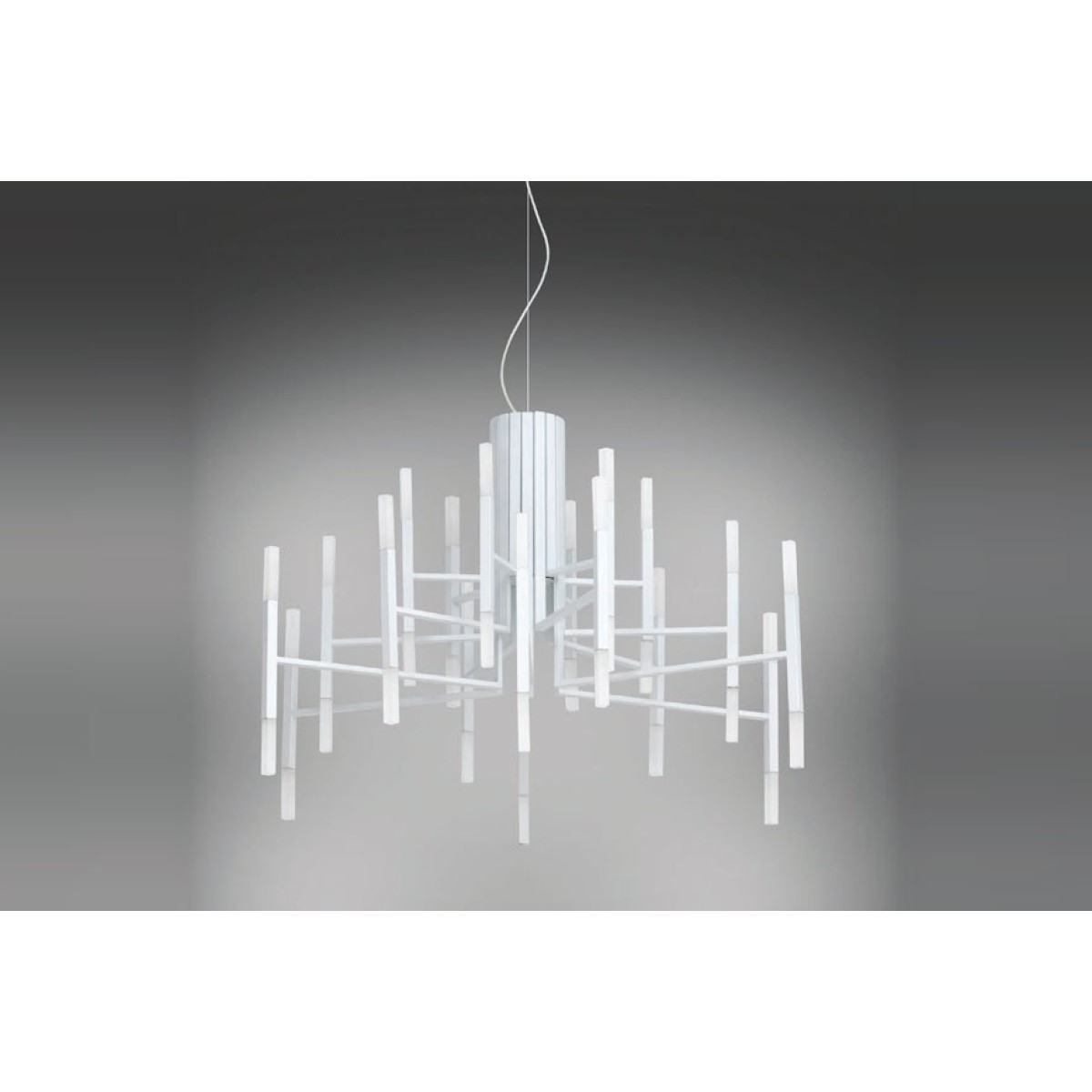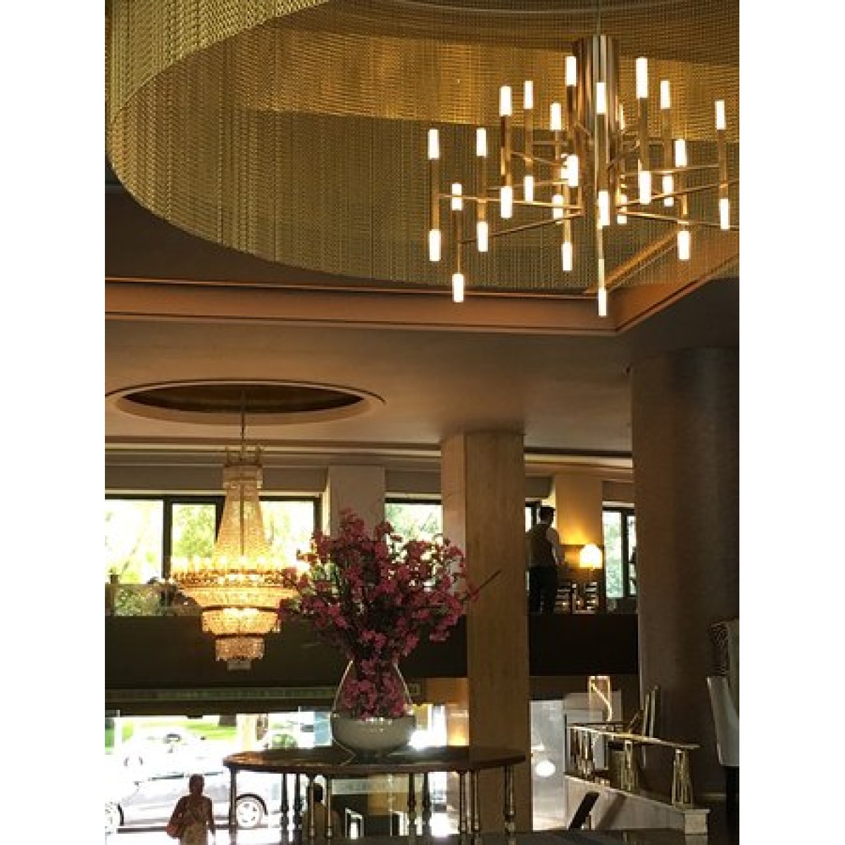 THELIGHT is a collection made up of three large suspensions and a wall light. Its design is the result of reversing the classic 'chandeliers' and the old wall lamps set up with candles, a reinterpretation that results in a radically contemporary style that implies LED technology. THELIGHT is one of the collections that has given us the greatest satisfaction and with which clients from all over the world carry out the most spectacular projects. We love its mix of tradition and modernity, its combination of 'vintage' reminiscences with its current air, its showiness, its impressive appearance, its spectacular but serene demeanor, which brings a high degree of elegance and refinement to any space. It is also a versatile luminaire, which combines with various interior designs, ideal for lighting residential, hotel and commercial projects as well as, in general, any space that requires an original and striking luminaire that provides a lot of presence and luminosity. THELIGHT chandeliers come in three sizes: 12 arms, 18 arms and 30 arms. The wall lamp consists of a single model with 3 arms. These arms form the body of the light fixture by mounting one next to the other until they form the perimeter around a central cylinder, or the base in the case of the wall lamp. The structures of the pendants and the wall lamp are made of iron with a satin gold or nickel finish, or painted white or black. Each arm houses two integrated LEDs Seoul 2700K CRI>80, each of which illuminates a solid sandblasted methacrylate diffuser that produces a pleasant, non-dazzling, diffused light. The drivers are housed inside the structures. The suspensions and the wall lamp of the THELIGHT collection are not dimmable, but they can be ordered in a dimmable version (please check price) if required for a particular project.