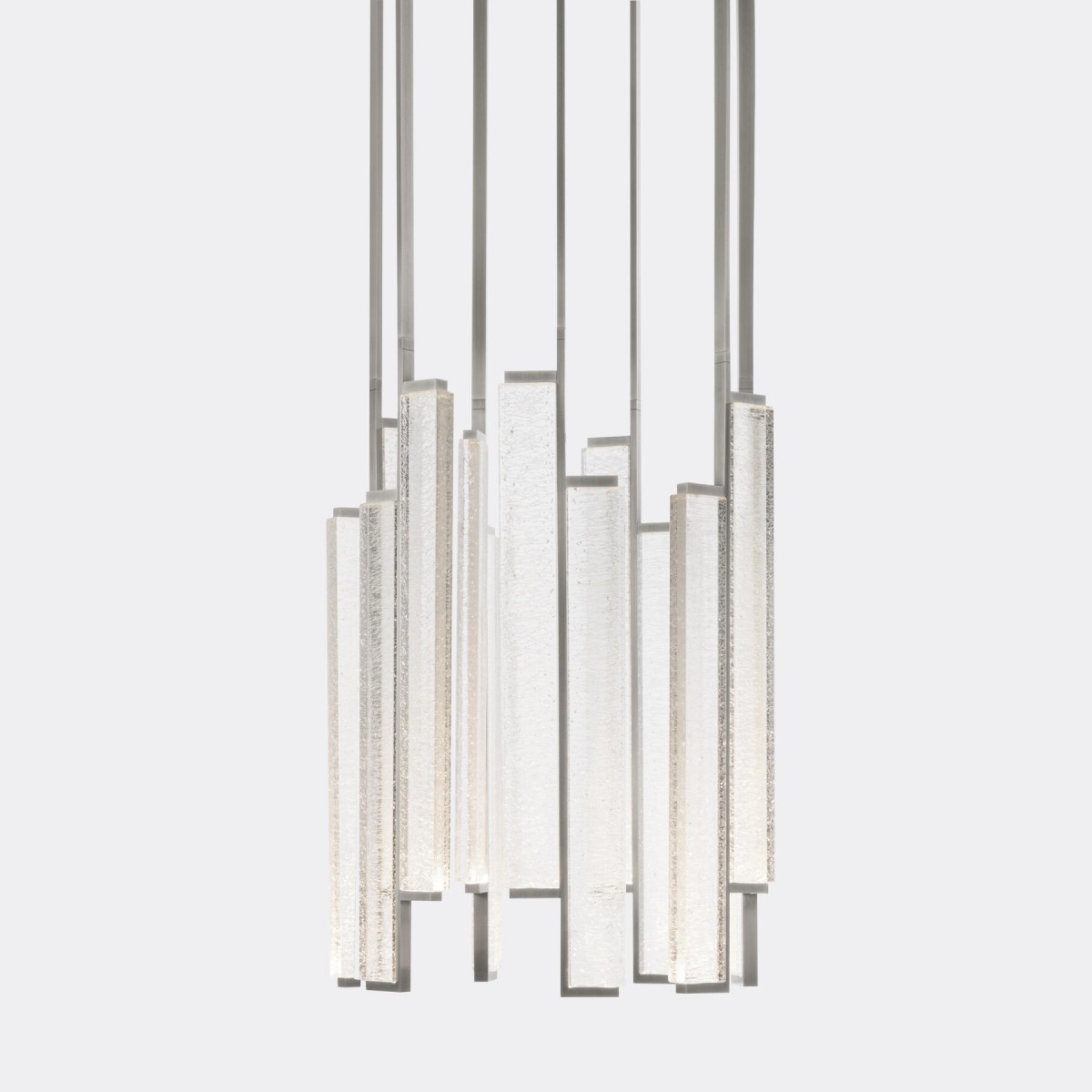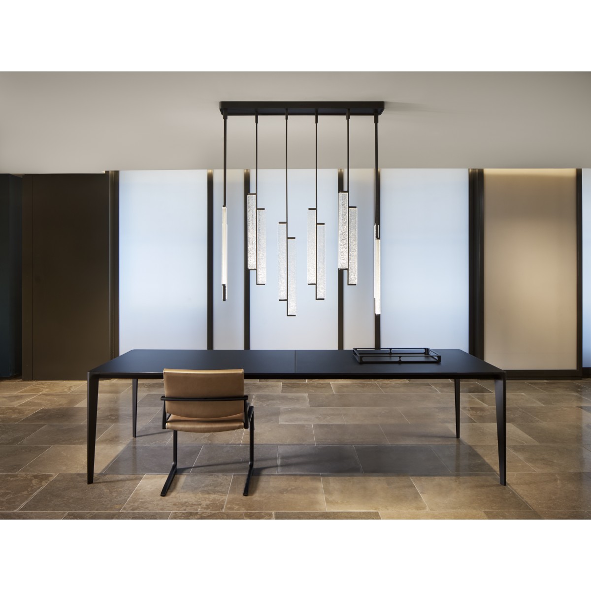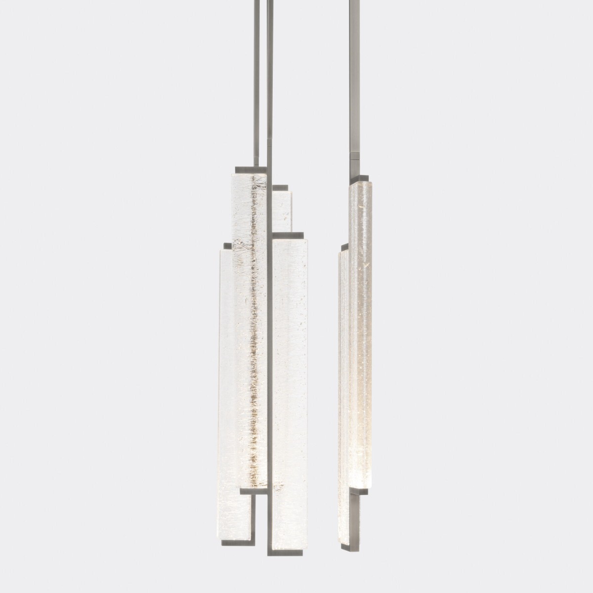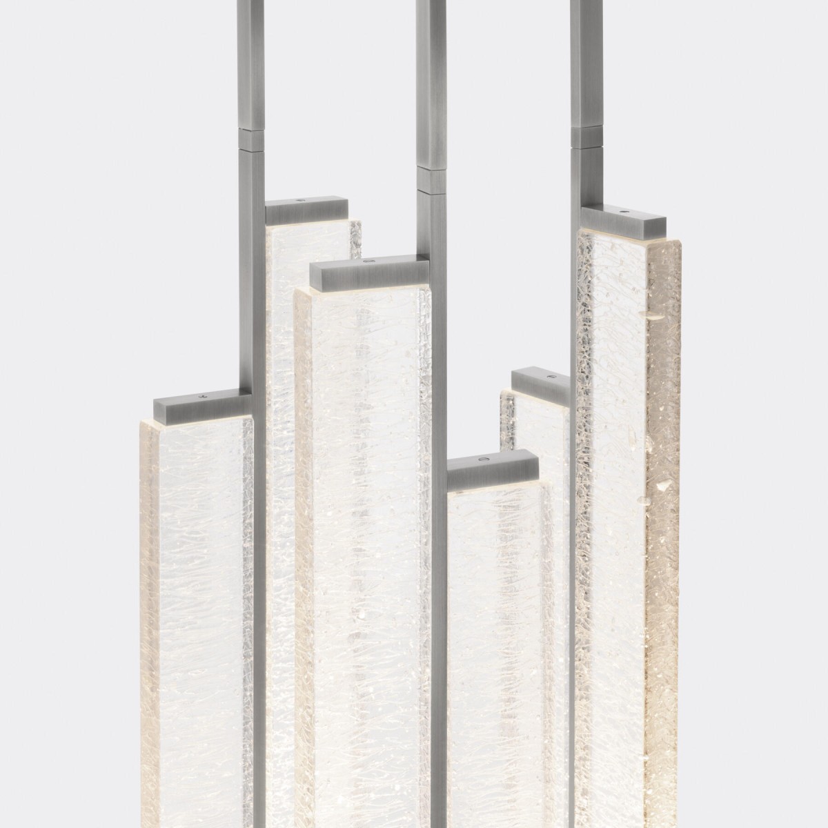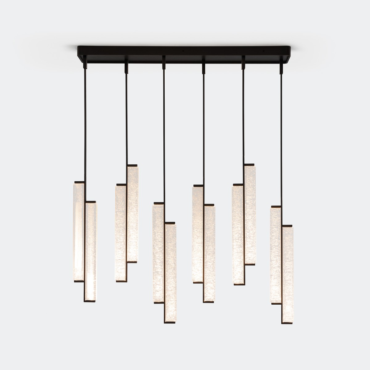The Kori Chandelier’s cast glass emits a glow reminiscent of dripping icicles at night, inspiring its name which means “ice” in Japanese. The individual pendant units can rotate in a range of angles and positions to best highlight both the space and the beautiful textures created by the vertical glass casting process, which ensures that no two pieces are exactly alike.