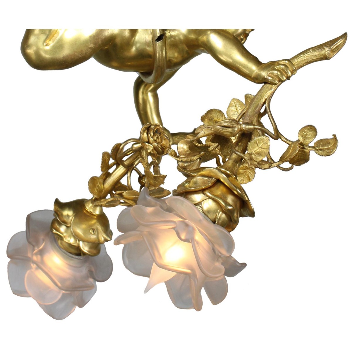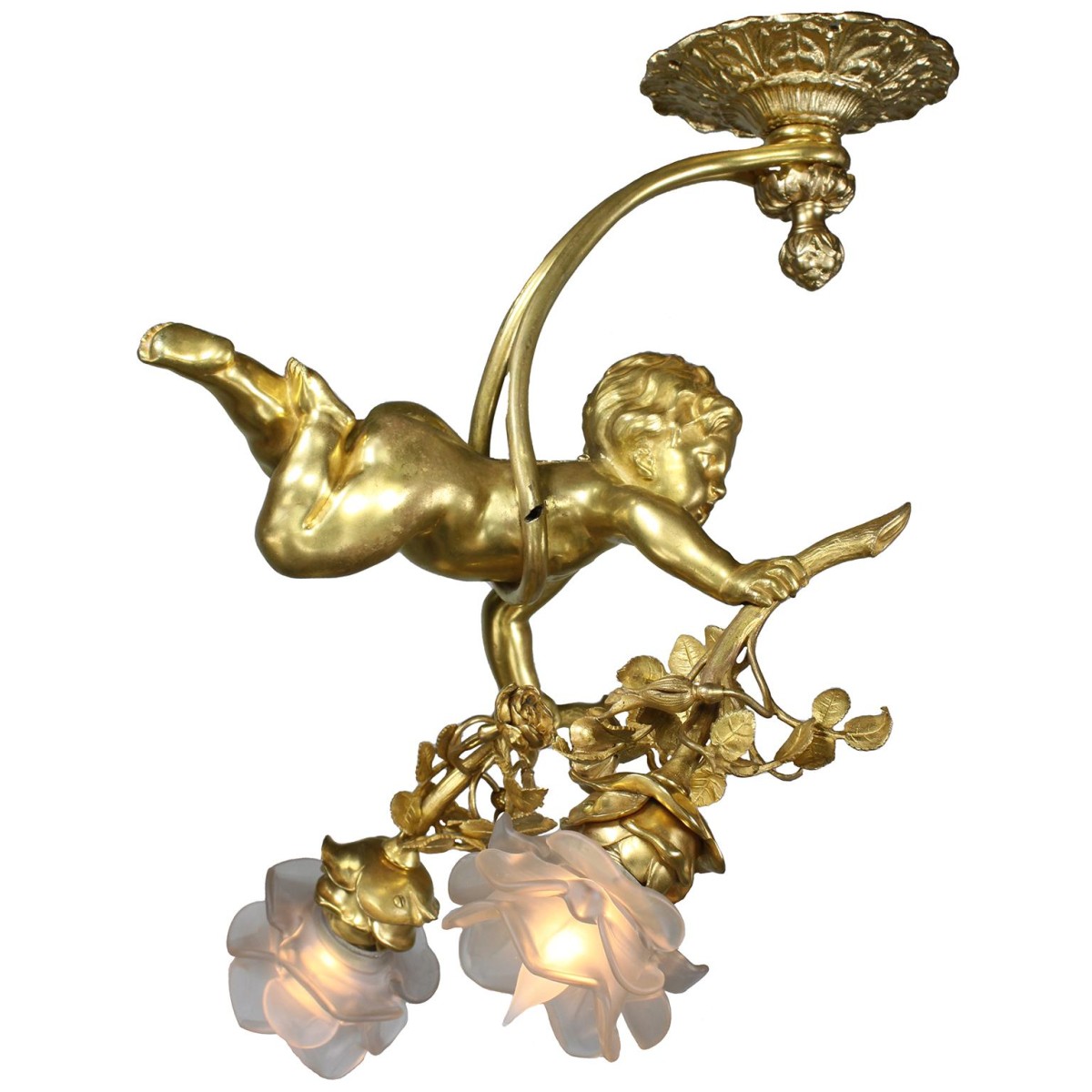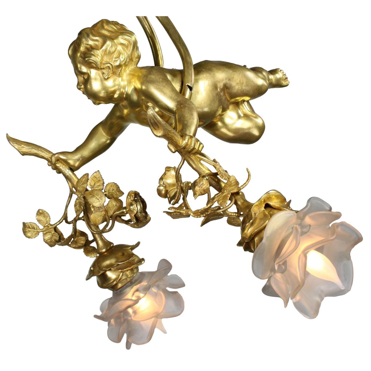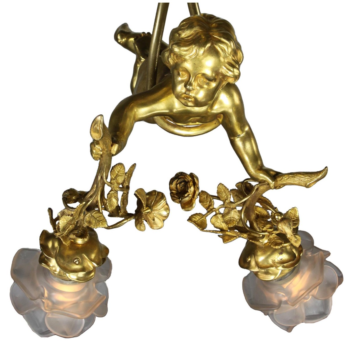 A charming whimsical French 19th/20th century Belle Epoque two-light gilt bronze figural chandelier pendant. The charming gilt bronze figure of a naked hovering Putto (Child), suspended from a ribbon-tied tassel wrapped around his body, holding a gilt bronze branch with flowers and leaves ending on two-term lights with frosted floral blown-glass shades.