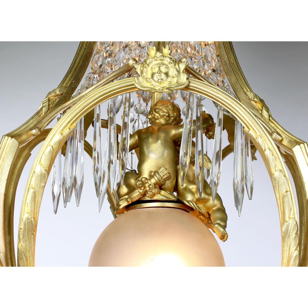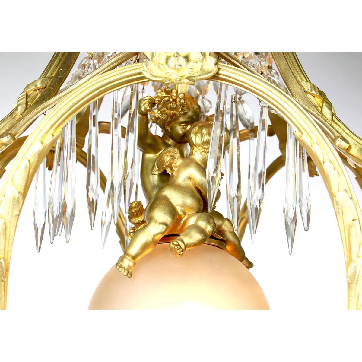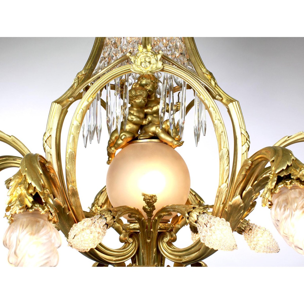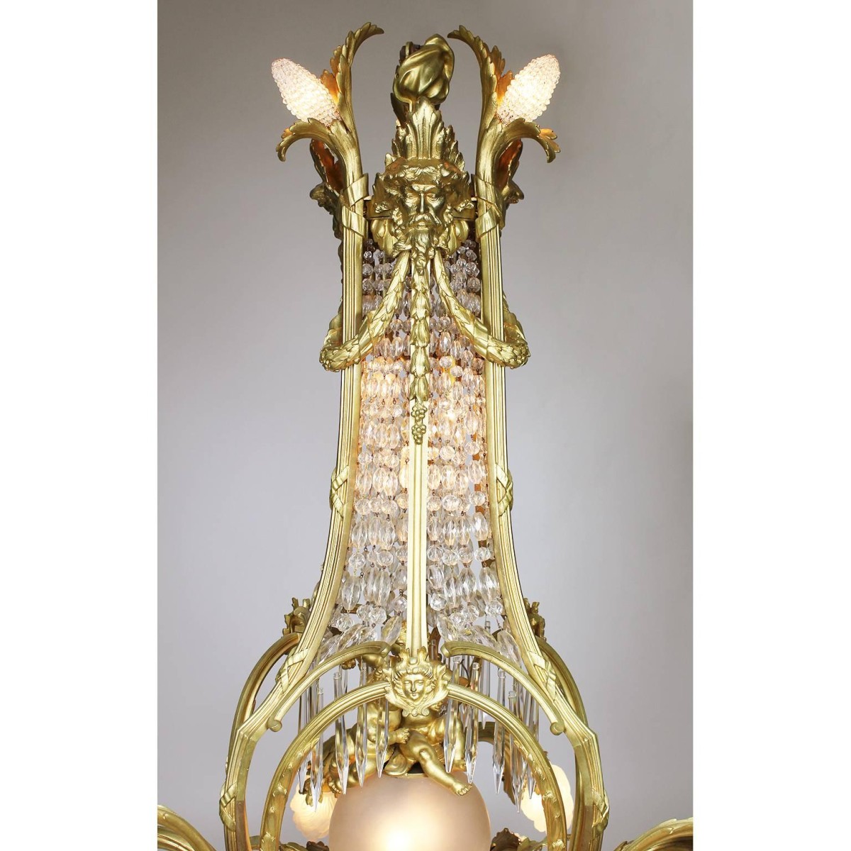 A large and rare French Belle Epoque gilt bronze and cut-glass twenty-four light figural chandelier. The elongated gilt bronze frame with scrolled floral arms protruding from the lower section with frosted glass shades and beaded glass bulb covers; centered with a lit blown frosted-glass sphere crowed with a gilt bronze allegorical group of a seated cupid (cherub), with his bow and arrow satchel, next to a playful seated Putto. The arched and caged center section surmounted with female masks and cut-glass prisms drops. The bowed and caged upper section surmounted with strands of cut beaded-glass below gilt bronze wreaths, male masks and fluted floral lights.