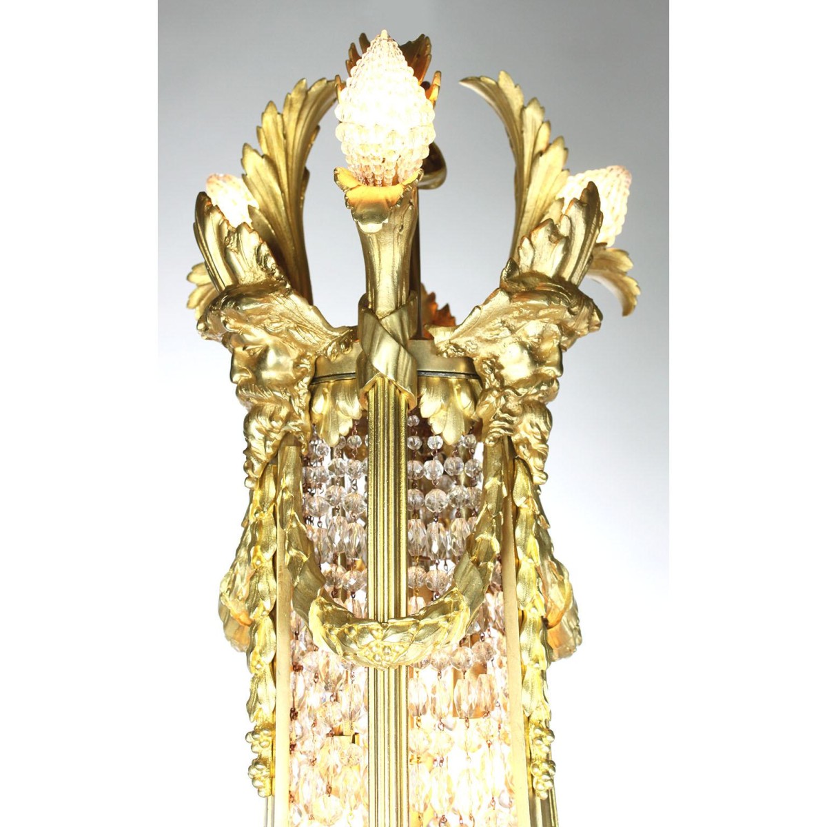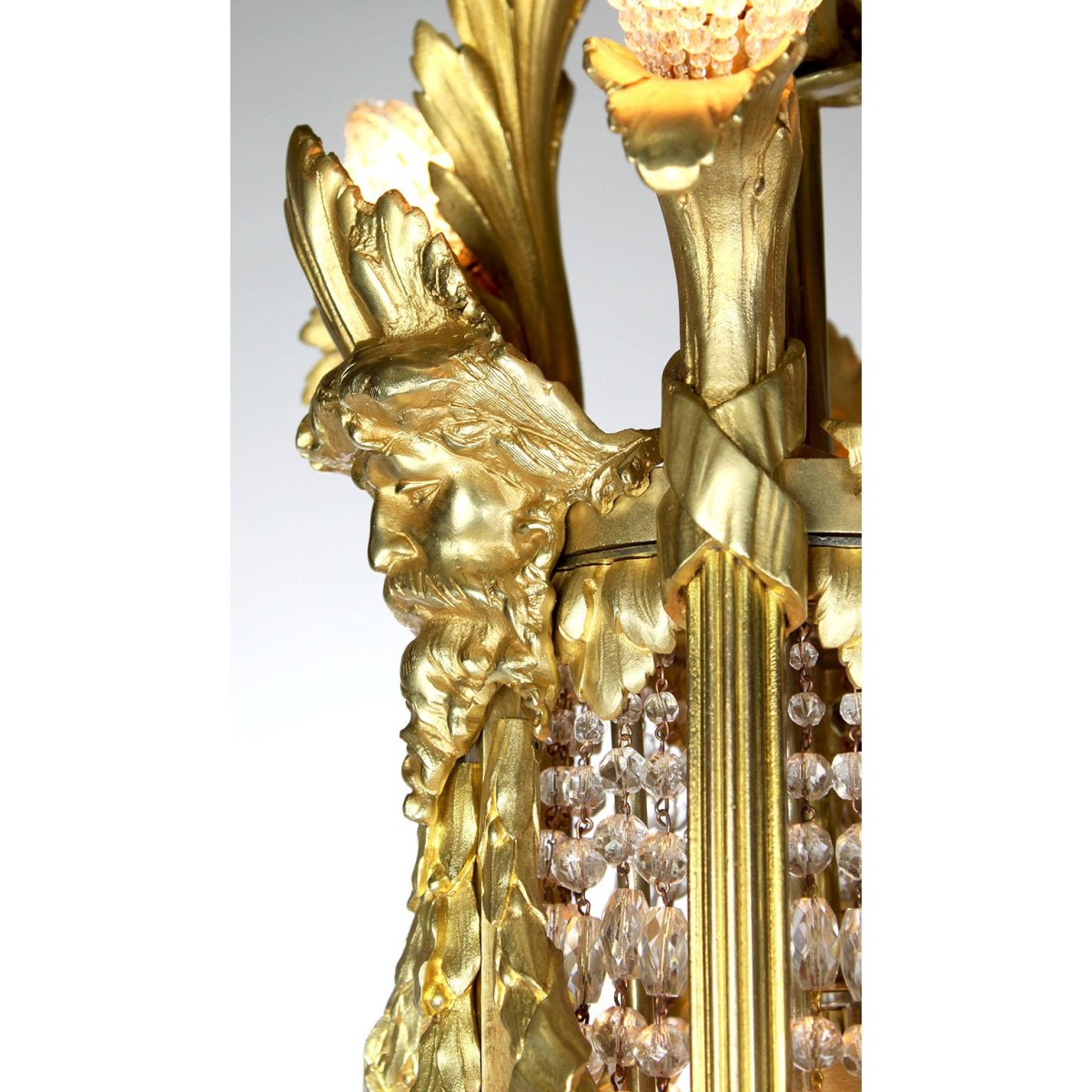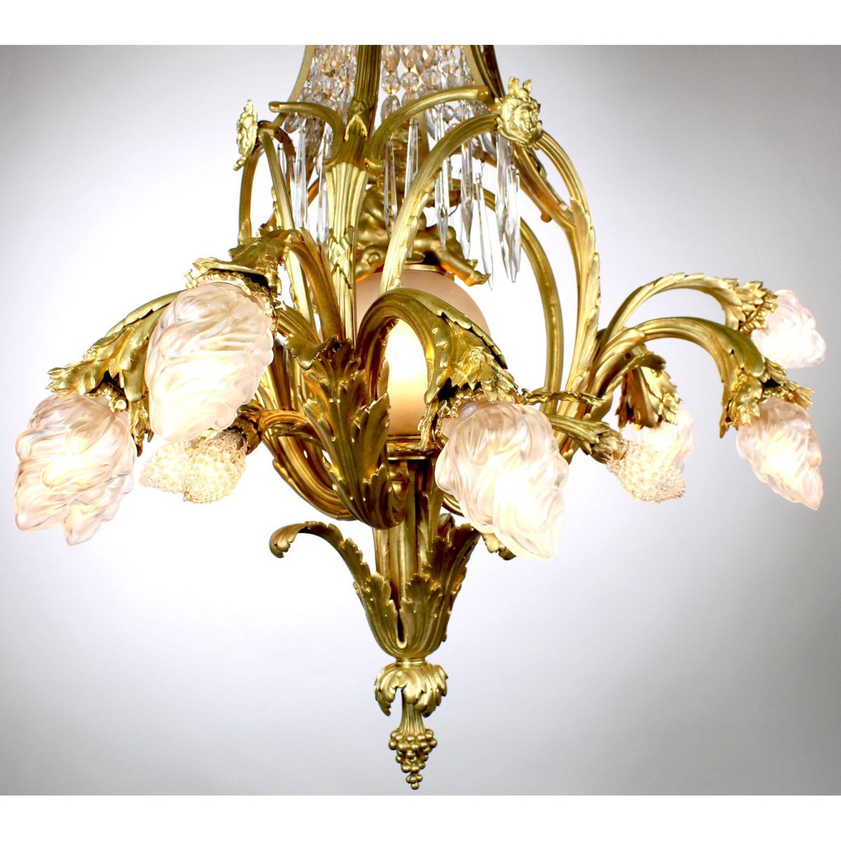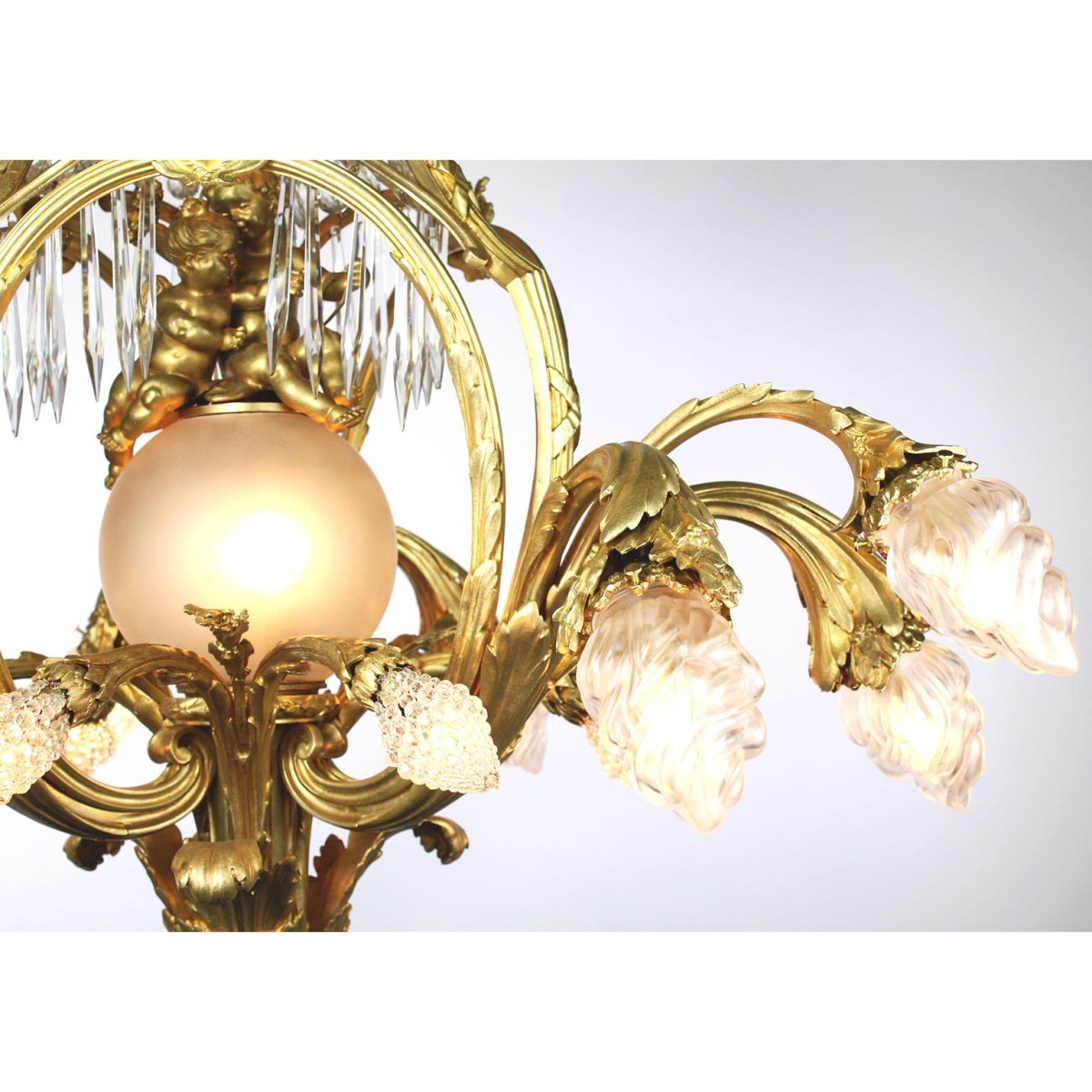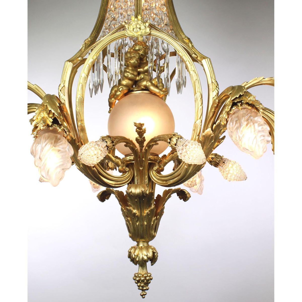 A large and rare French Belle Epoque gilt bronze and cut-glass twenty-four light figural chandelier. The elongated gilt bronze frame with scrolled floral arms protruding from the lower section with frosted glass shades and beaded glass bulb covers; centered with a lit blown frosted-glass sphere crowed with a gilt bronze allegorical group of a seated cupid (cherub), with his bow and arrow satchel, next to a playful seated Putto. The arched and caged center section surmounted with female masks and cut-glass prisms drops. The bowed and caged upper section surmounted with strands of cut beaded-glass below gilt bronze wreaths, male masks and fluted floral lights.