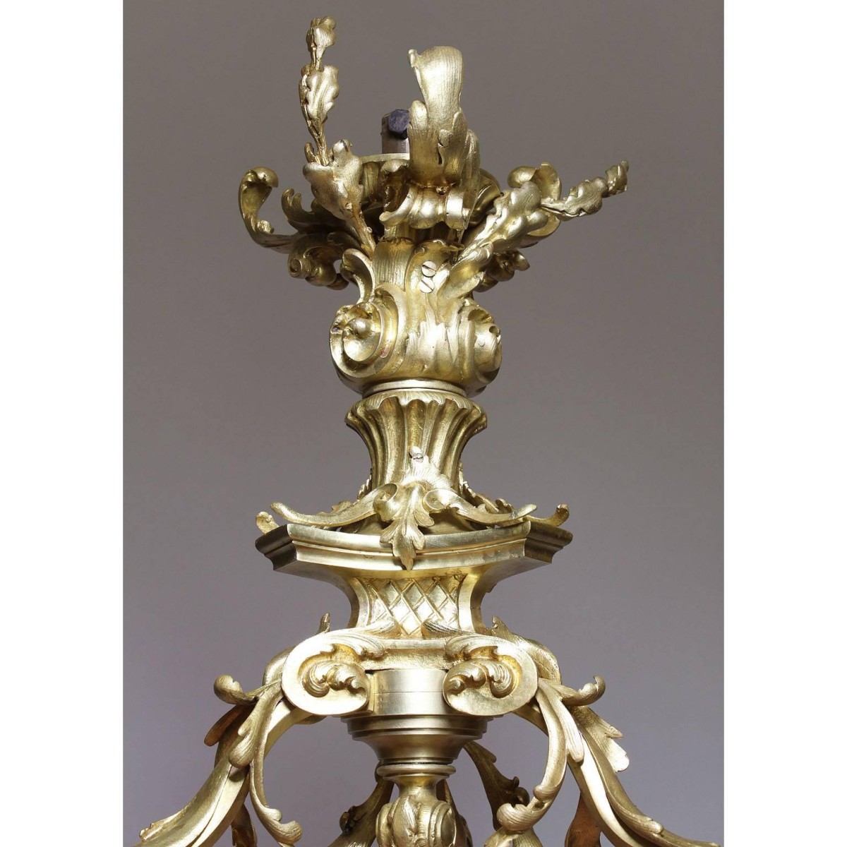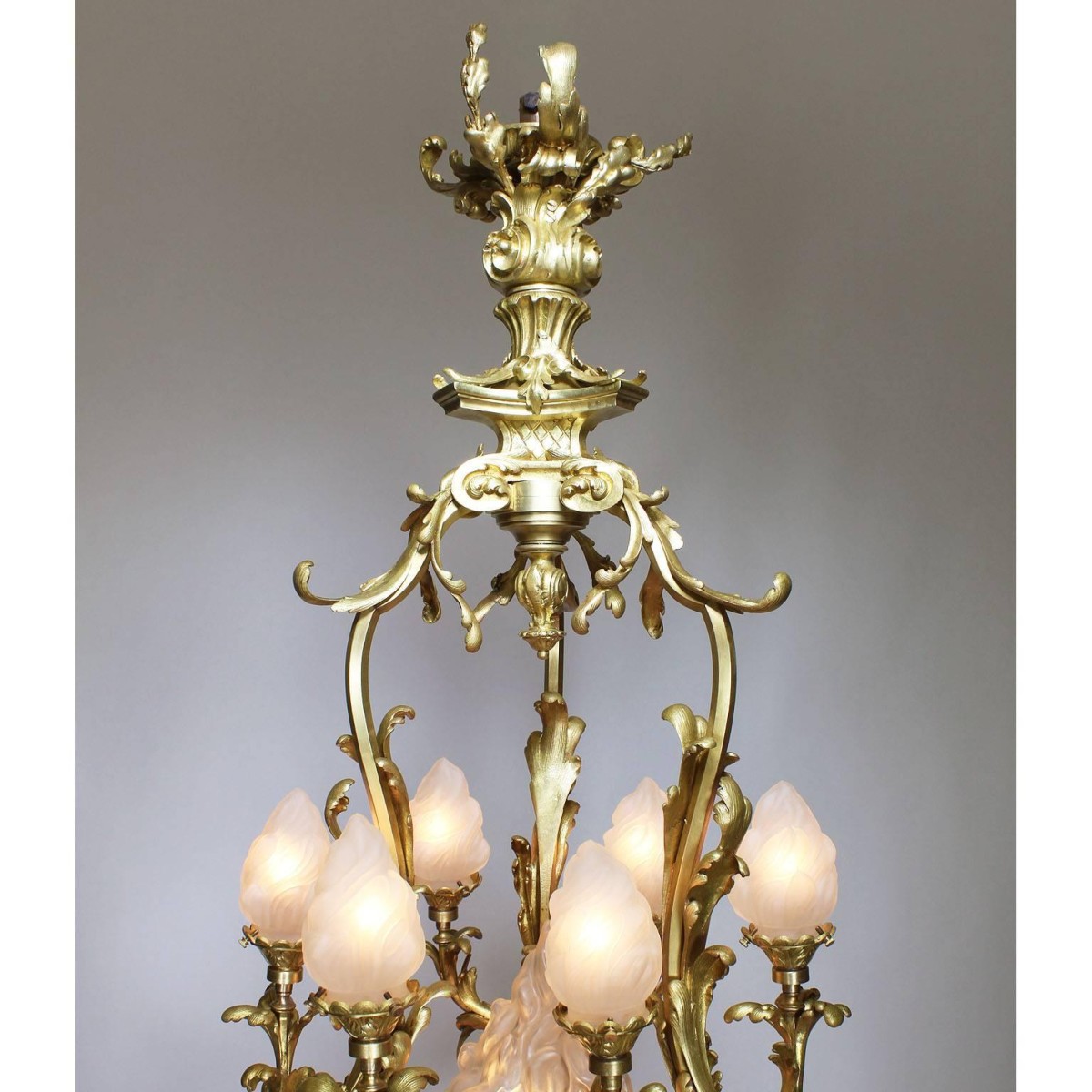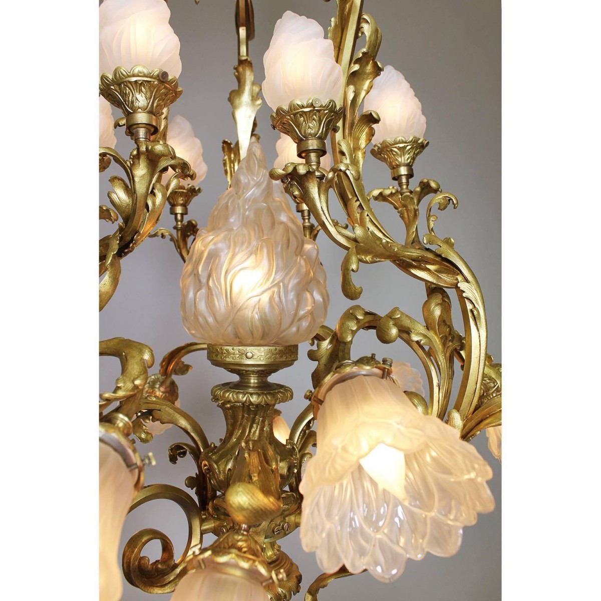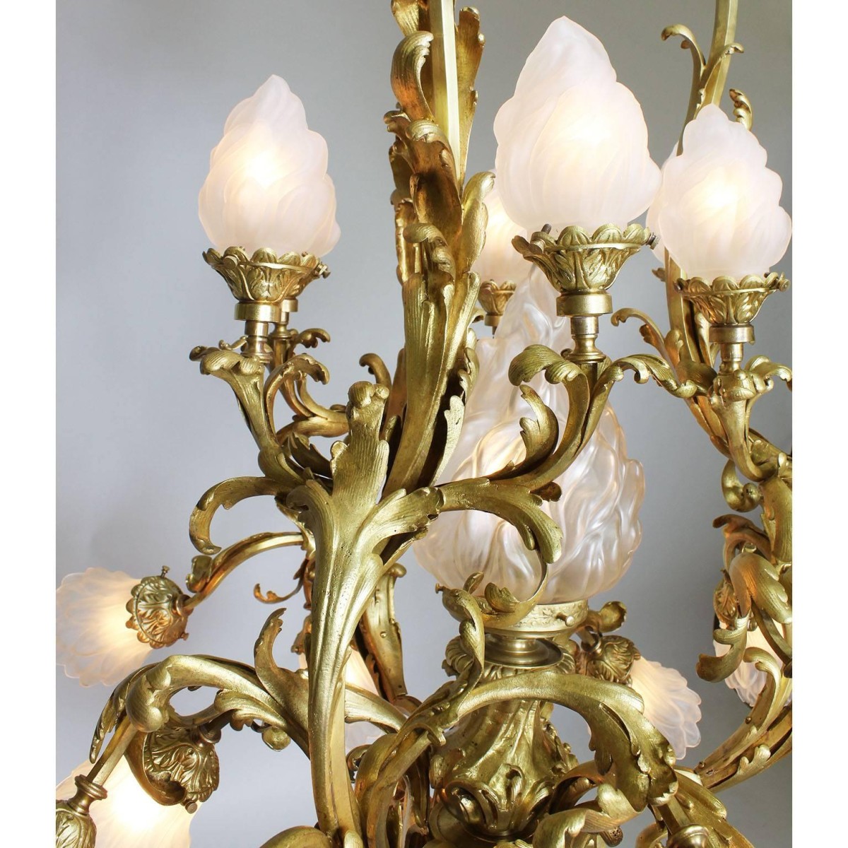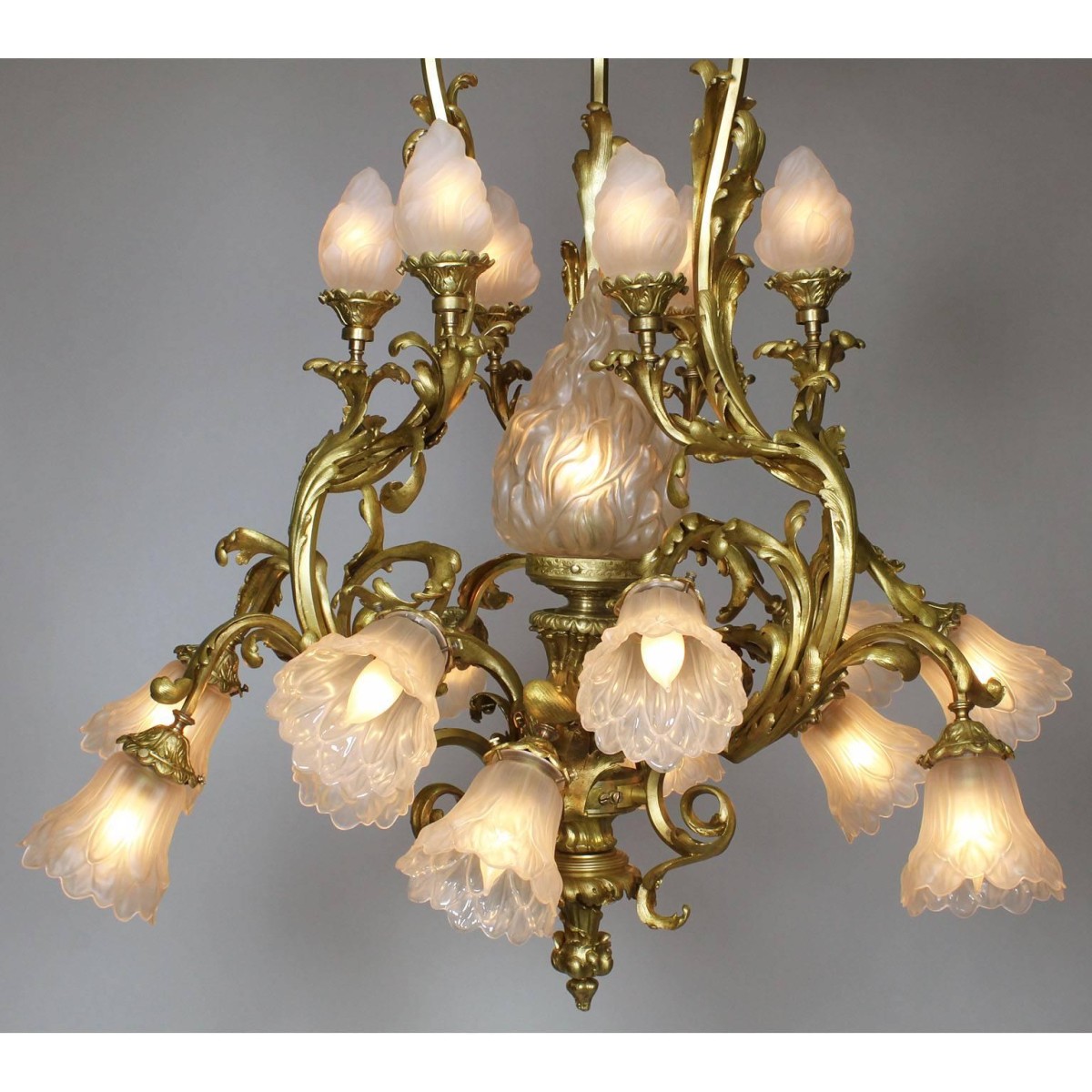 A fine French Belle Epoque Rococo style gilt bronze and frosted glass shades nineteen light chandelier. The ornate gilt bronze frame surmounted six upper scrolled candle arms with frosted glass shades in the form of burning flames centered with a larger single flame glass shade, all above the lower twelve scrolled candle arms with frosted glass shades in the form of flowers, Paris, circa 1900.