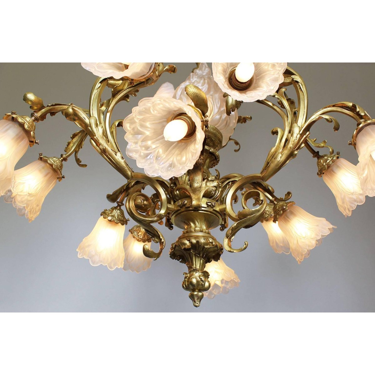 IQ4345 FRENCH BELLE EPOQUE ROCOCO STYLE GILT-BRONZE AND FROSTED GLASS SHADES CHANDELIER