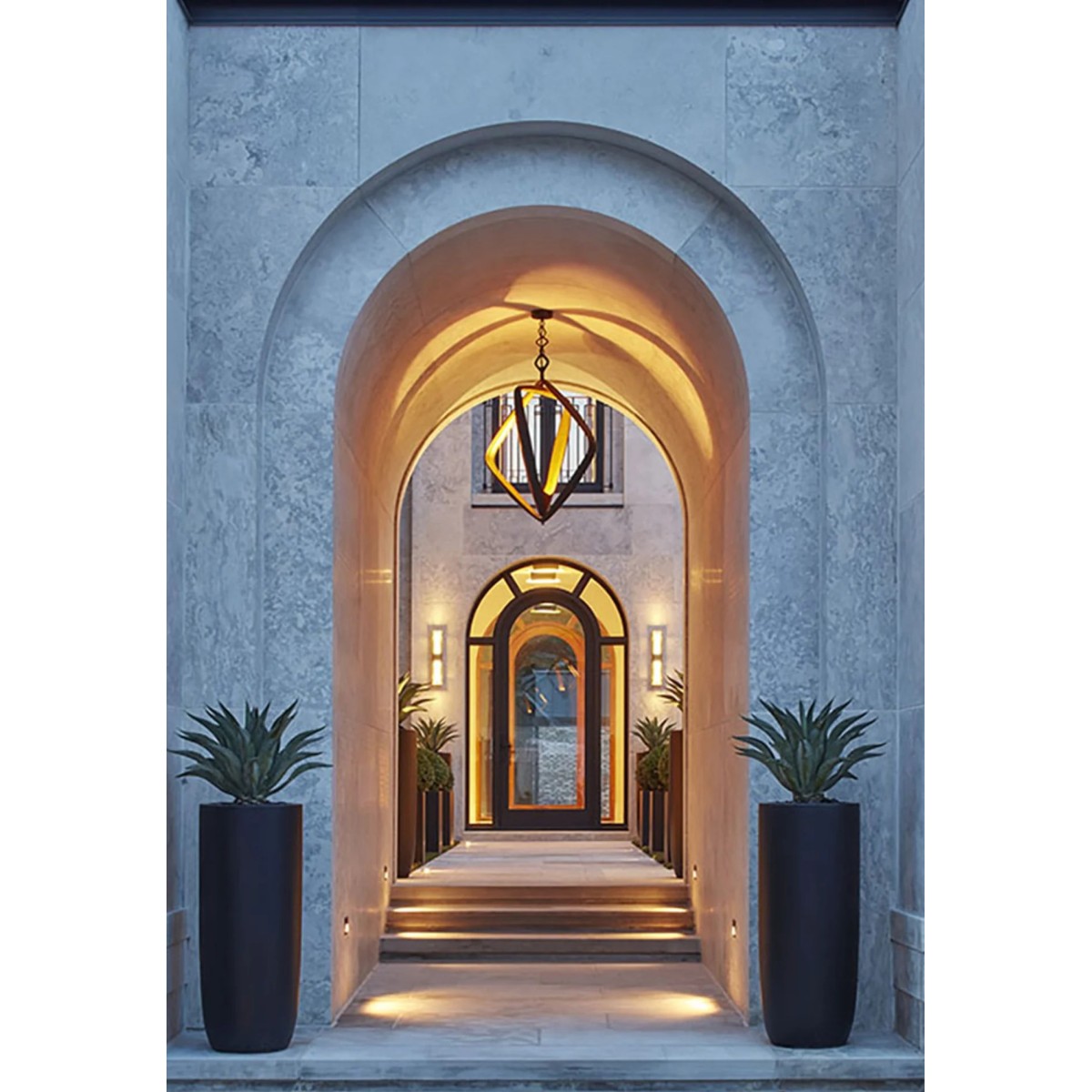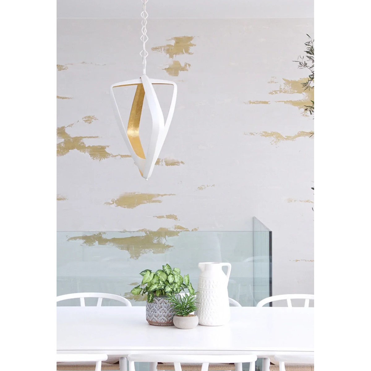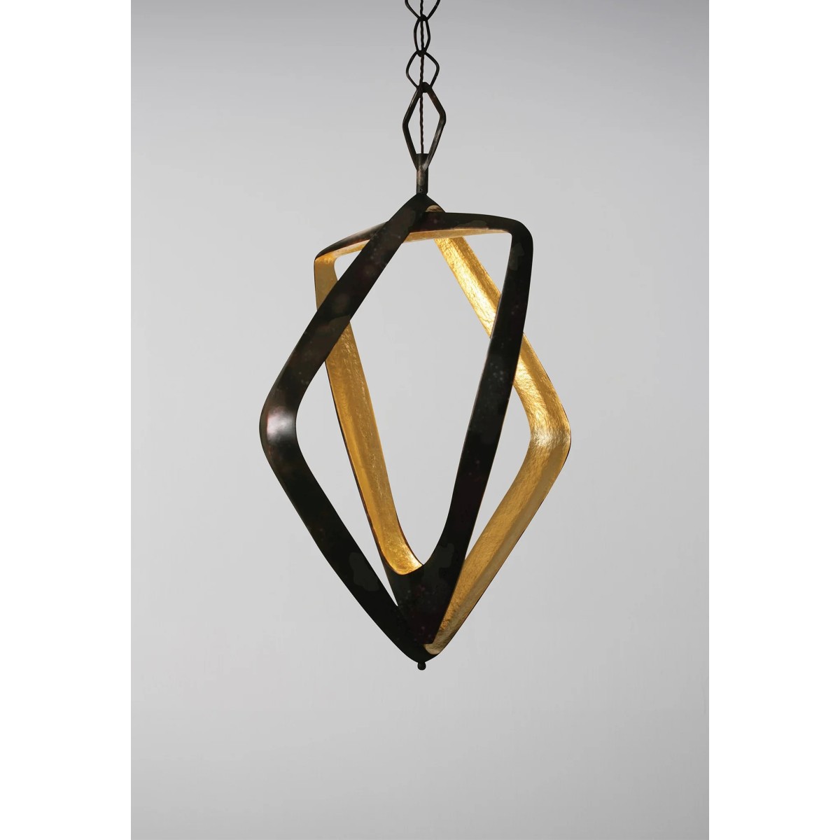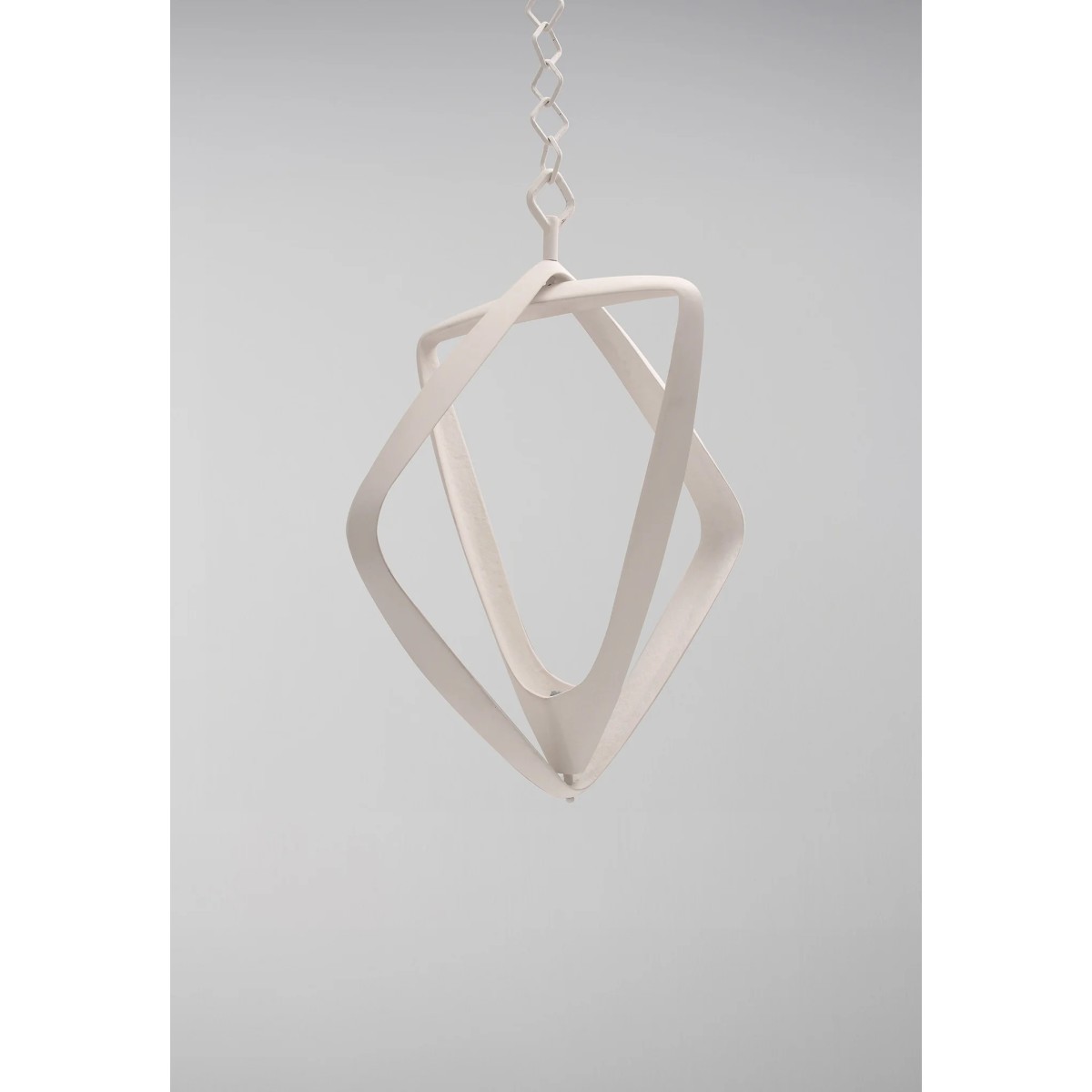 Formed of two interlocking triangular shapes, The Bianca Chandelier is characterised by its gently textured surface and contrast of finishes. The Bianca houses an LED light source that accentuates its dramatic shape. It's minimum drop 40" and maximum drop 78''.