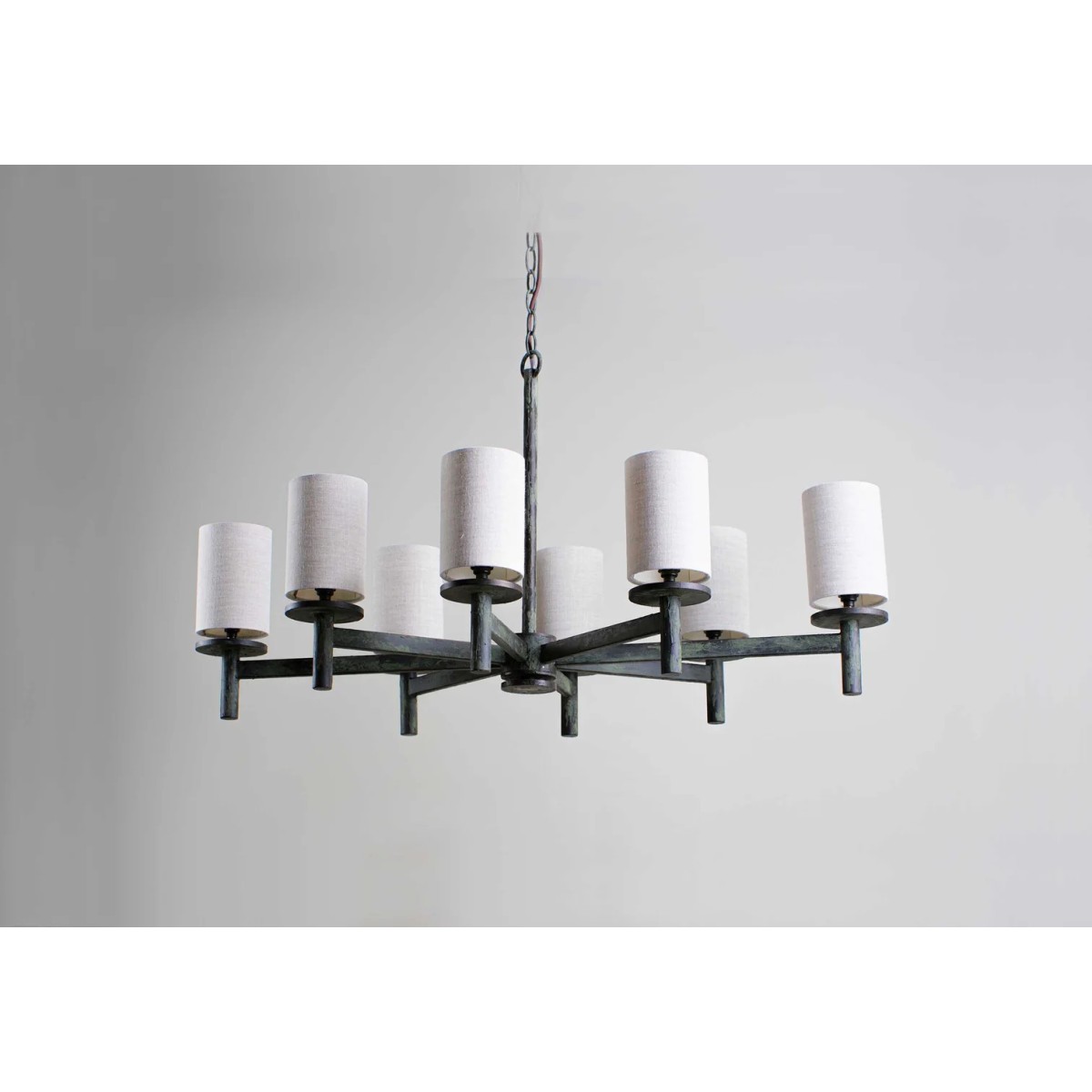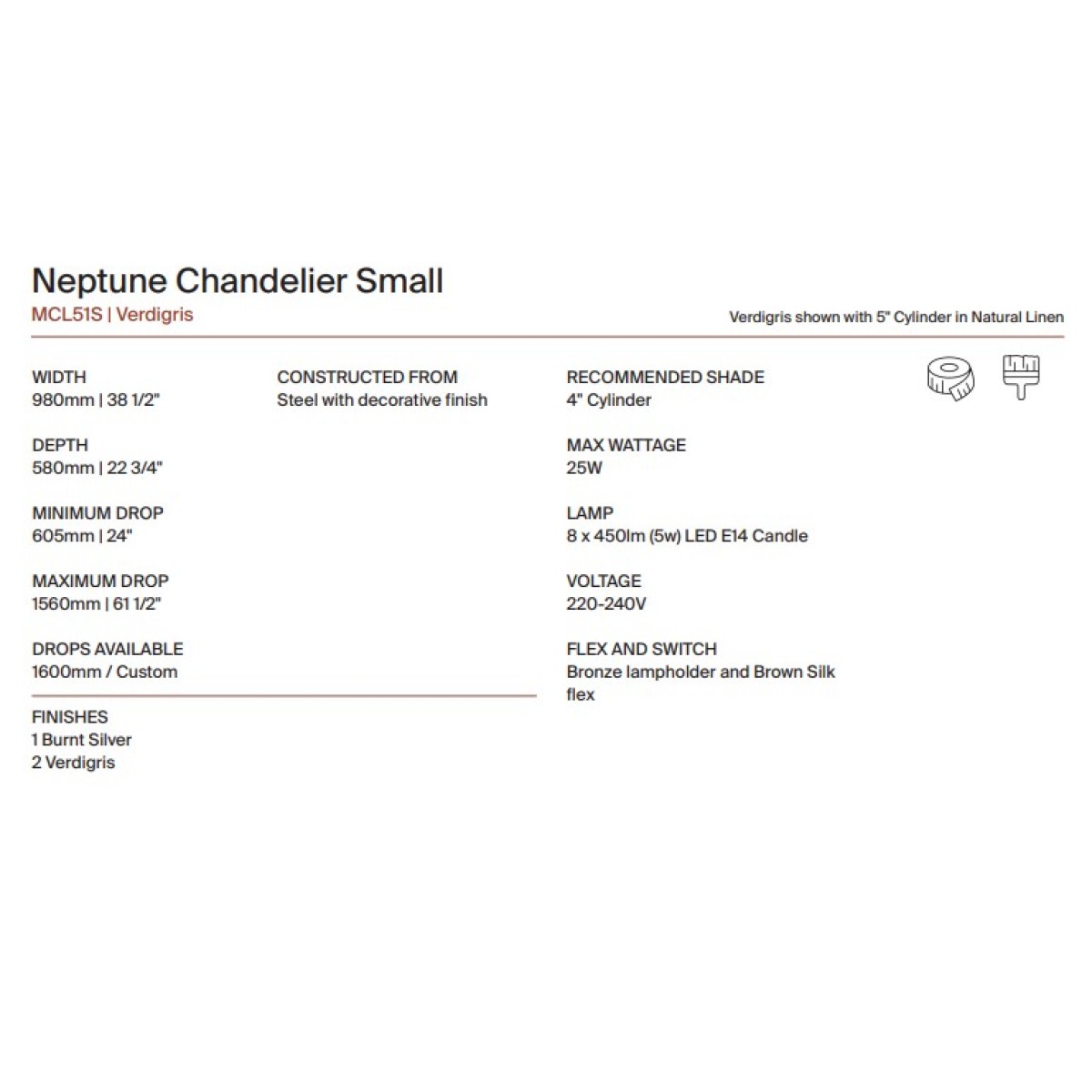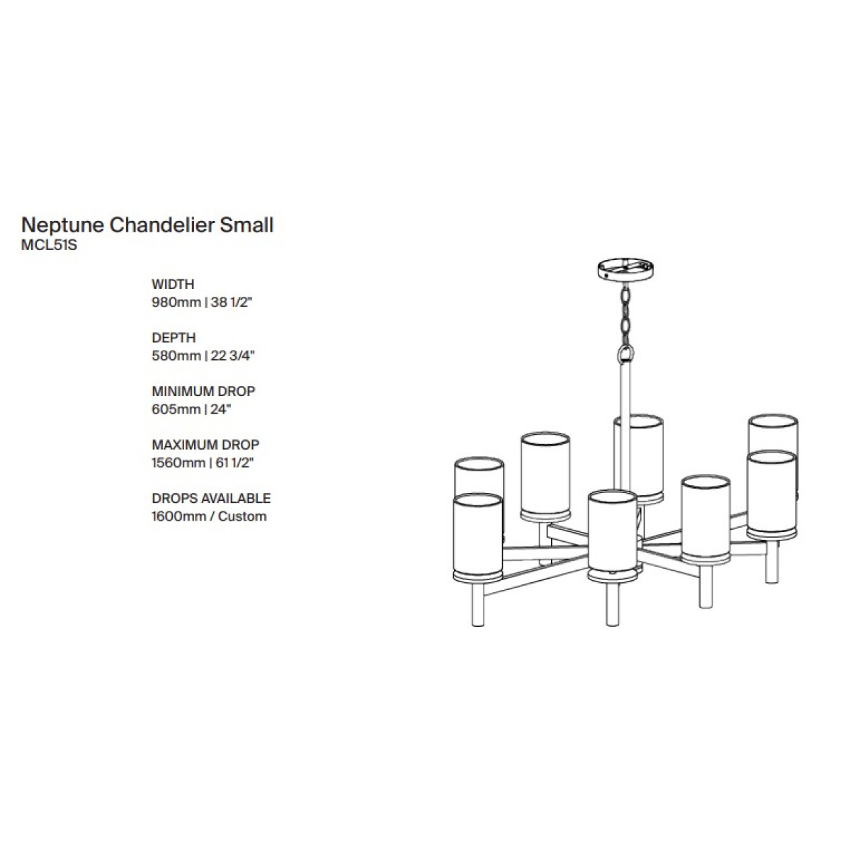 The linear struts of the Neptune Chandelier are symmetrically placed to provide an even distribution of light. The Small Neptune was designed for more intimate spaces with limited headroom. This design can be custom sized. It's minimum drop 24'', maximum drop 61'' and drops available 63'' (Custom) also recommended shade 4" cylinder.