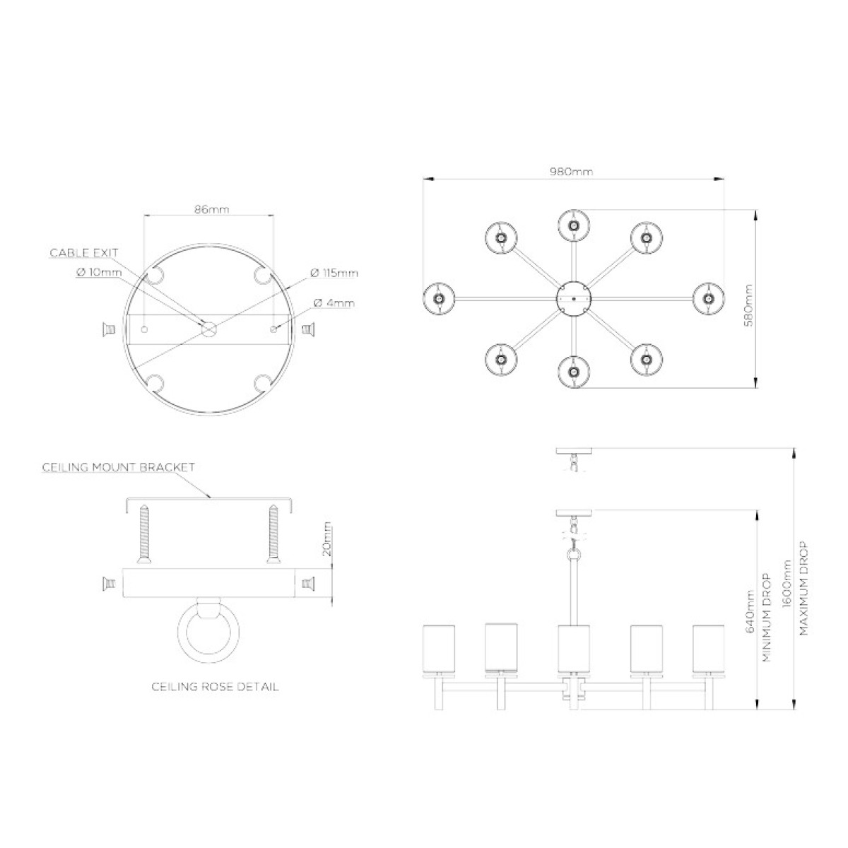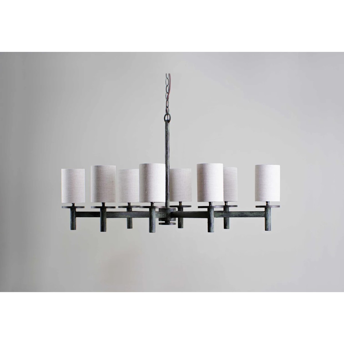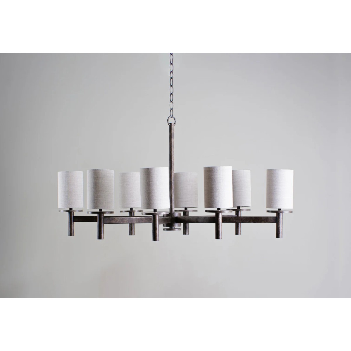 The linear struts of the Neptune Chandelier are symmetrically placed to provide an even distribution of light. The Small Neptune was designed for more intimate spaces with limited headroom. This design can be custom sized. It's minimum drop 24'', maximum drop 61'' and drops available 63'' (Custom) also recommended shade 4" cylinder.