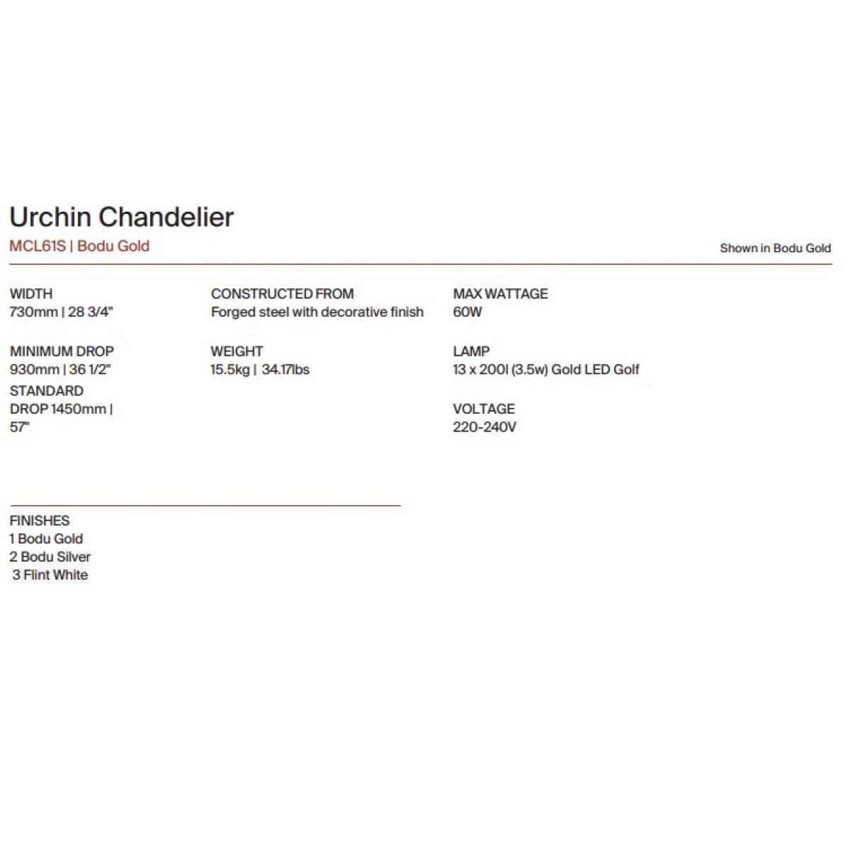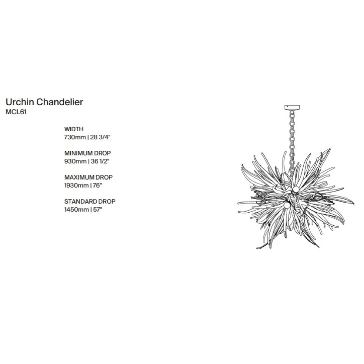 The inspiration for the Urchin Chandelier came from the form of a Turkish hazel seed pod. 13 hand-formed steel elements are created, before being painstakingly decorated by hand in our workshop. This design can be custom sized. It's maximum drop 57" and minimum drop 36".