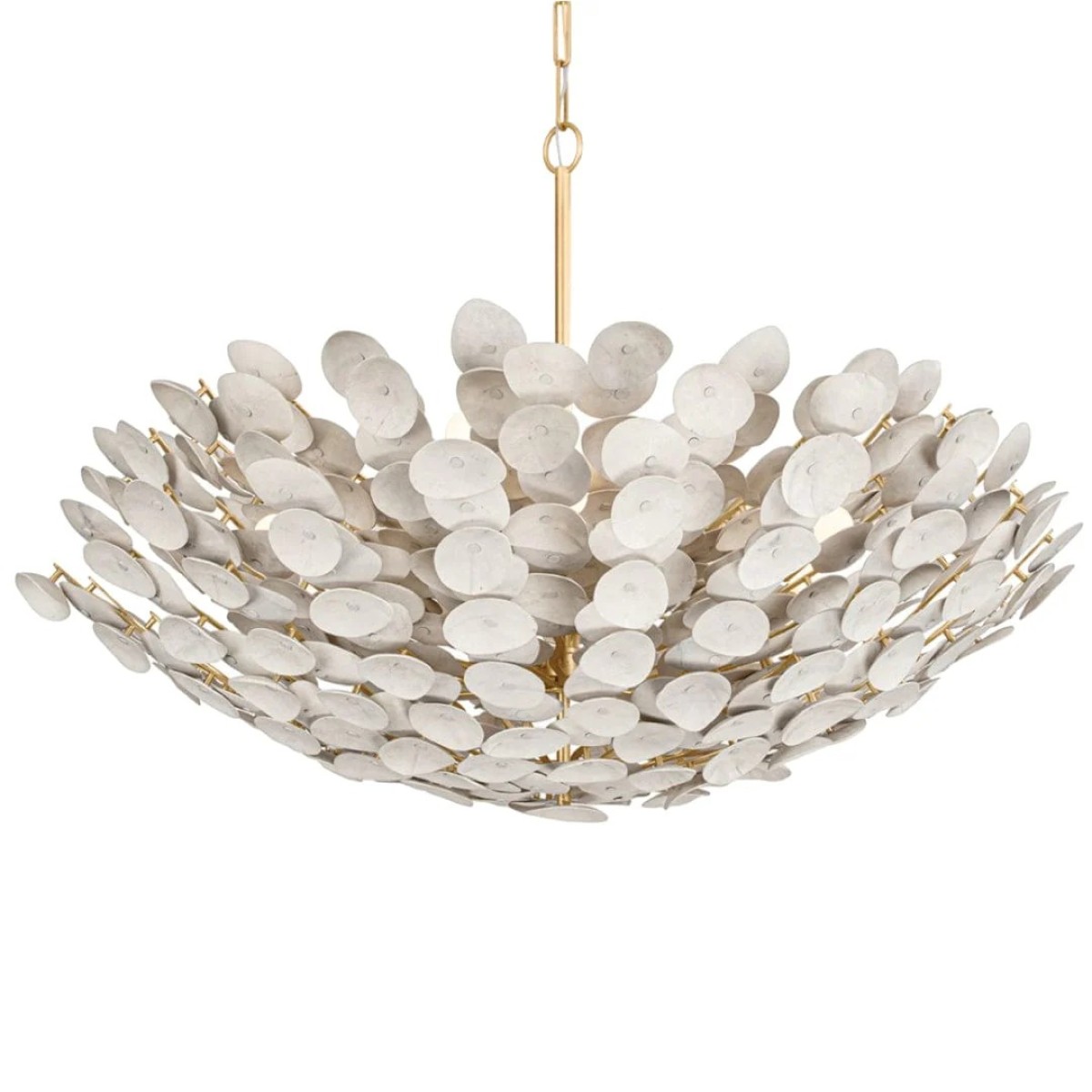 Delicate discs of white-washed coco shells surround a Vintage Gold Leaf frame creating a form that feels both organic and high end. Add a soothing, luxe look to any ceiling with this modern semi-flush and chandelier.