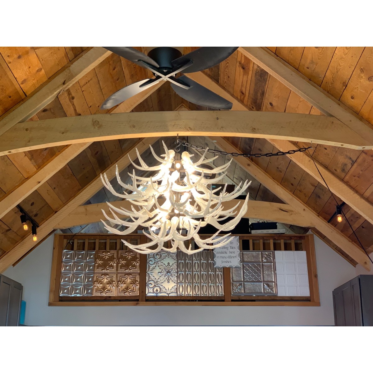 North Rim Glass Jared & Nicole Davis Glass Antler Chandelier-Ivory, 2019 Hand Blown Glass. This 4 tier chandelier contains 24 glass antlers. These antlers are not made with a mold and are not solid but are hand blown and hand sculpted, making each individual antler unique. The fixture is made of forged steel by our on site metal smith and has a dark bronze patina. It is UL approved and contains 12 candelabra based, dimmable, LED bulbs. Custom colors and sizes are available.