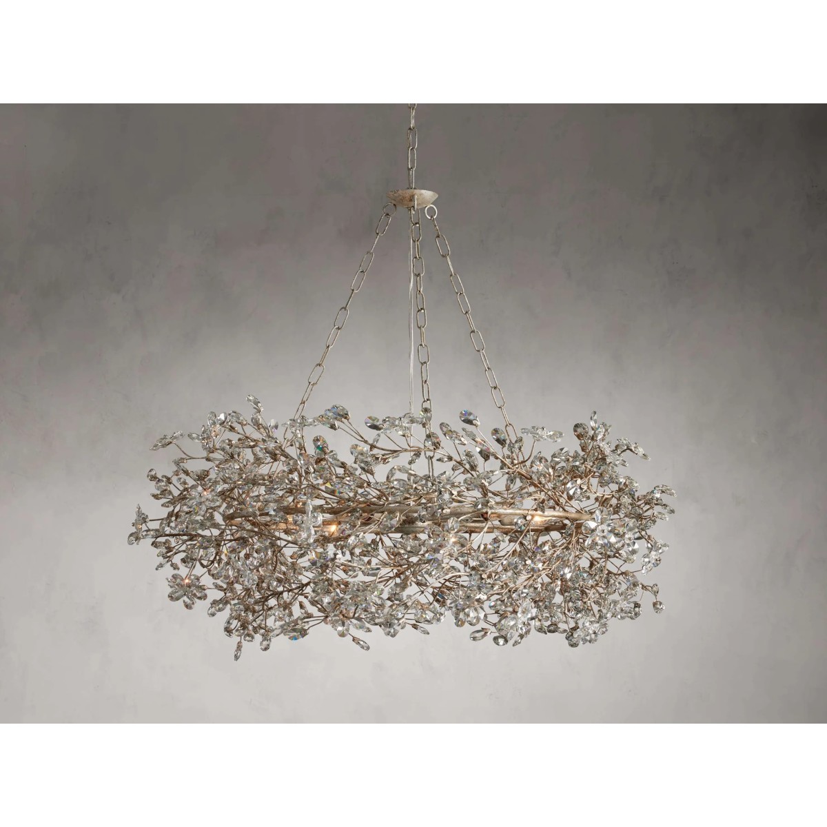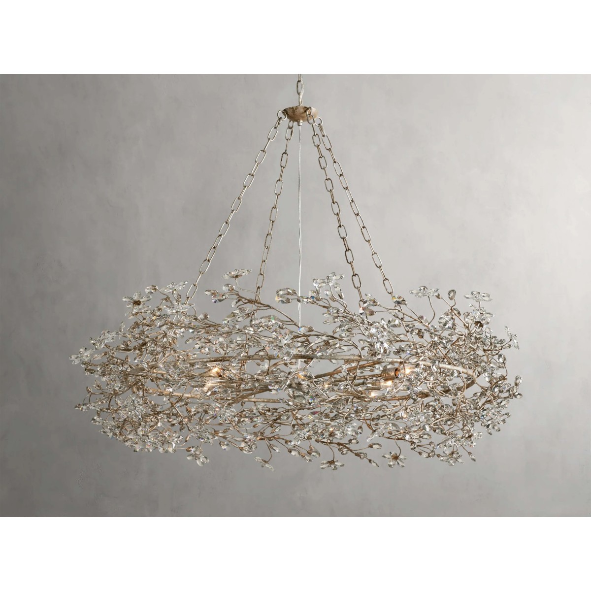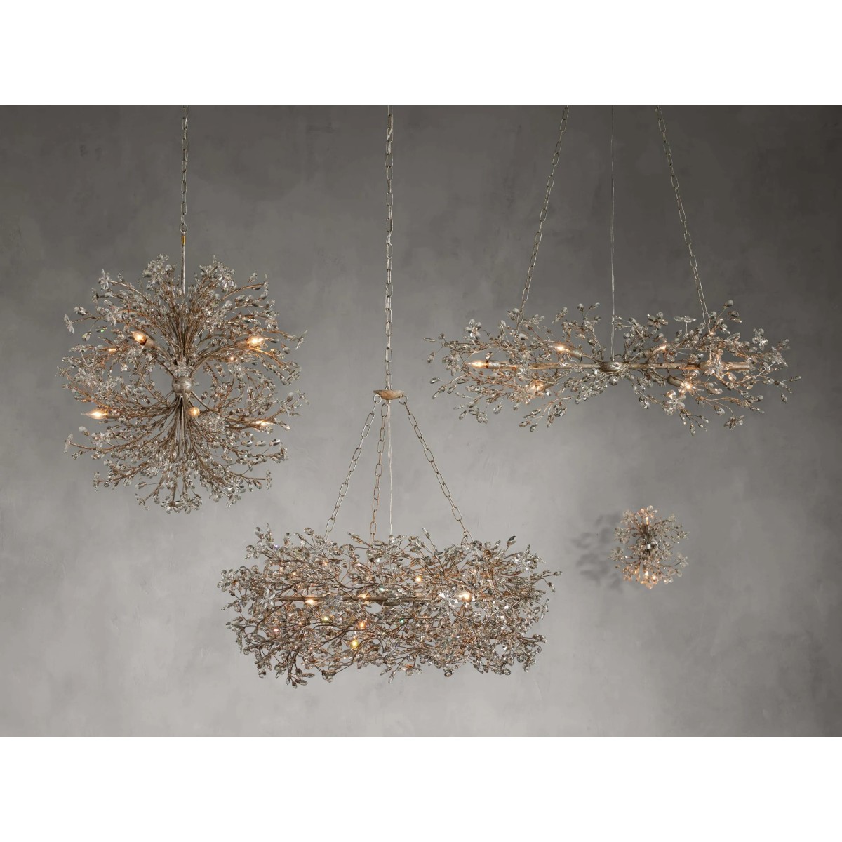 Crafted by artisan partners in Italy from iron hand-finished with silver or gold leaf, this chandelier uses eight 40-watt max E12 bulbs (not included), with a recommendation for LED Candelabra E12 bulbs (6610071B134). The adjustable drop length ranges from 39" to 183", and it can be mounted on a vaulted ceiling. The iron chain with silver or gold finish measures 144" long, while the clear PVC cord also measures 144" long. The canopy measures 5.75" in diameter and 1.75" high. Hardwired with professional installation recommended, this piece is safety tested for use in bathrooms, covered patios, or areas with temporary humidity and moisture.