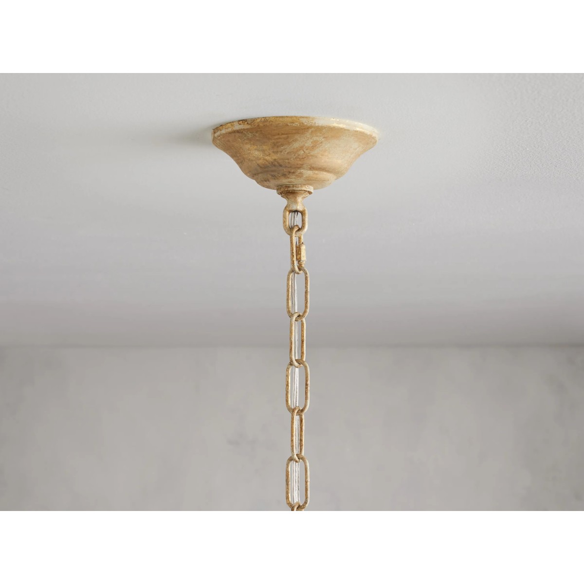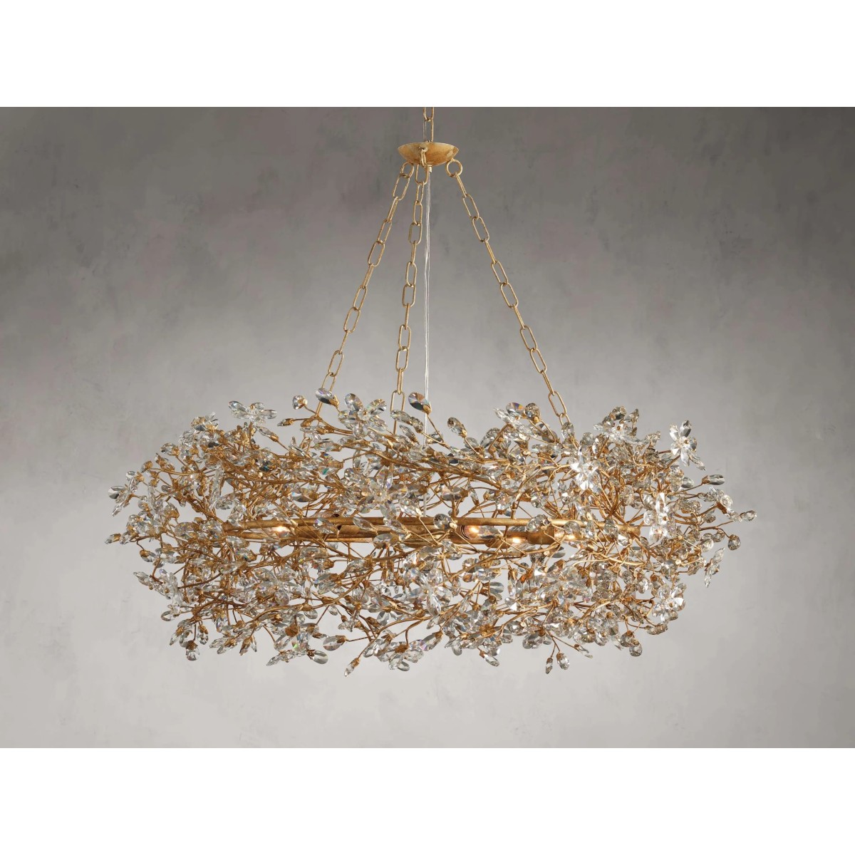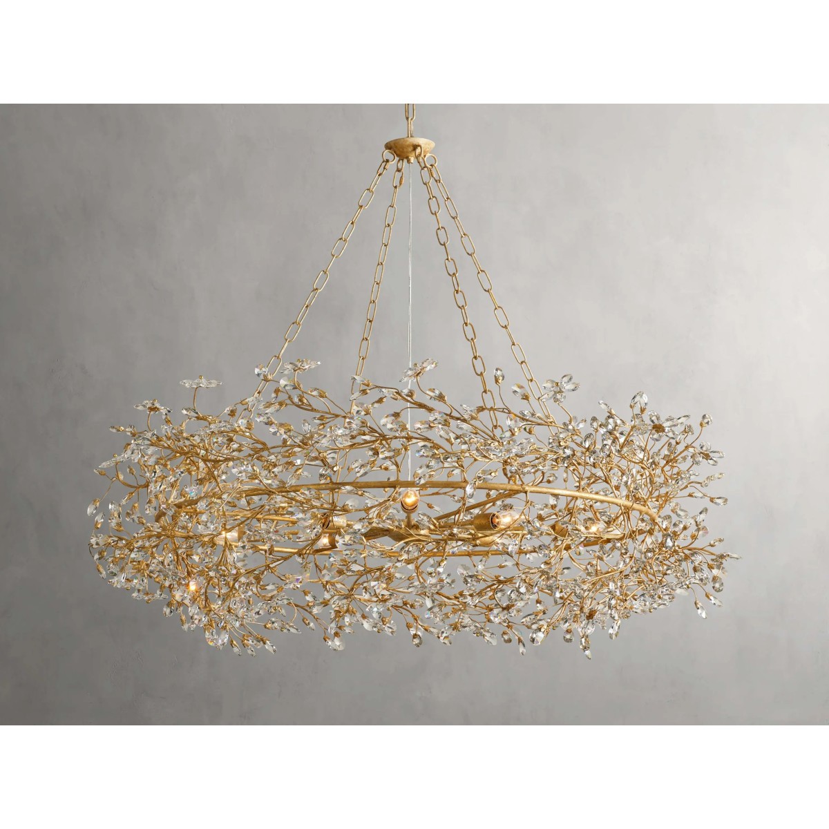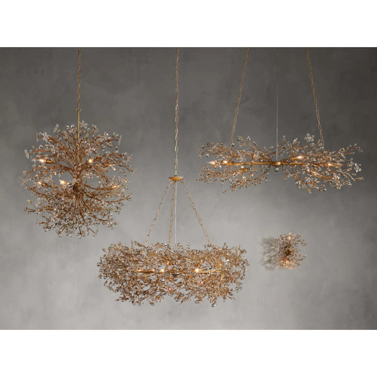 Crafted by artisan partners in Italy from iron hand-finished with silver or gold leaf, this chandelier uses eight 40-watt max E12 bulbs (not included), with a recommendation for LED Candelabra E12 bulbs (6610071B134). The adjustable drop length ranges from 39" to 183", and it can be mounted on a vaulted ceiling. The iron chain with silver or gold finish measures 144" long, while the clear PVC cord also measures 144" long. The canopy measures 5.75" in diameter and 1.75" high. Hardwired with professional installation recommended, this piece is safety tested for use in bathrooms, covered patios, or areas with temporary humidity and moisture.