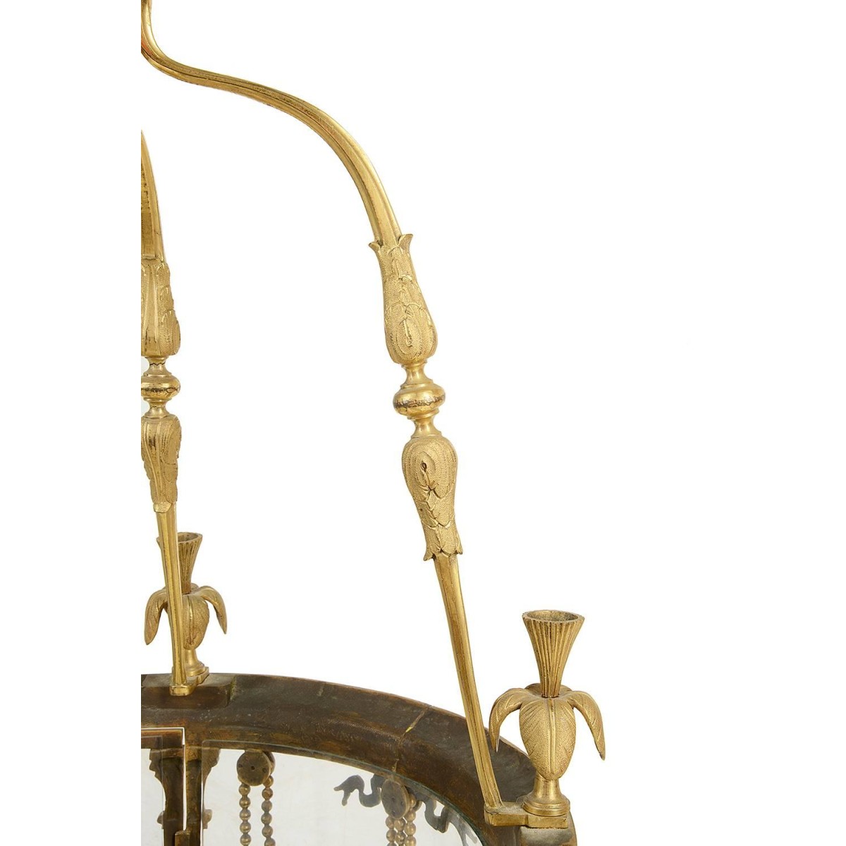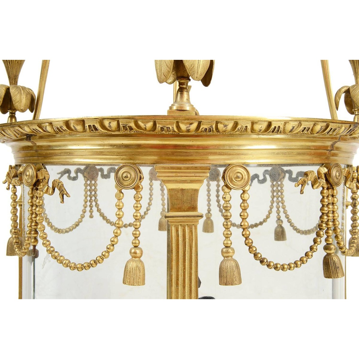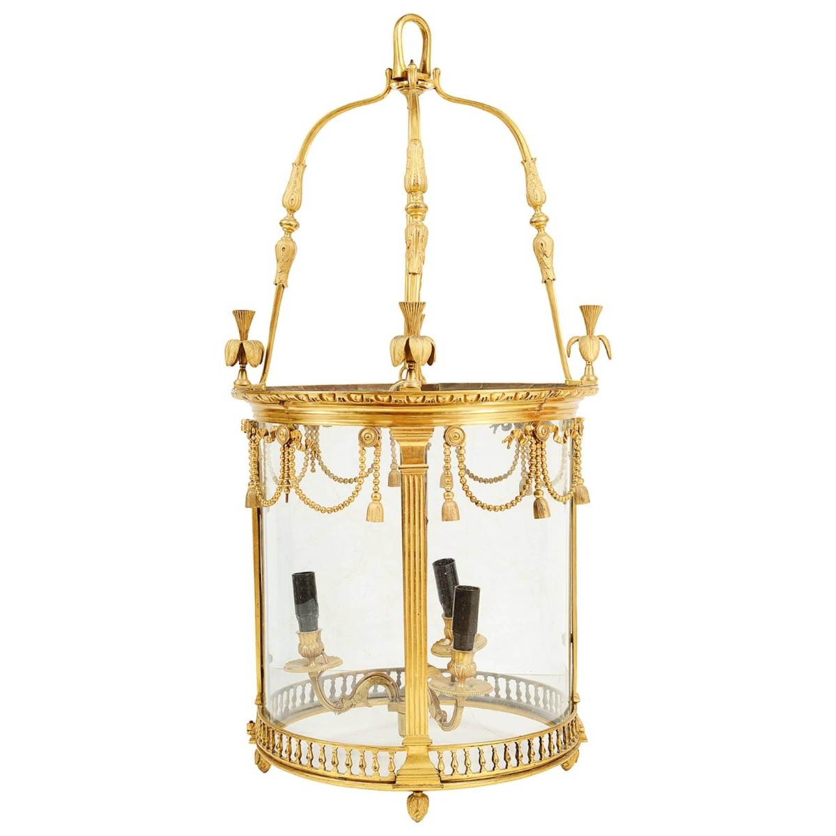 A good quality French, late 19th century brass hall lantern, having swag and tassel decoration, fluted columns and a gallery to the base. Bowed glass panels and a three branch sconce to the centre.