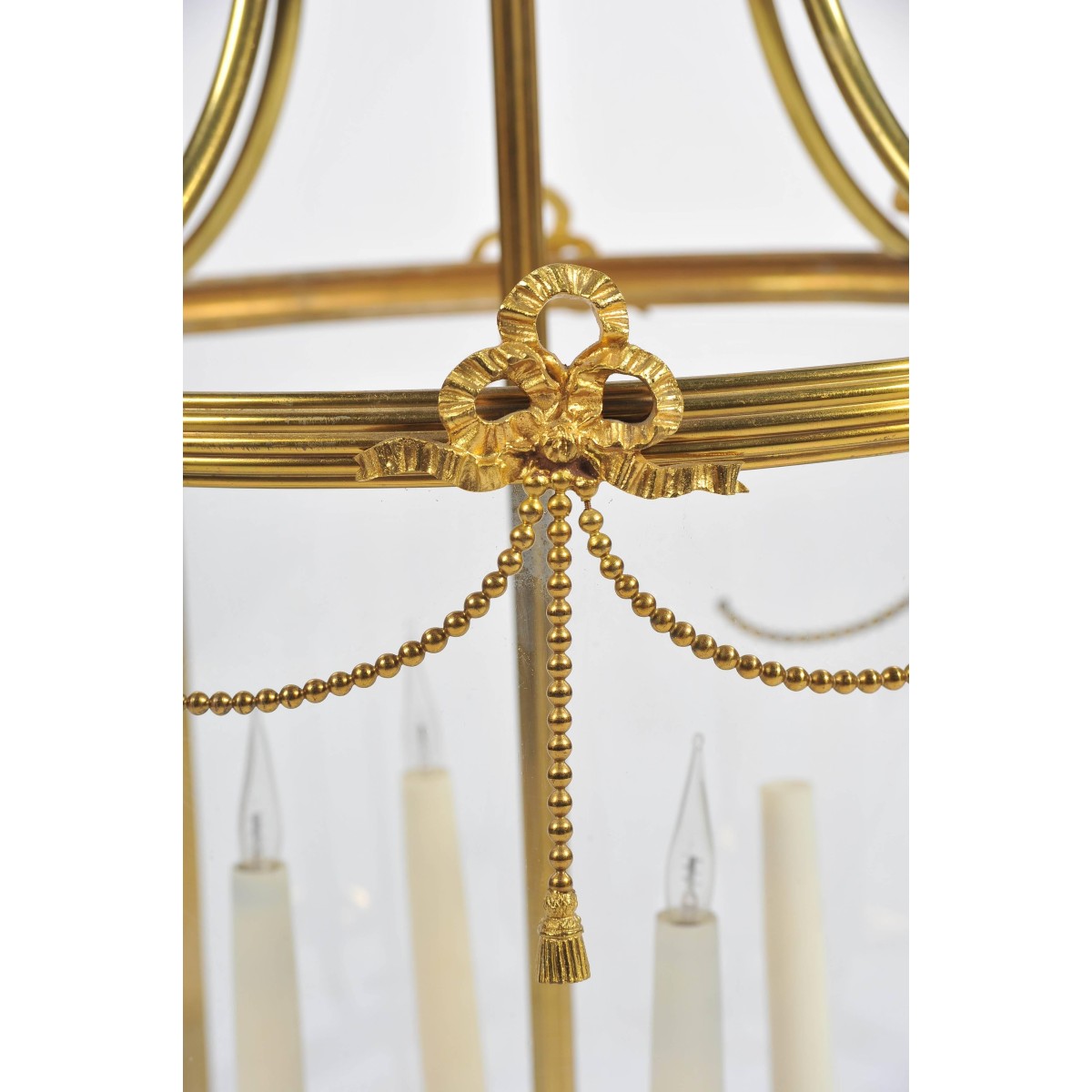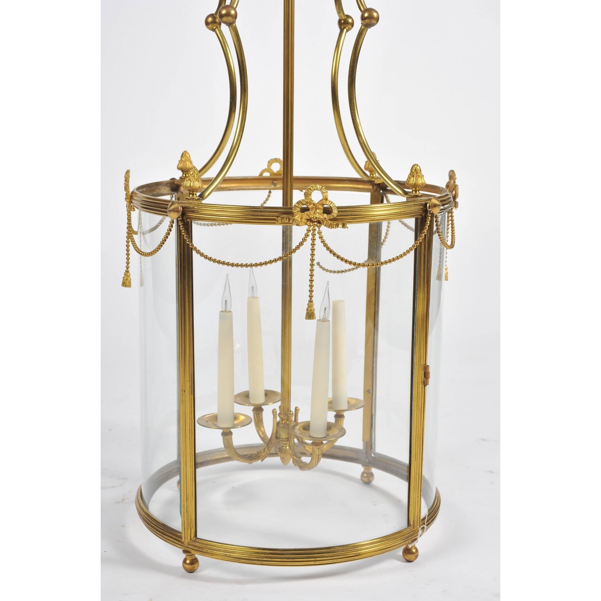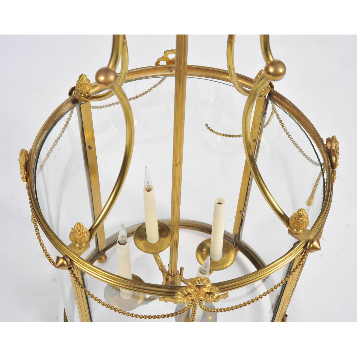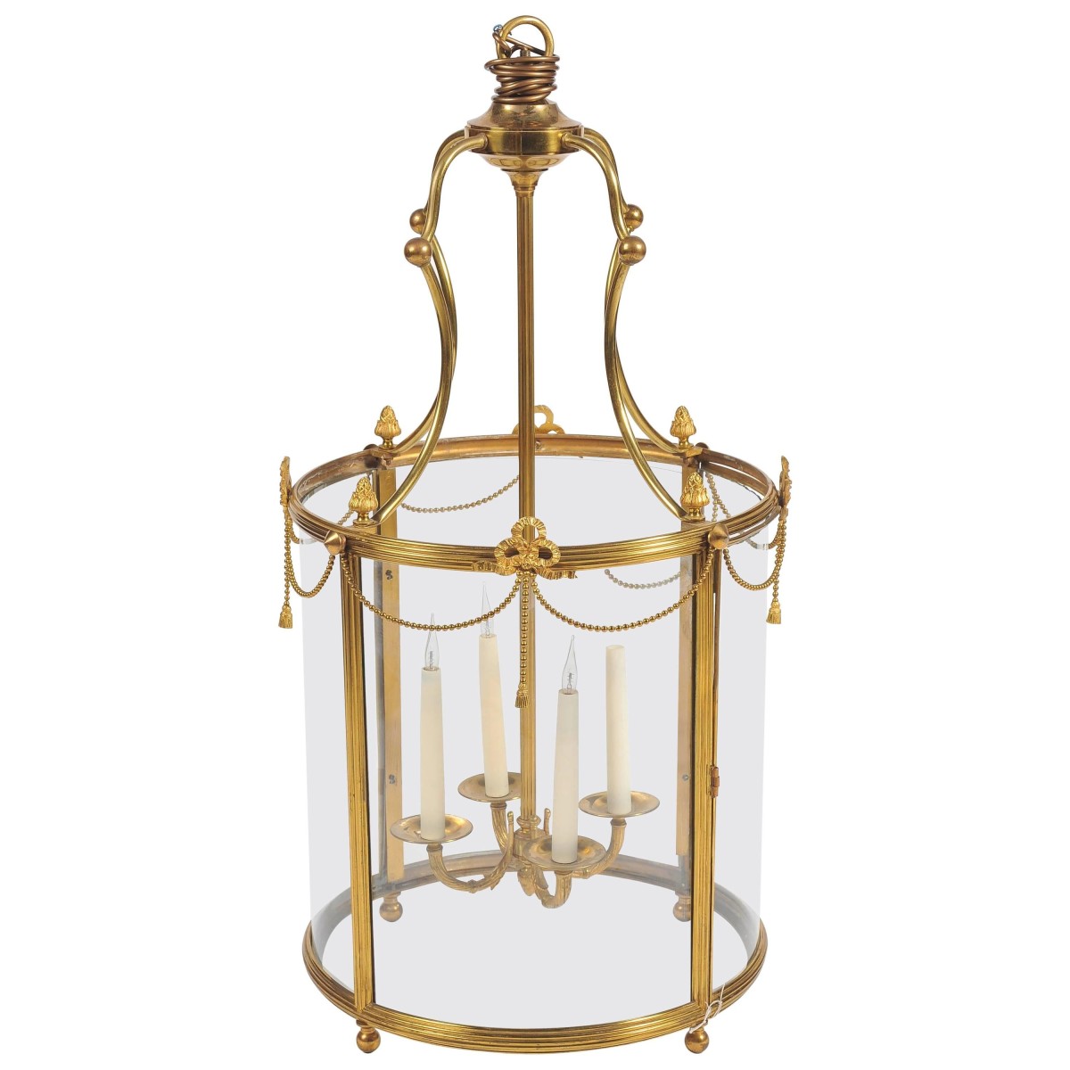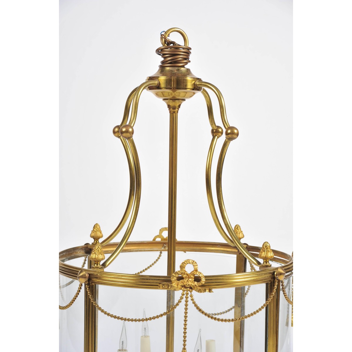 A good quality Regency style brass hall lantern, having bowed glass panels swag and ribbon decoration and a four branch sconce within.
