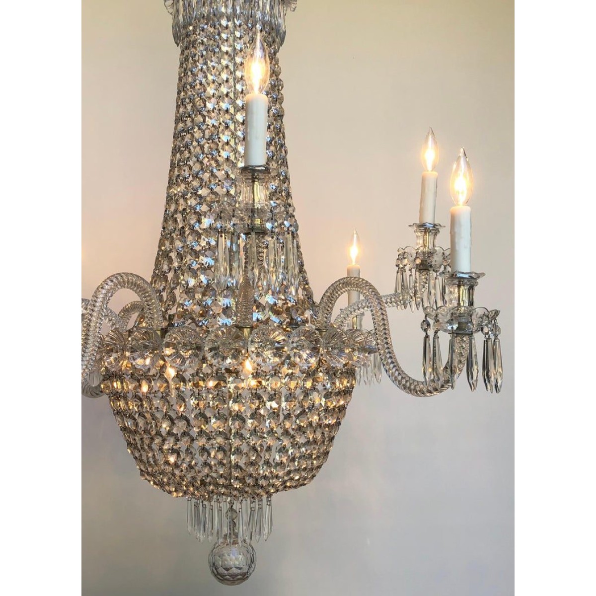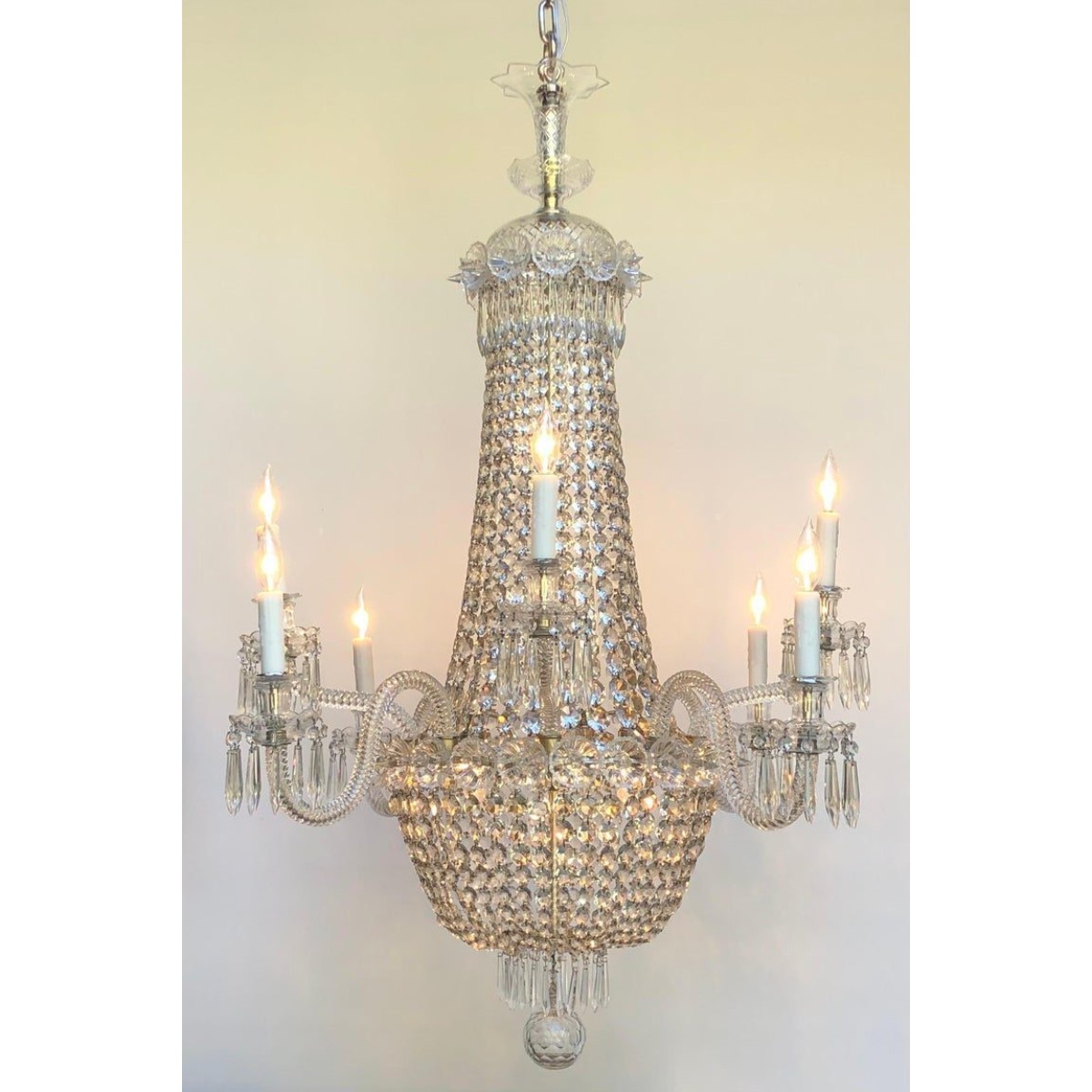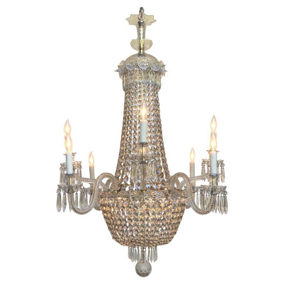 Elegant Silver Plate & Crystal Regency Tent-and-Basket Chandelier / Gasolier with Eight crystal arms, made in England in the mid Nineteenth Century. The Regency Chandelier has a three part hand-cut crystal crown with a fluted vase above the Sliver Plated Ring banded with elaborate crystal flowering rosettes above the Tent-and-Basket body. The Tent-and-Basket Gasolier Body has a Silver Plated Brass Stem and a Silver Plate Ring for suspension of the faceted crystal hand-pinned chains that make up the Tent and goes down to the Sliver Plate Console banded with elaborate crystal flowering rosettes that mounts the eight crystal arms and suspends the bottom faceted crystal basket down to a small Silver Plate Ring pinned with Crystal French Drops around a handblown faceted Crystal Ball. The eight handblown rope twist arms consist of four s-shaped and four up rope twist arms. Each of the rope twist arms has a crystal bobeche and candle cup. This is truly a work of art. Rewired with UL Listed parts. Replacements made: Some replaced crystal prisms with antique crystal. Wear consistent with age and use. Minor losses. Minor fading.