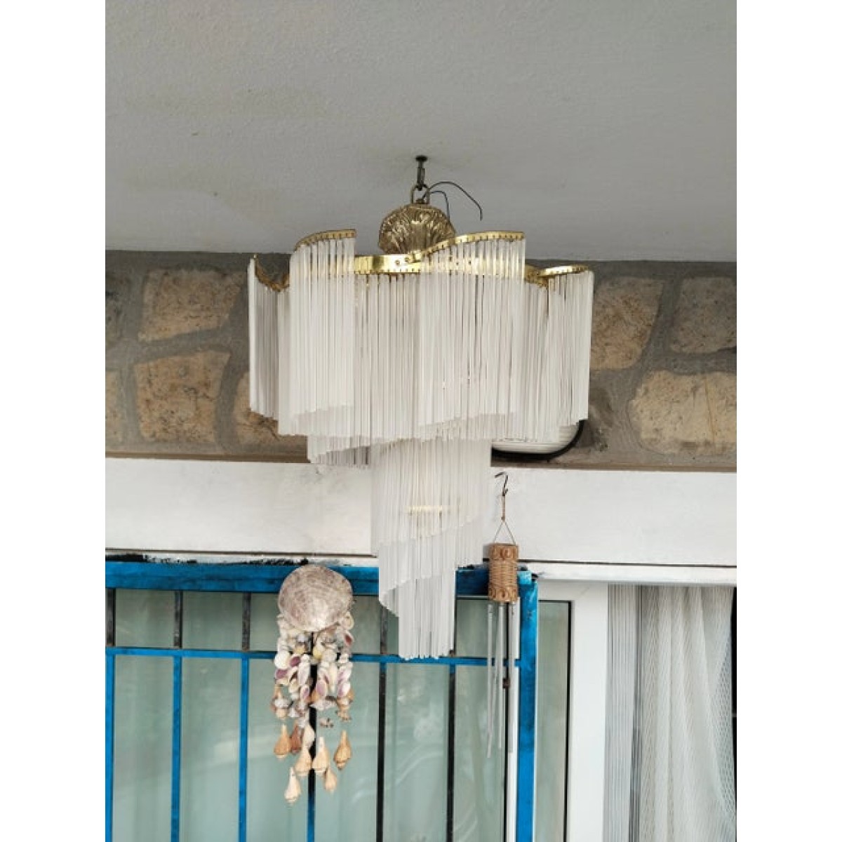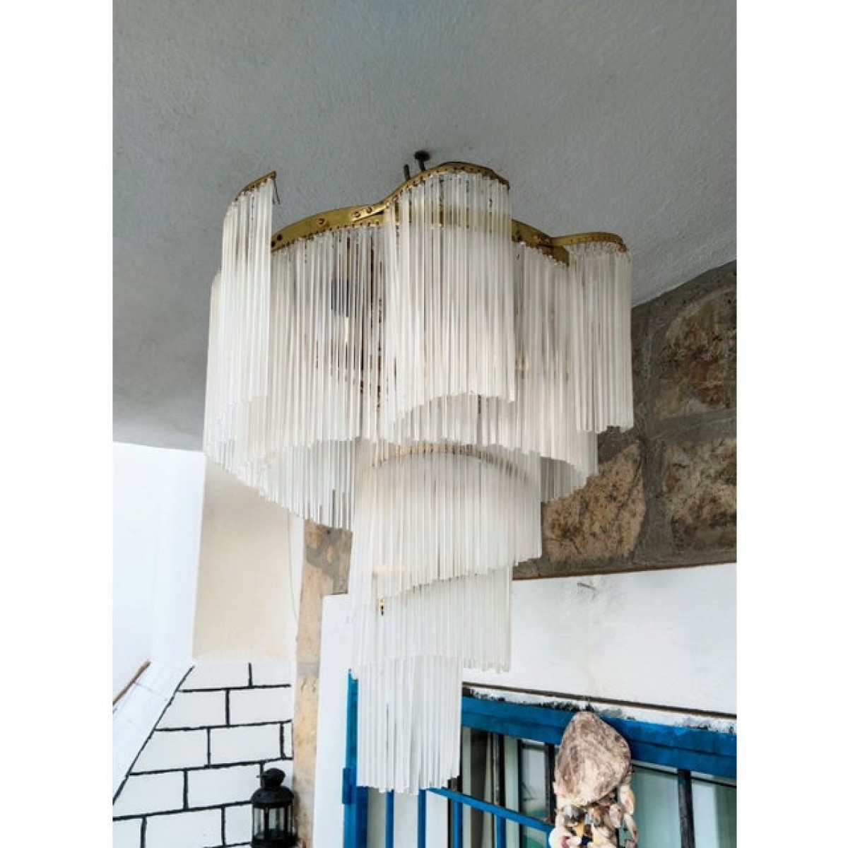 Vintage Art Deco Retro 80s Ceiling Pendant Light Milk Glass Stick Chandelier Dining Room Table Lamps Hallway Bathroom Home Ligting. Chandelier has 4 lambs. Lighting capacity depend on your prefered lamps. Restorated and renewed all cables. Will added extra Glass Sticks. Chandelier has 4 E27 bulbs. Useful 110 volts or 240 volts. It's hight with canopy 24'' with stones width 18".