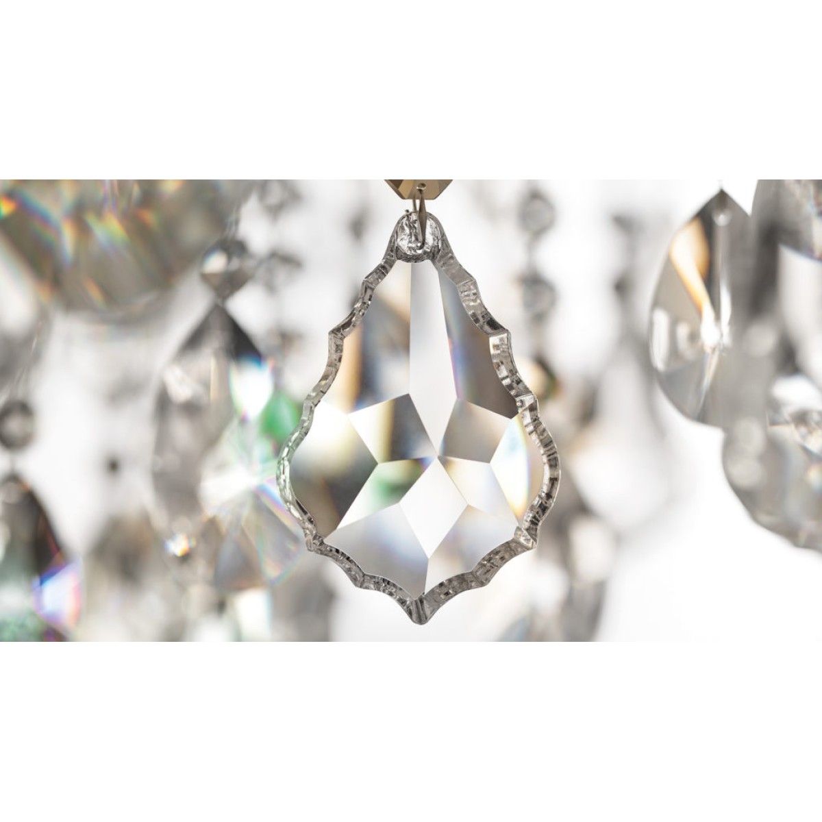 Galvanised metal frame with arms covered in clear glass. Clear glass or clear crystal pendants. Traditional or integrated LED lighting.