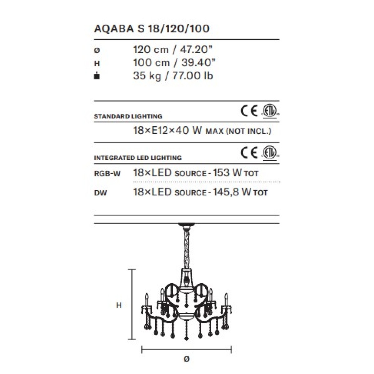 Bulbs: Traditional: 18XE14X10W Max, LED RGB-W: 18XLED SOURCE 153W TOT, LED DW: 18XLED SOURCE 145, 8W TOT (included)