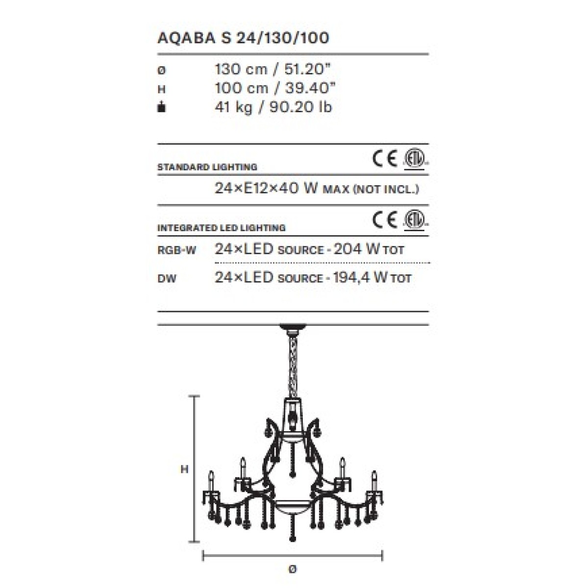 Bulbs: Traditional: 24XE14X10W Max, LED RGB-W: 24XLED SOURCE 204W TOT, LED DW: 24XLED SOURCE 194, 4W TOT (included)