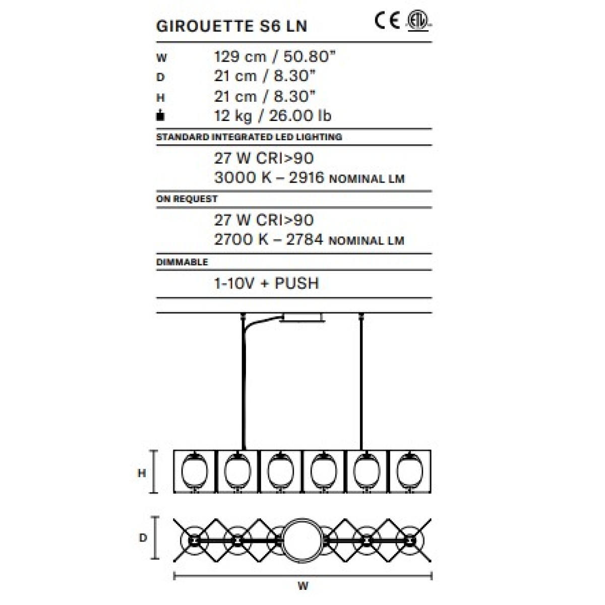 Bulbs: LED 3000k: 27W CRI>90 3000K-2916 Nominal LM, LED 2700k: 27W CRI>90 2700K-2784 Nominal LM, Dimming control LED: 1-10V + Push (included)