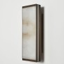 The AURORA VEIL wall sconce was conceived with the idea of merging the luminaire with the lampshade into a single element, playing on the transparencies of the light through the ultra-thin onyx encased in a satin brass frame with a simple linear rectangular shape that further enhance the beauty of natural stone.