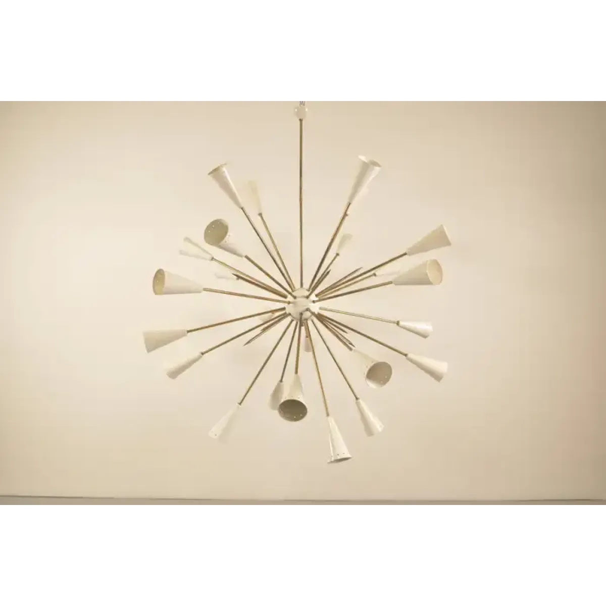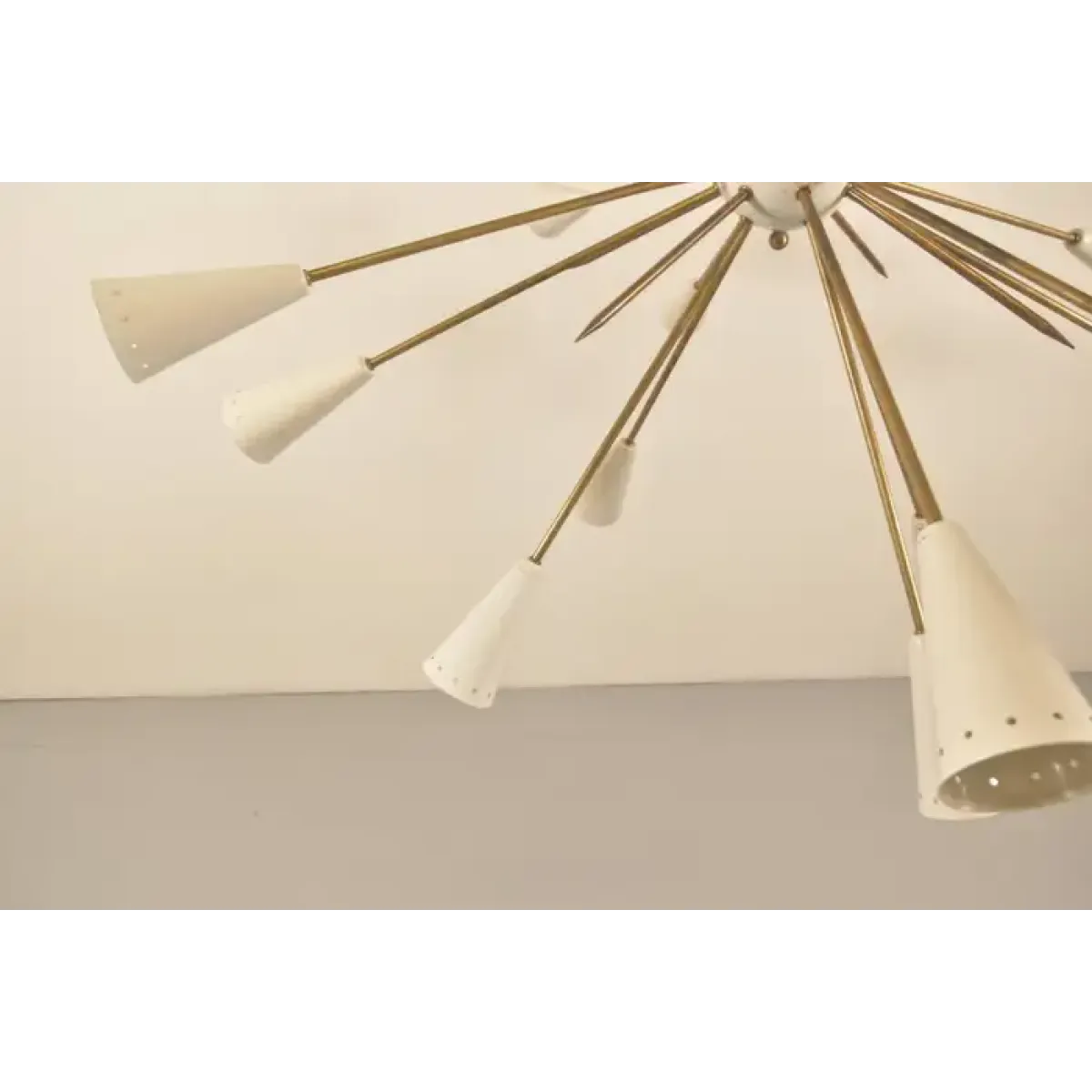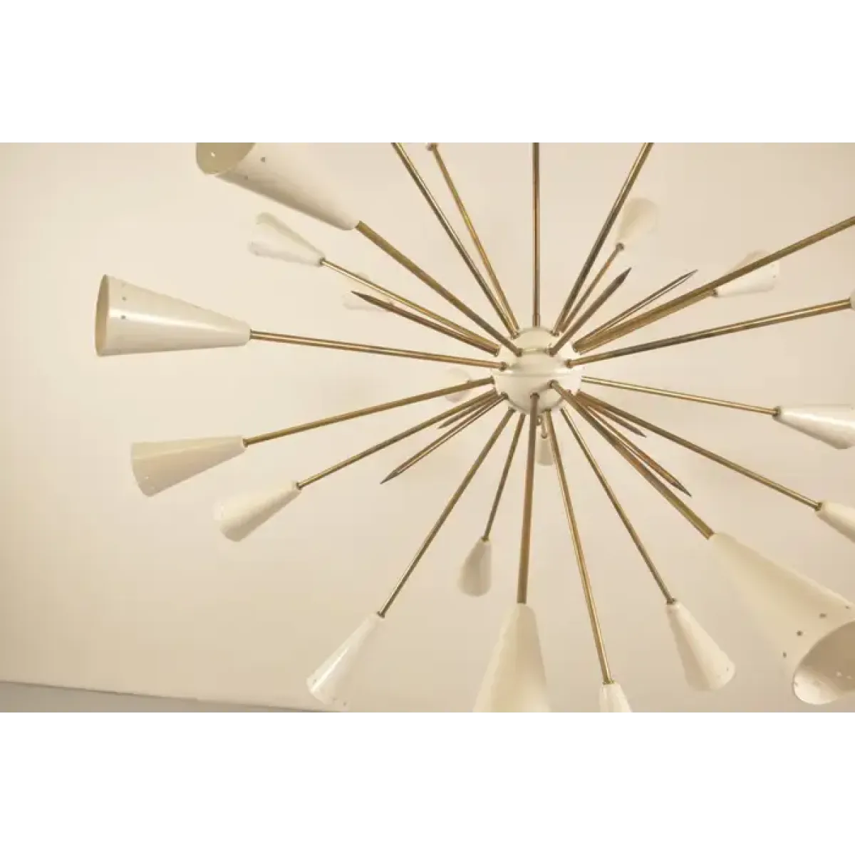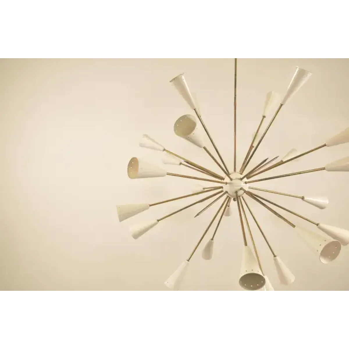 This image shows a mid-century modern chandelier, specifically a Sputnik-style light fixture. Named after the Soviet satellite launched in 1957, Sputnik chandeliers are known for their starburst design, which resembles an explosion or celestial body.