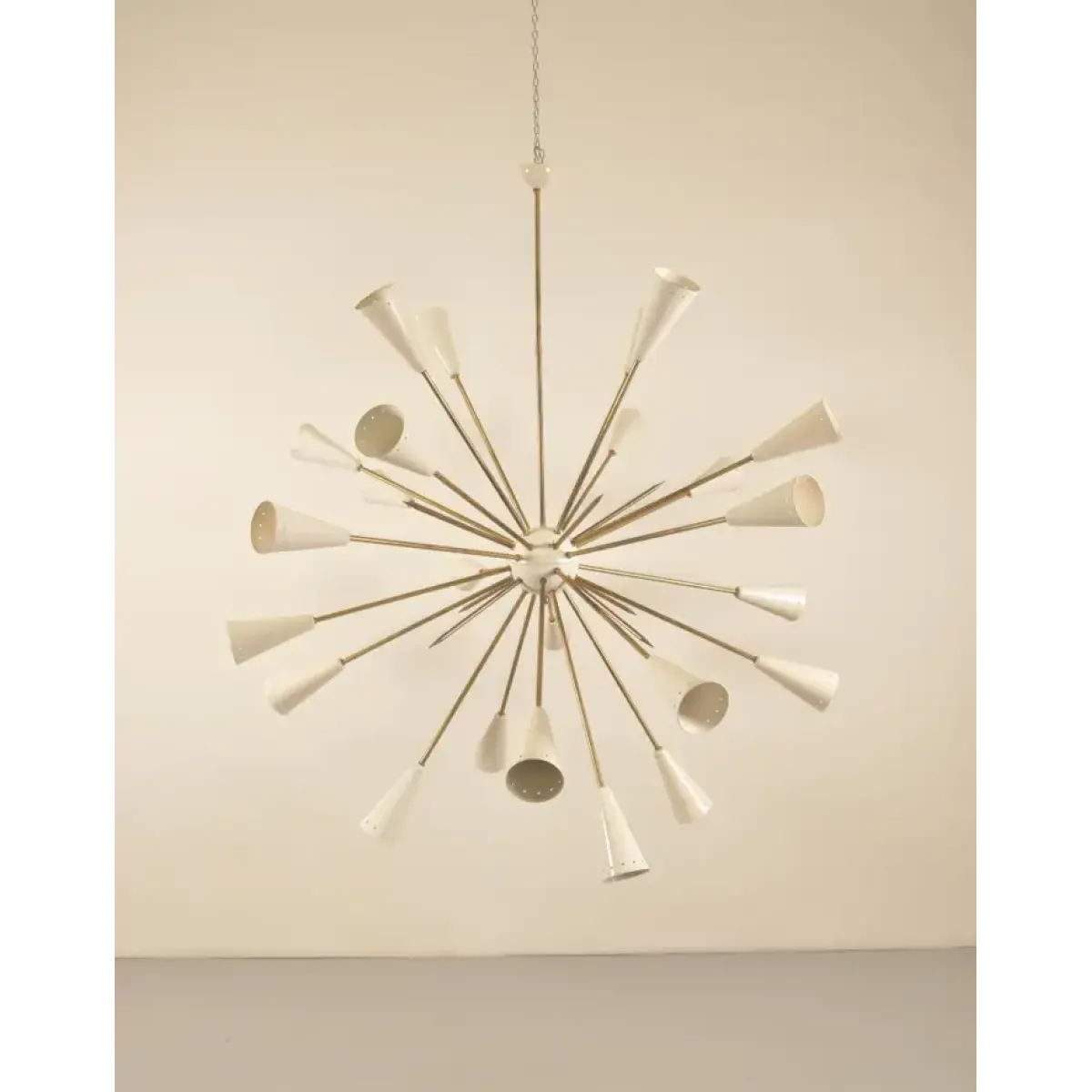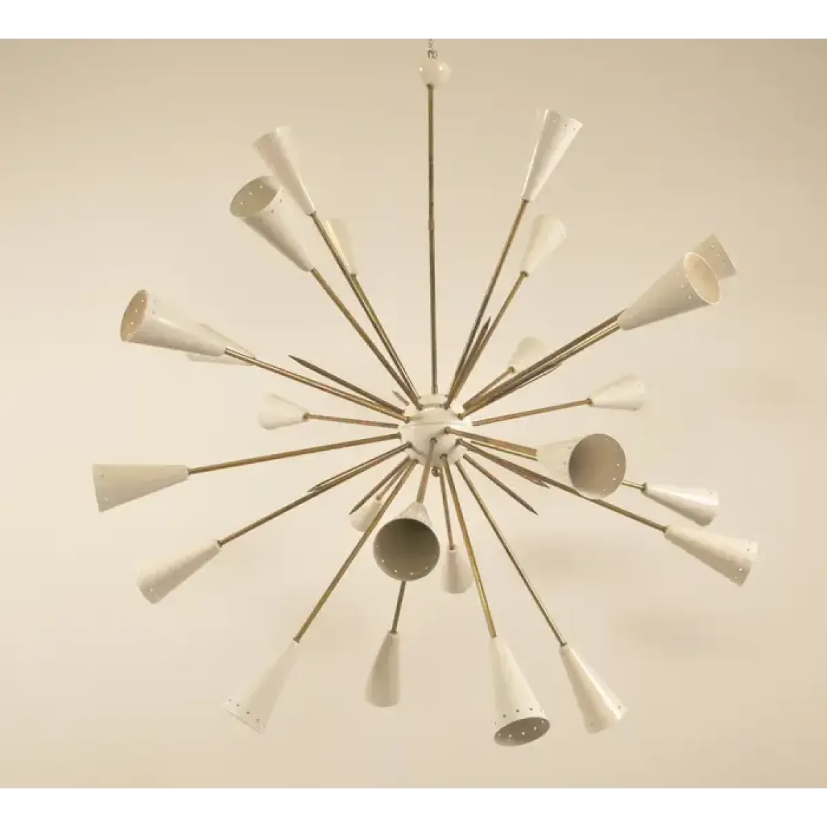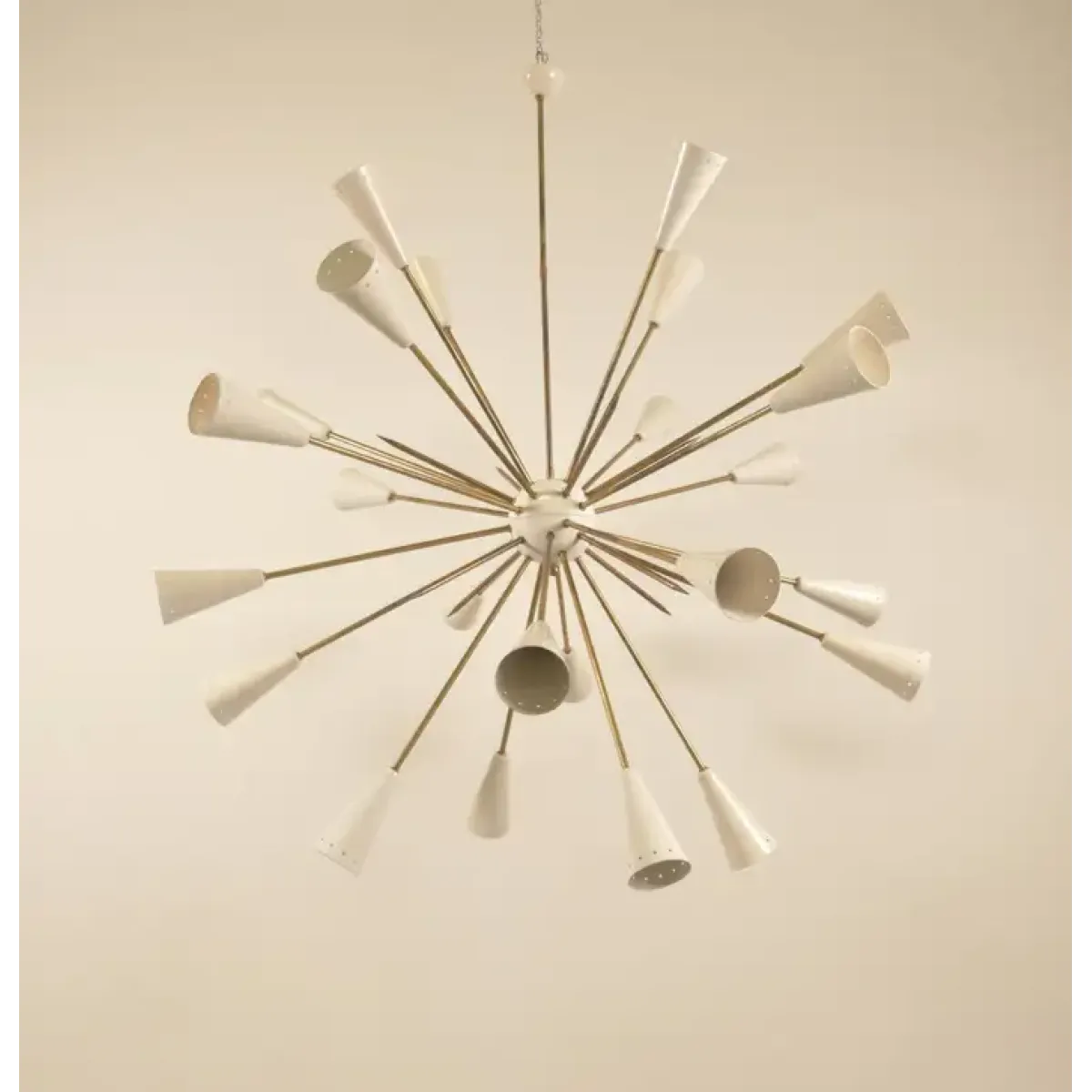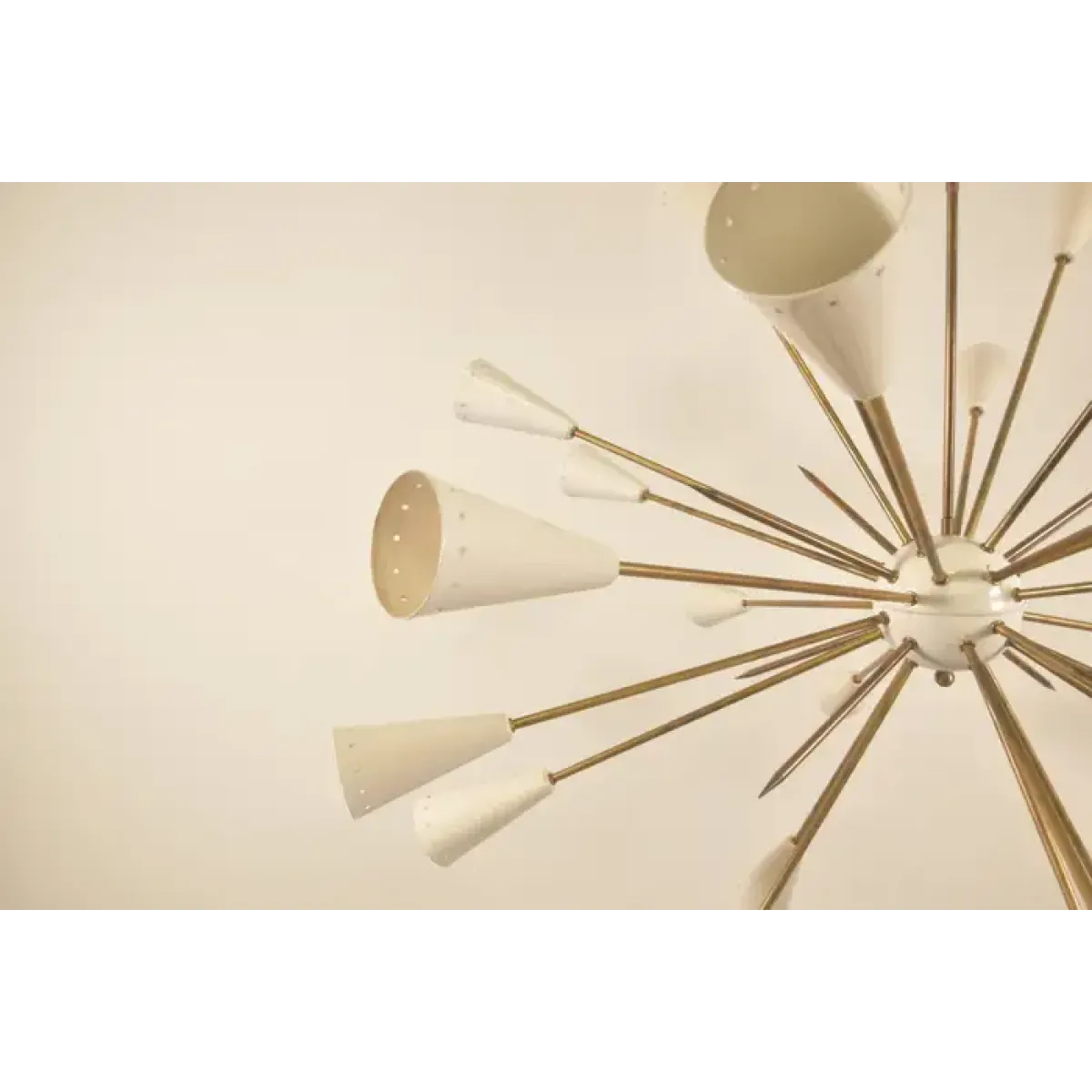 This image shows a mid-century modern chandelier, specifically a Sputnik-style light fixture. Named after the Soviet satellite launched in 1957, Sputnik chandeliers are known for their starburst design, which resembles an explosion or celestial body.